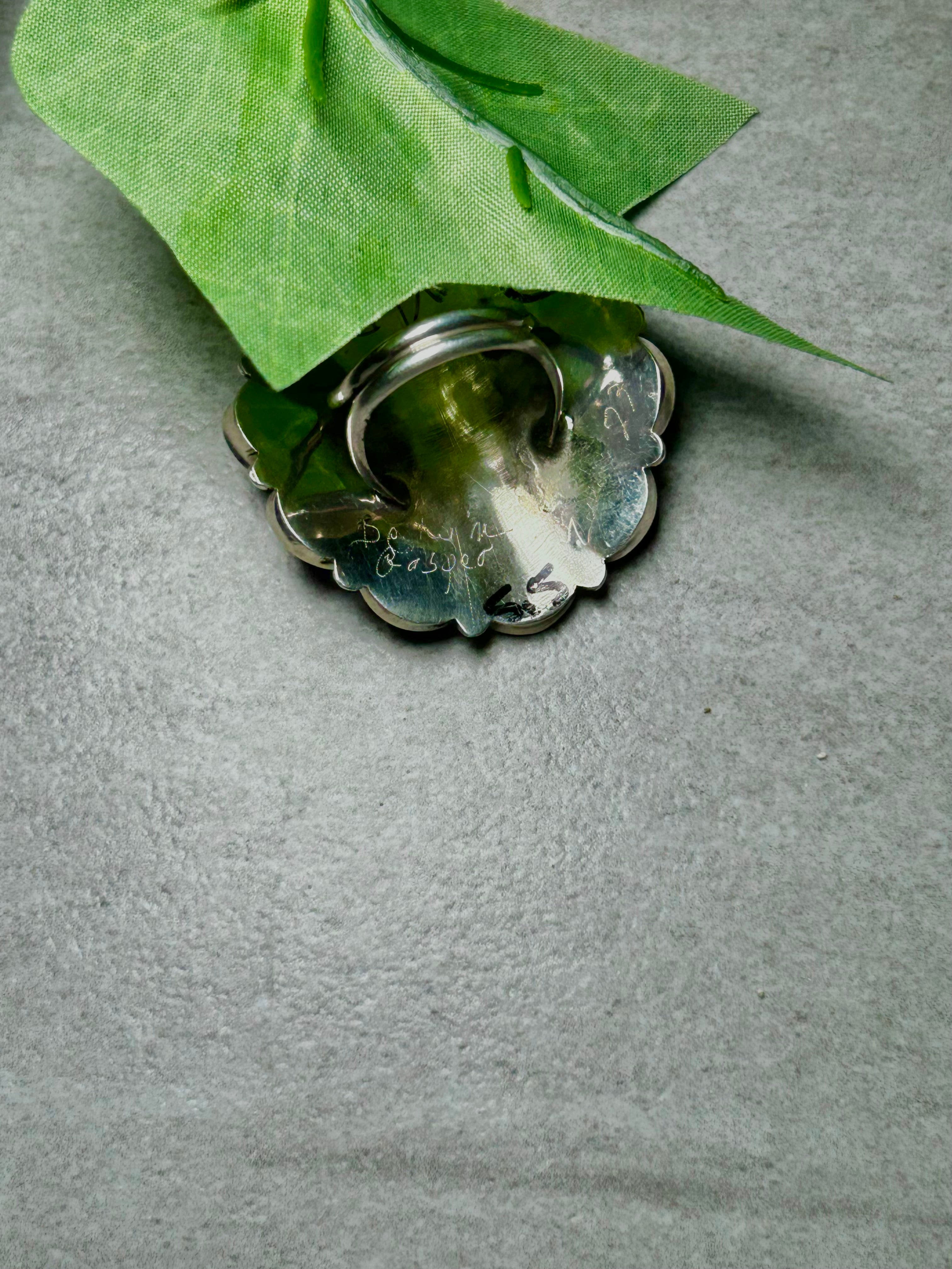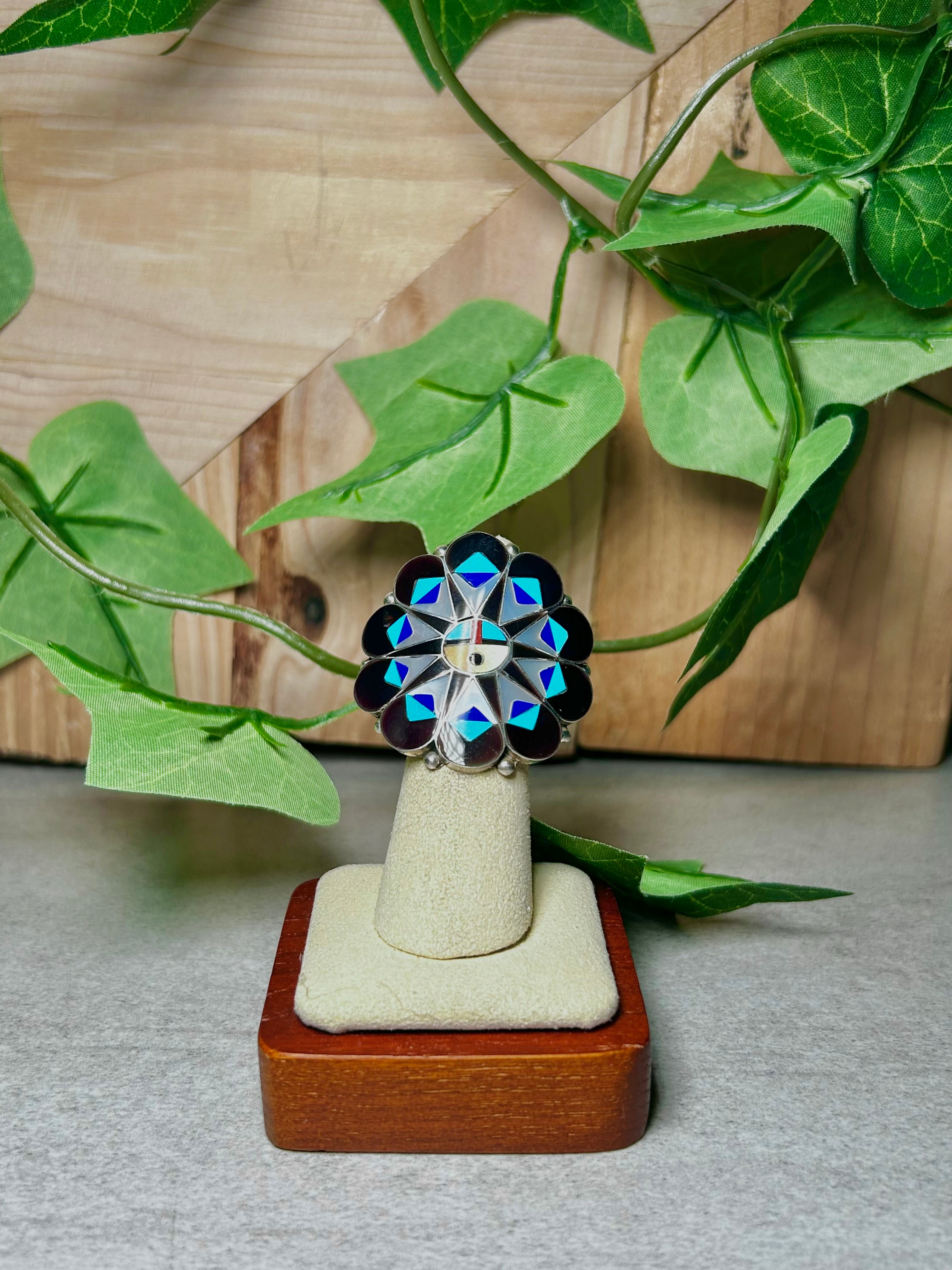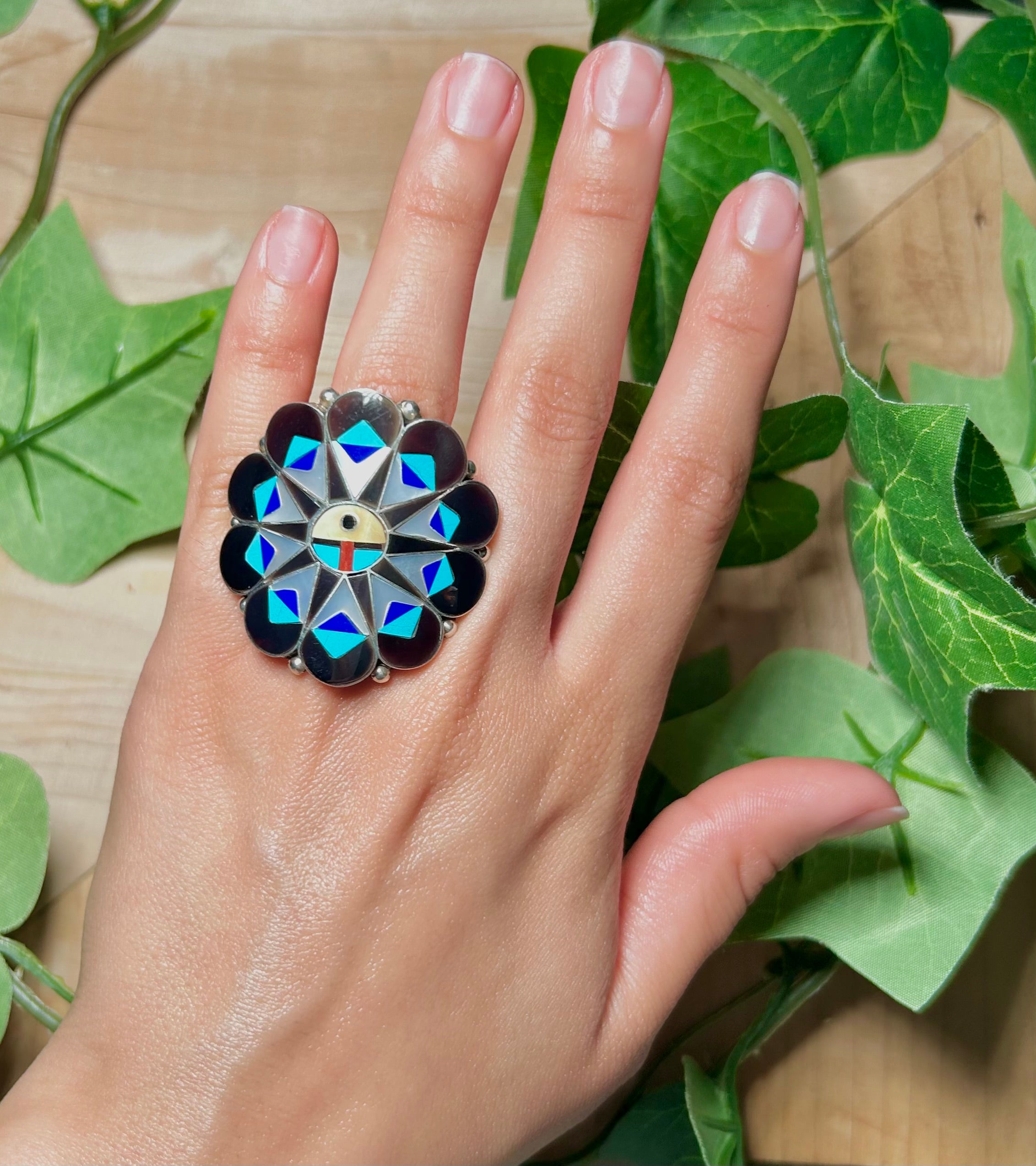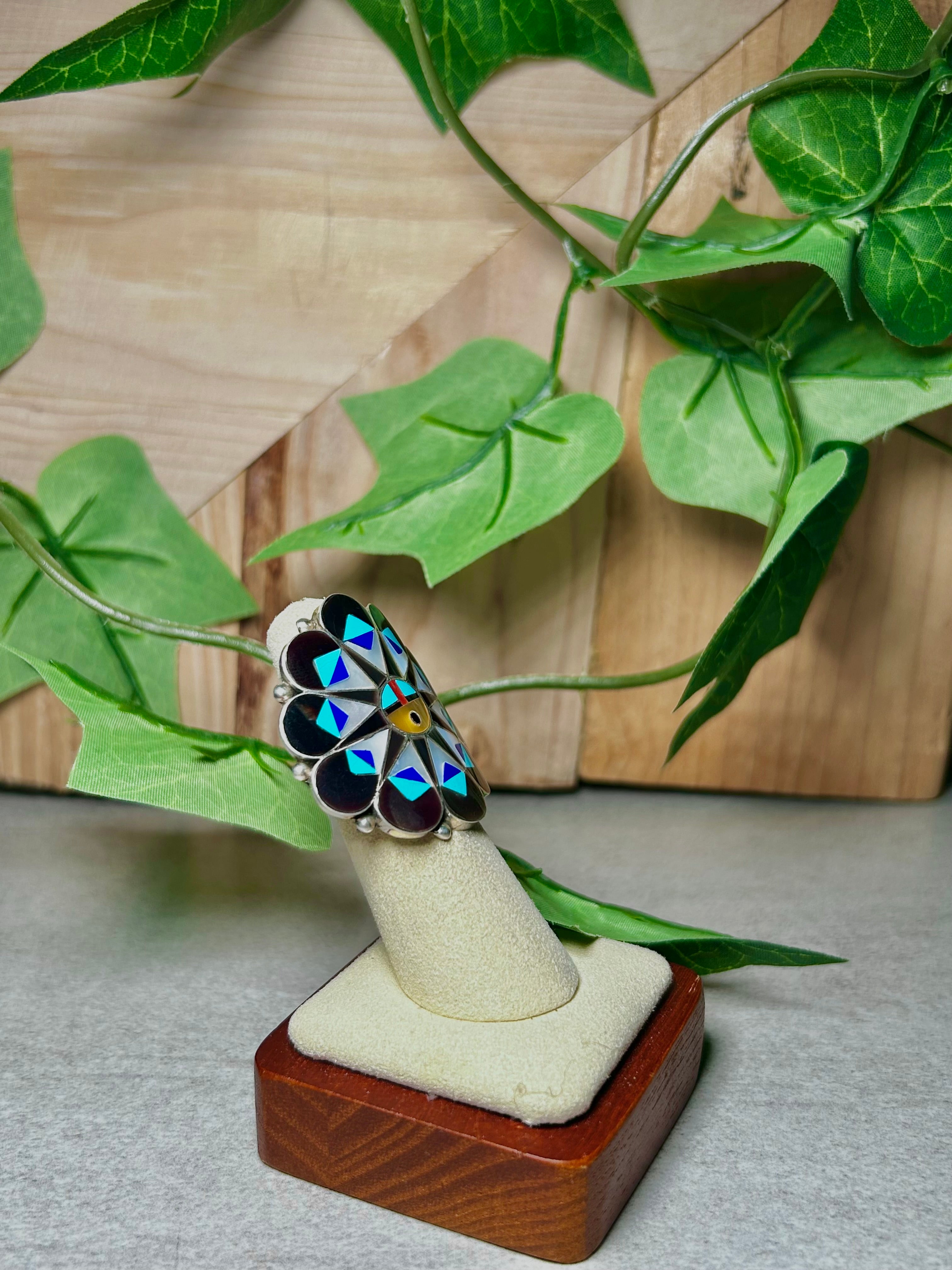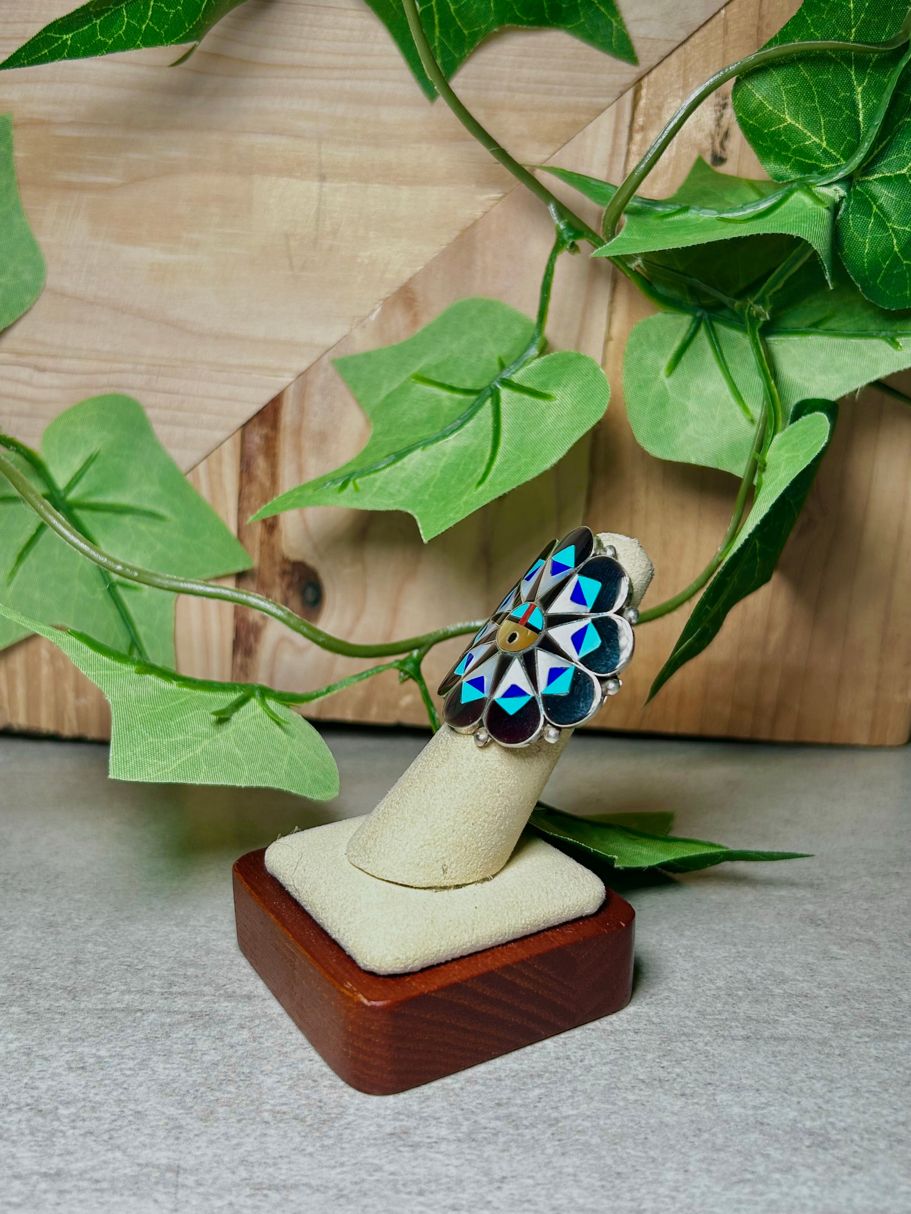 Zuni Multi Stone Inlay & Sterling Silver Ring Size 5.5. It measures 1 1/2 inches long and 1 1/2 inches wide. Signed by the artist and stamped sterling silver.