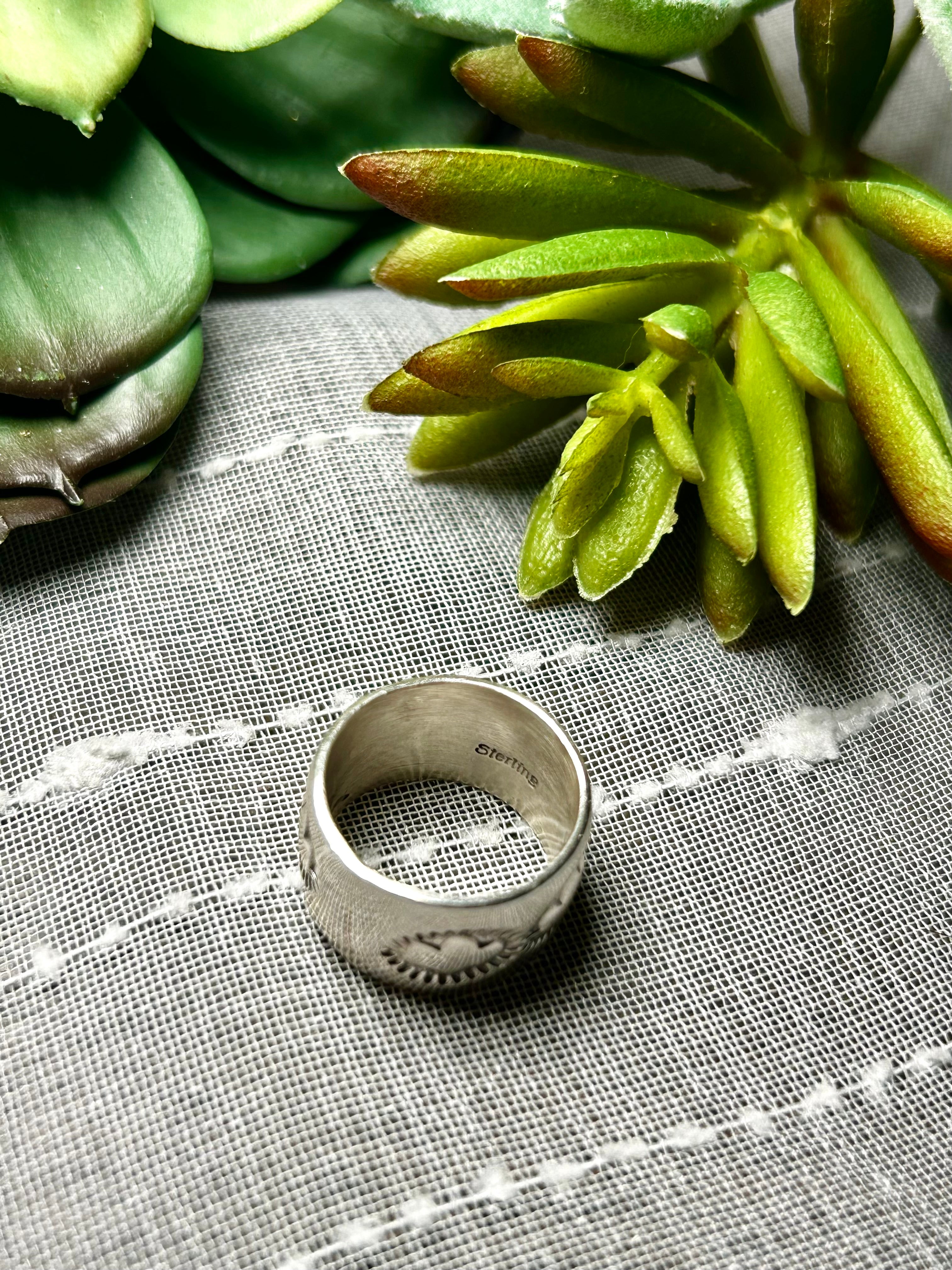 Navajo Made Sterling Silver Ring Size 4.5. It measures 1/2 of an inch wide. Signed by the artist and stamped sterling silver.