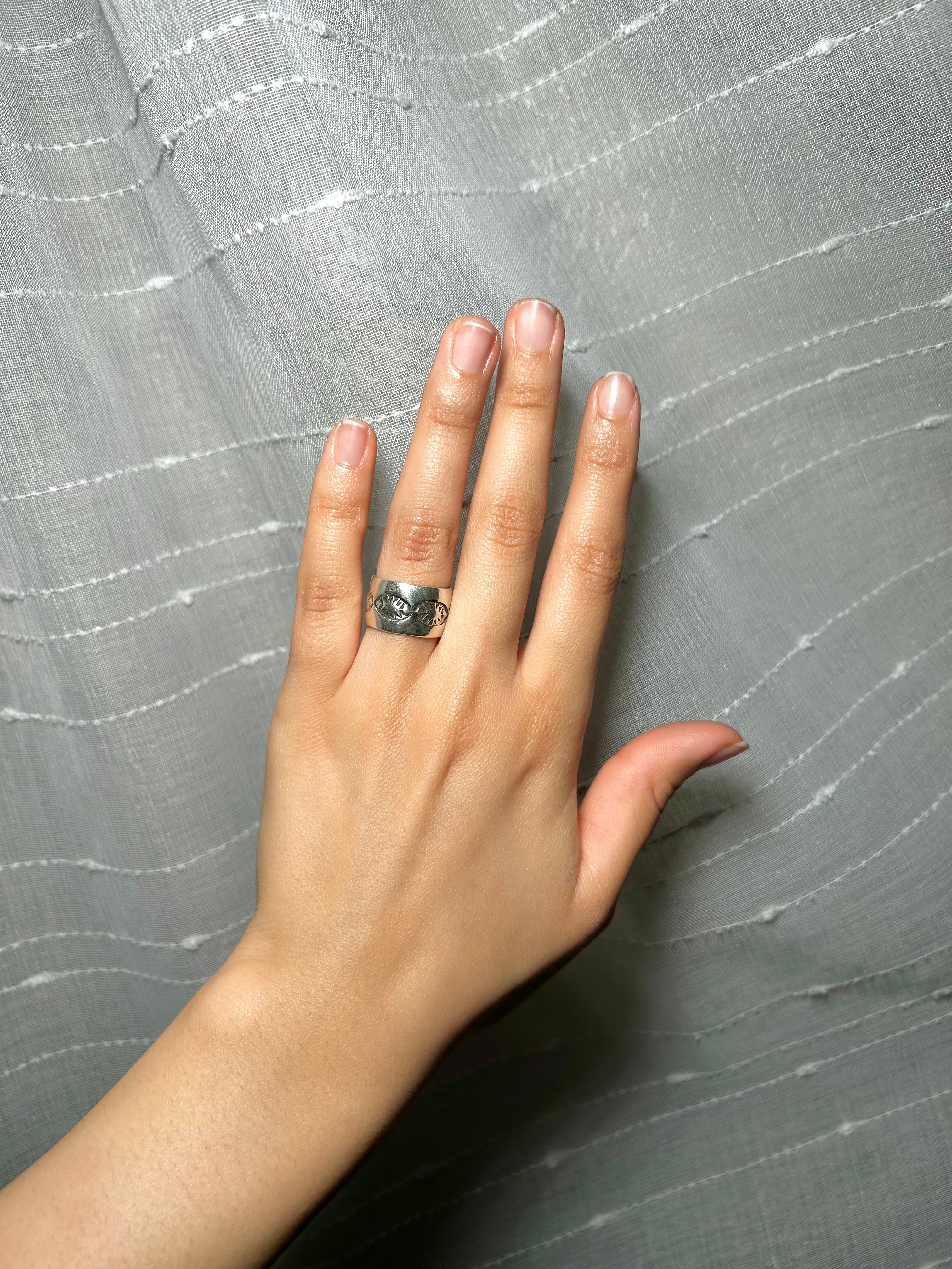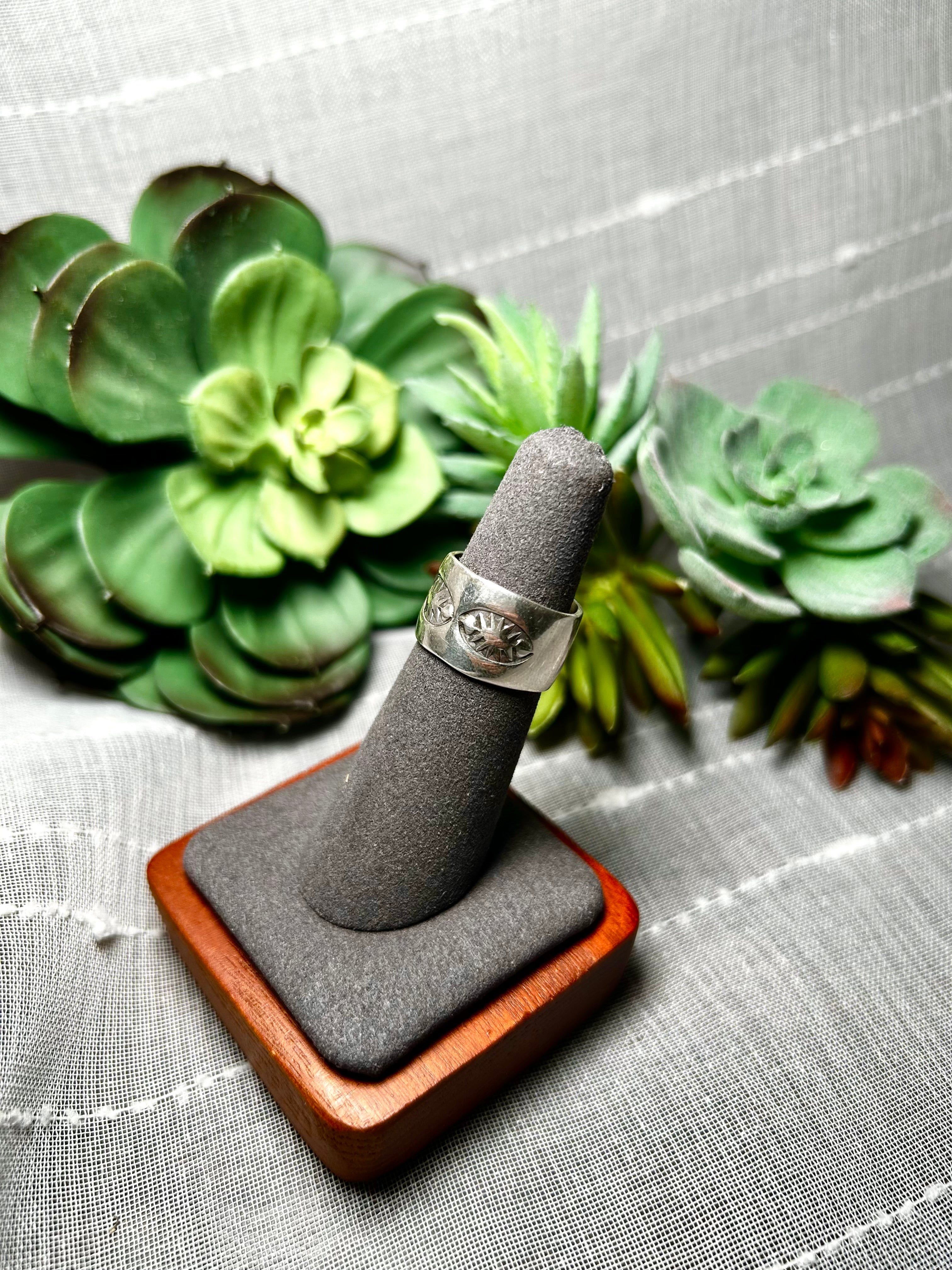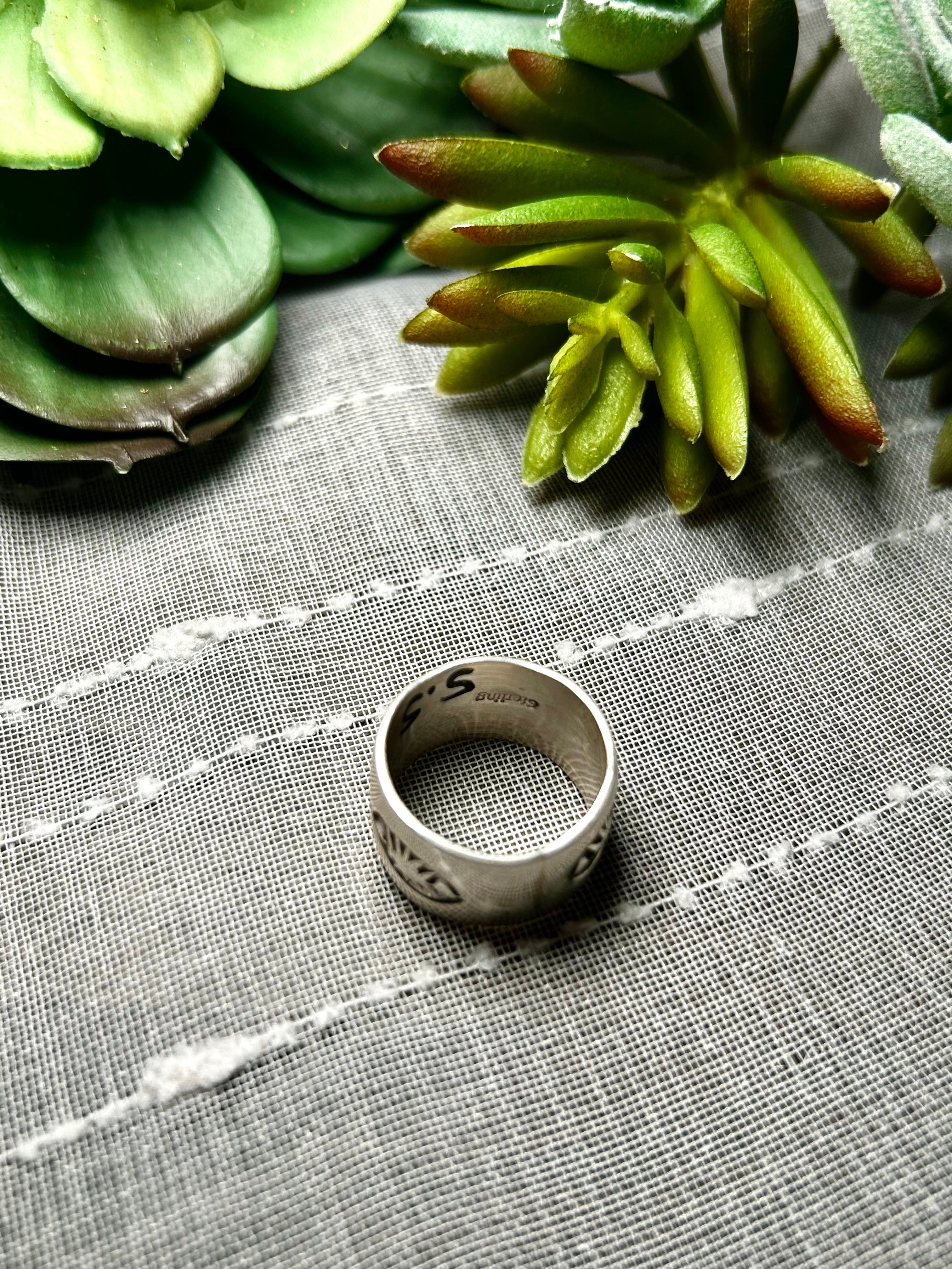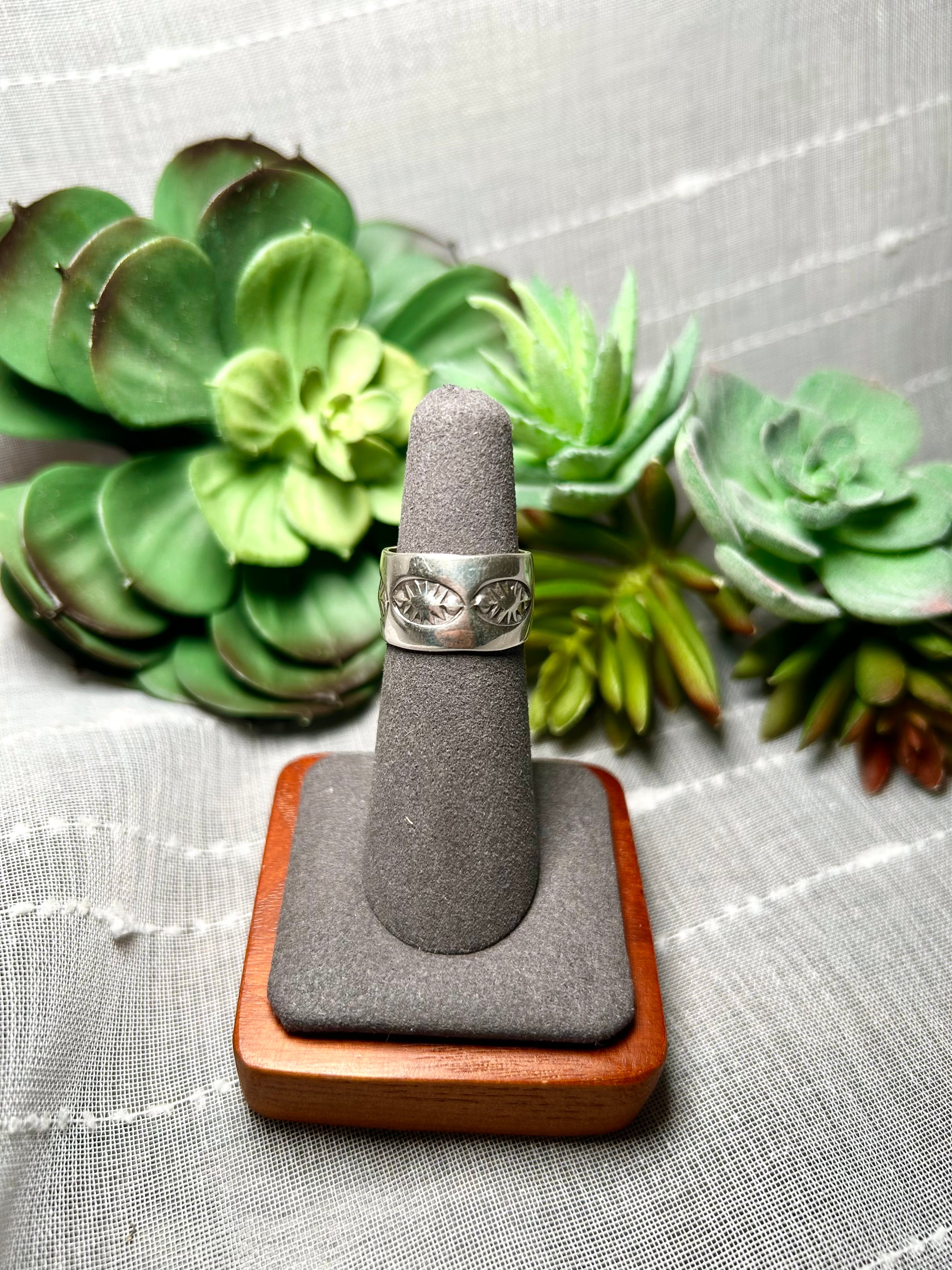 Navajo Made Sterling Silver Ring Size 5.75. It measures 1/2 of an inch wide. Signed by the artist and stamped sterling silver.
