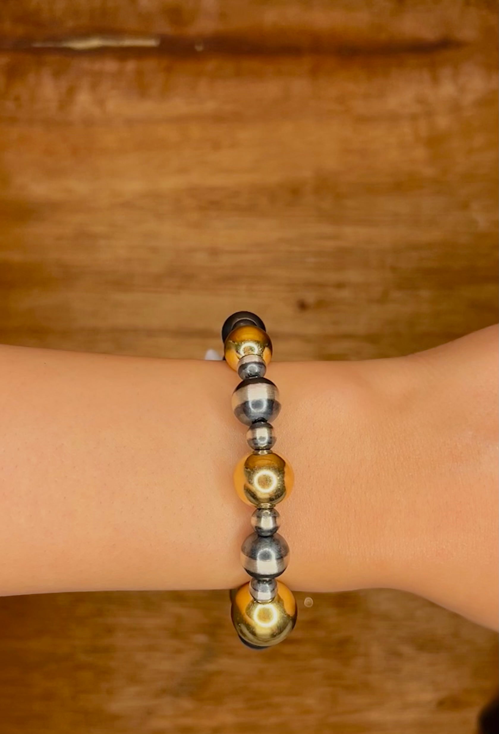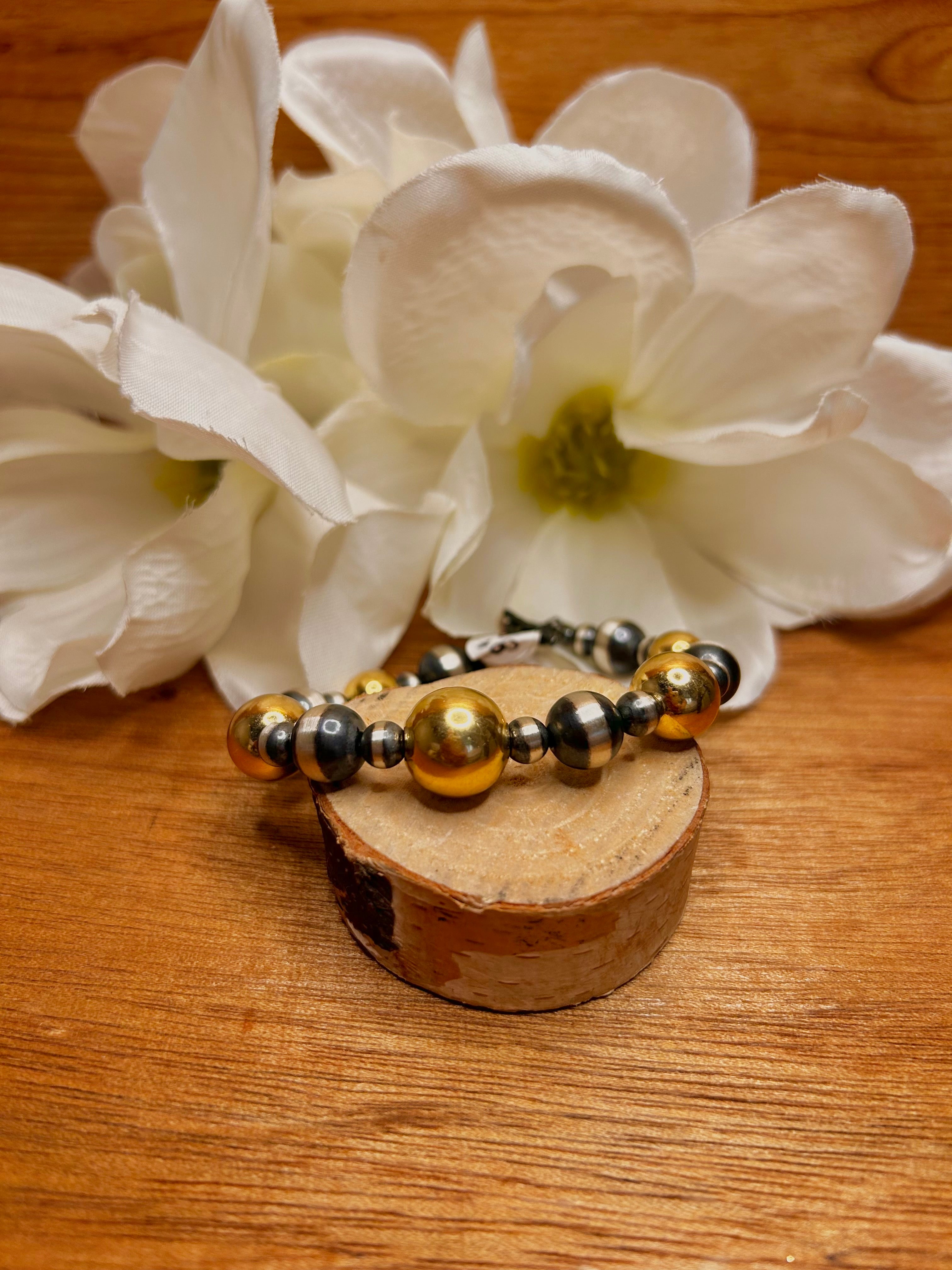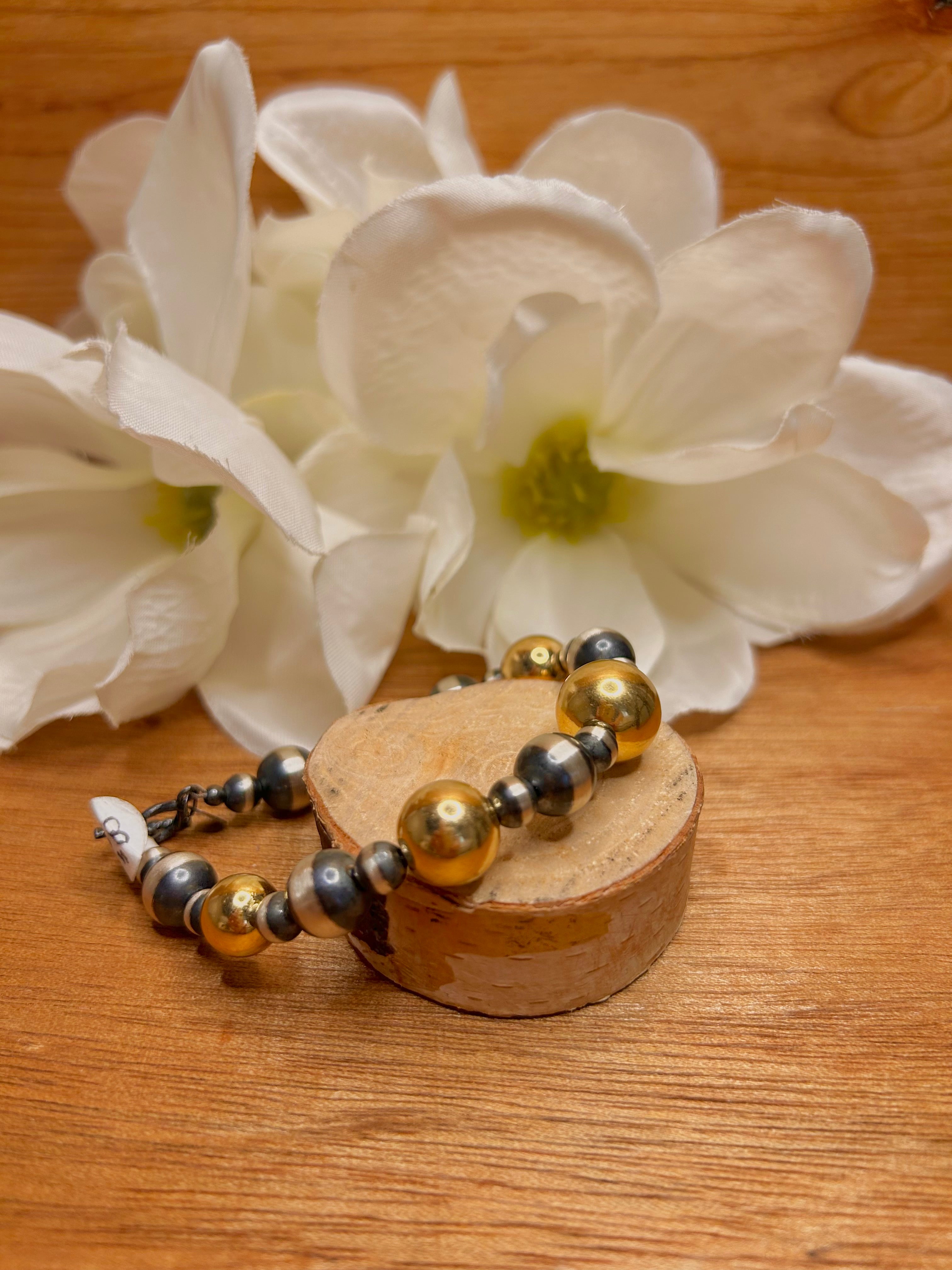 Navajo Made Strung 14k Gold Coat & Sterling Silver Pearl Bracelet. It measures 8 inches wide and 5/8 of an inch long.