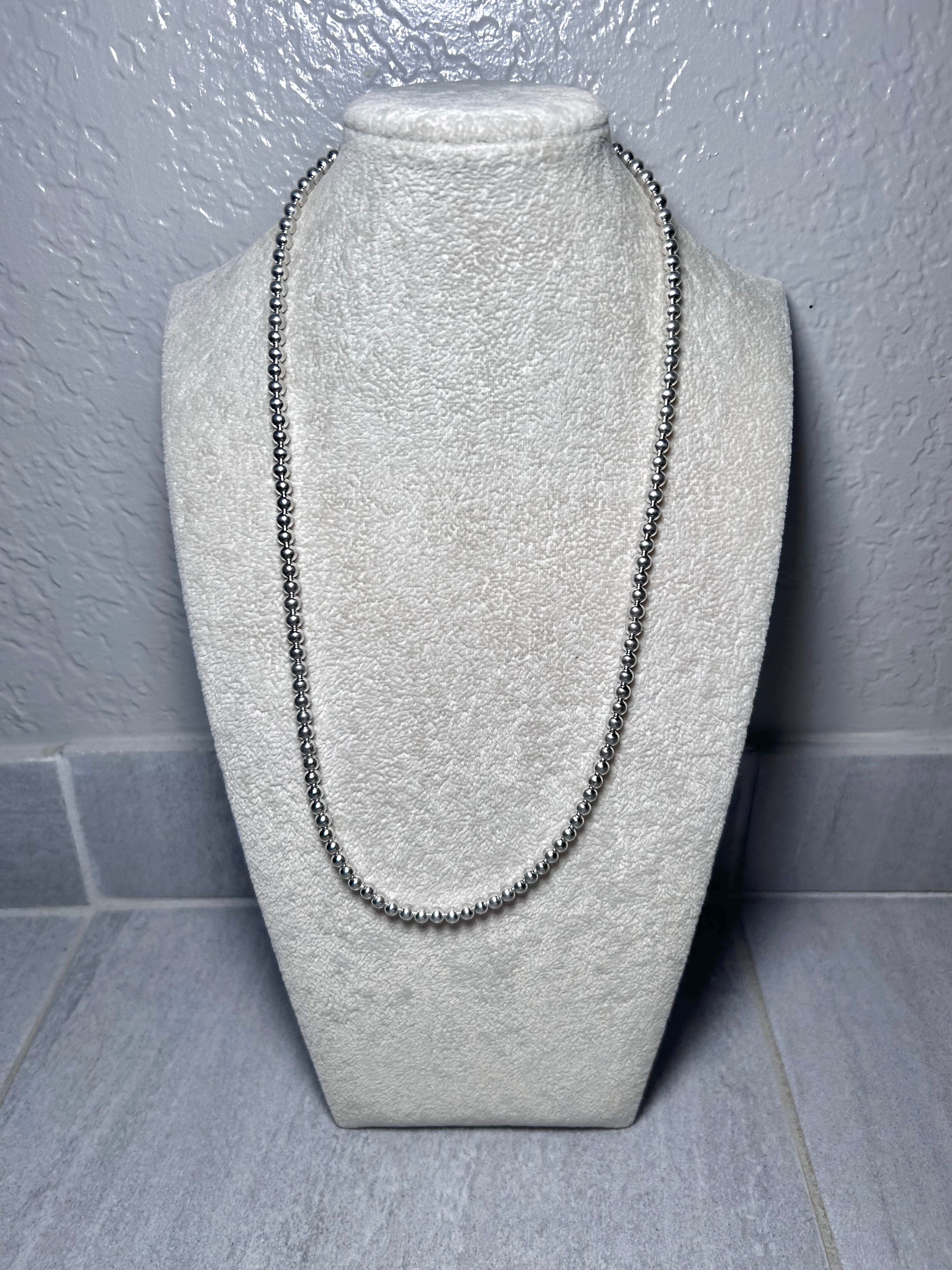 Navajo Made Strung 5 MM Sterling Silver Necklace. It measures 24 inches long. Signed by the artist and stamped sterling silver.