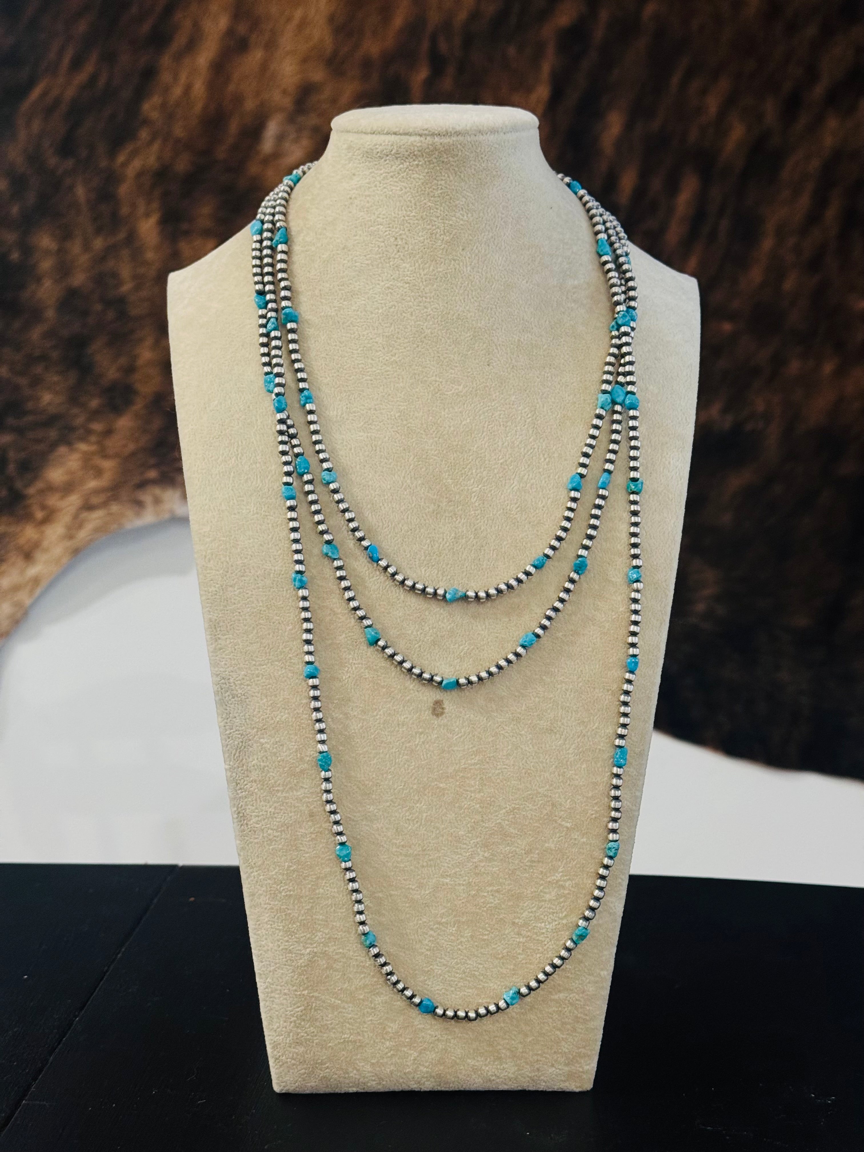 Navajo Made Strung Kingman Turquoise & Sterling Silver Necklace. It measures 72 inches long. Signed by the artist and stamped sterling silver.