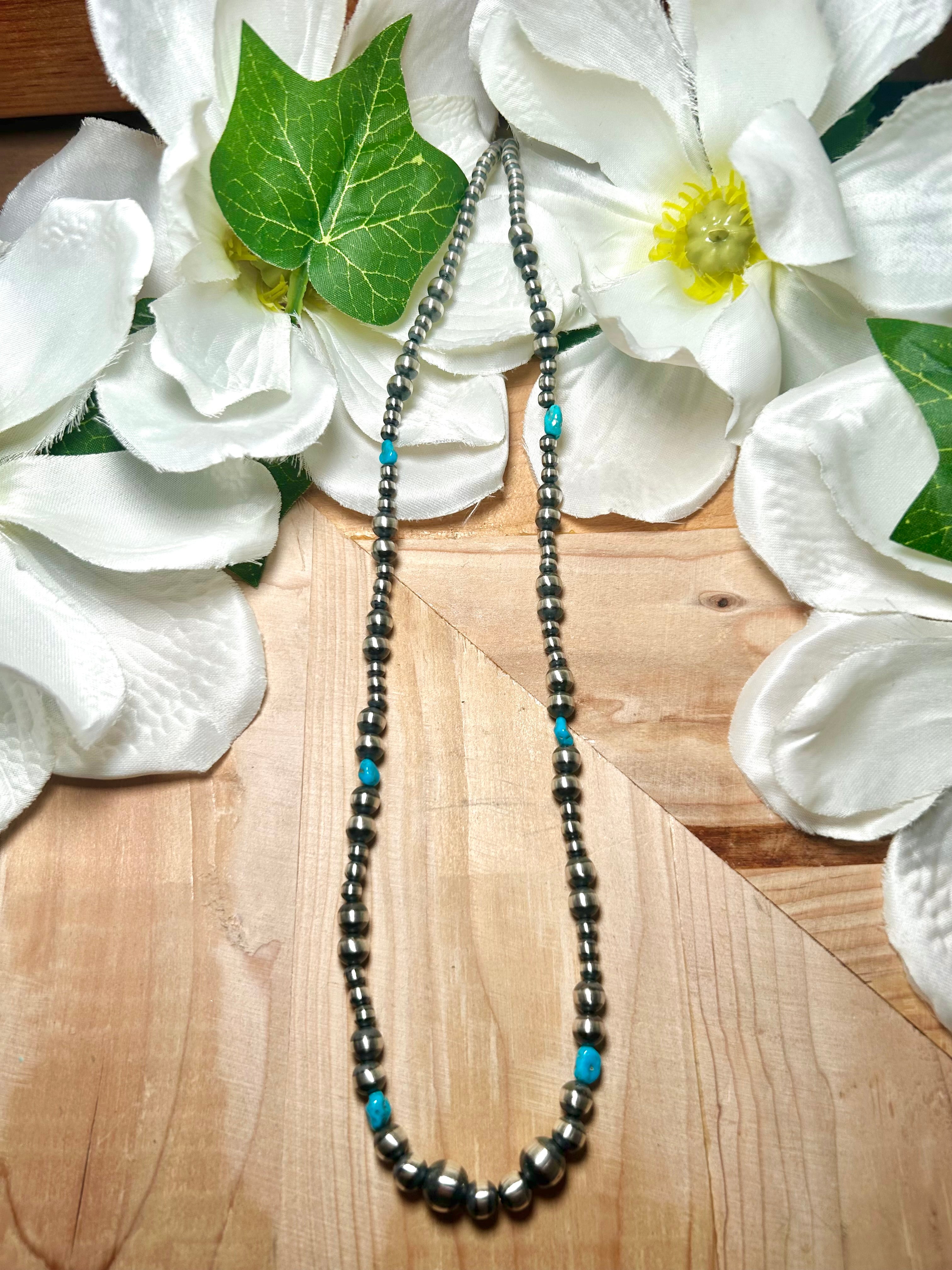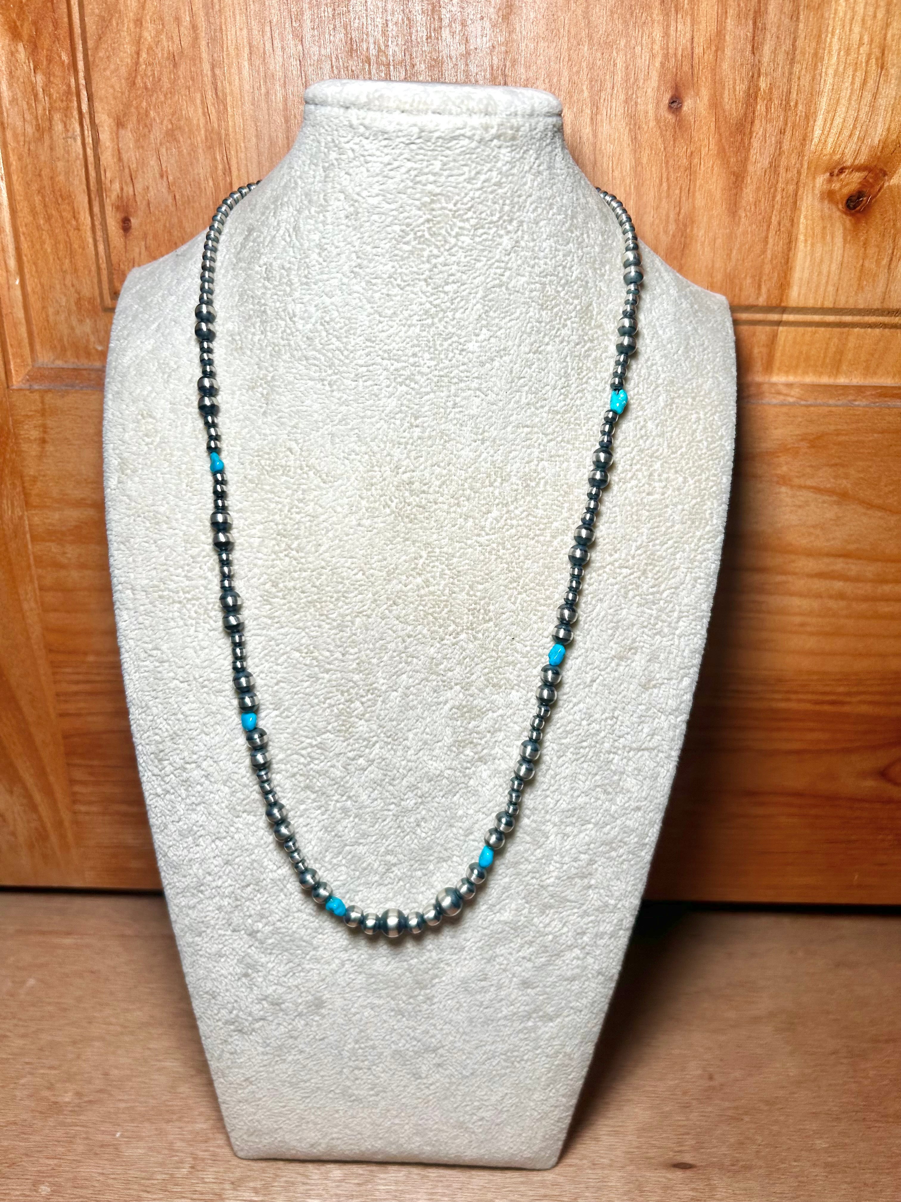 Navajo Made Strung Kingman Turquoise & Sterling Silver Necklace. It measures 24 inches long. Signed by the artist and stamped sterling silver.