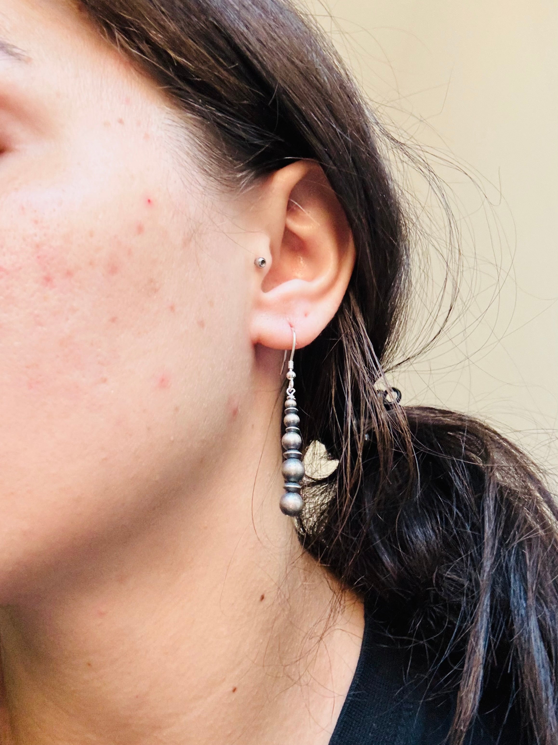 Navajo Strung Sterling Silver Graduated Dangle Pearl Earrings. It measures 2 inches long.
