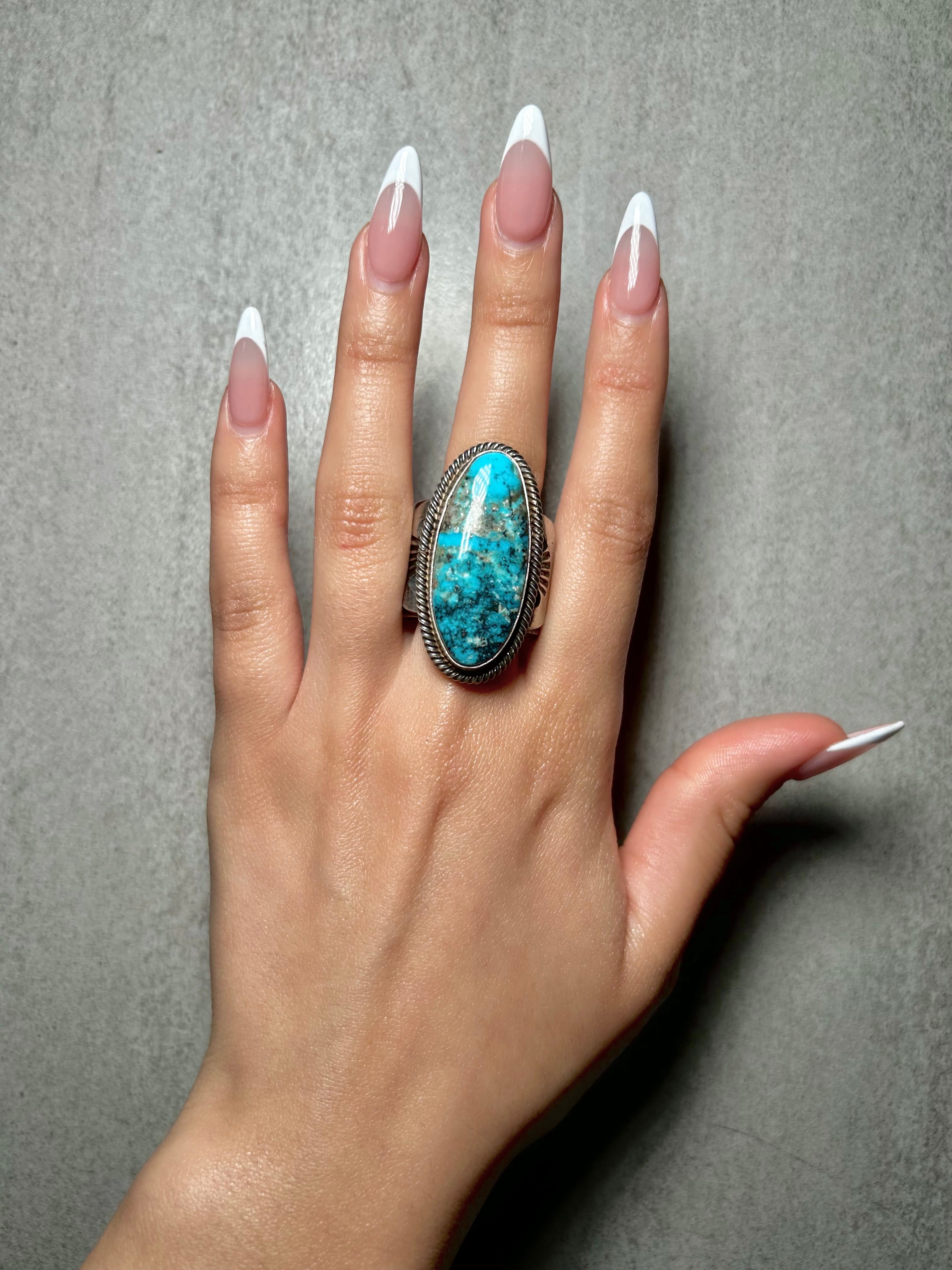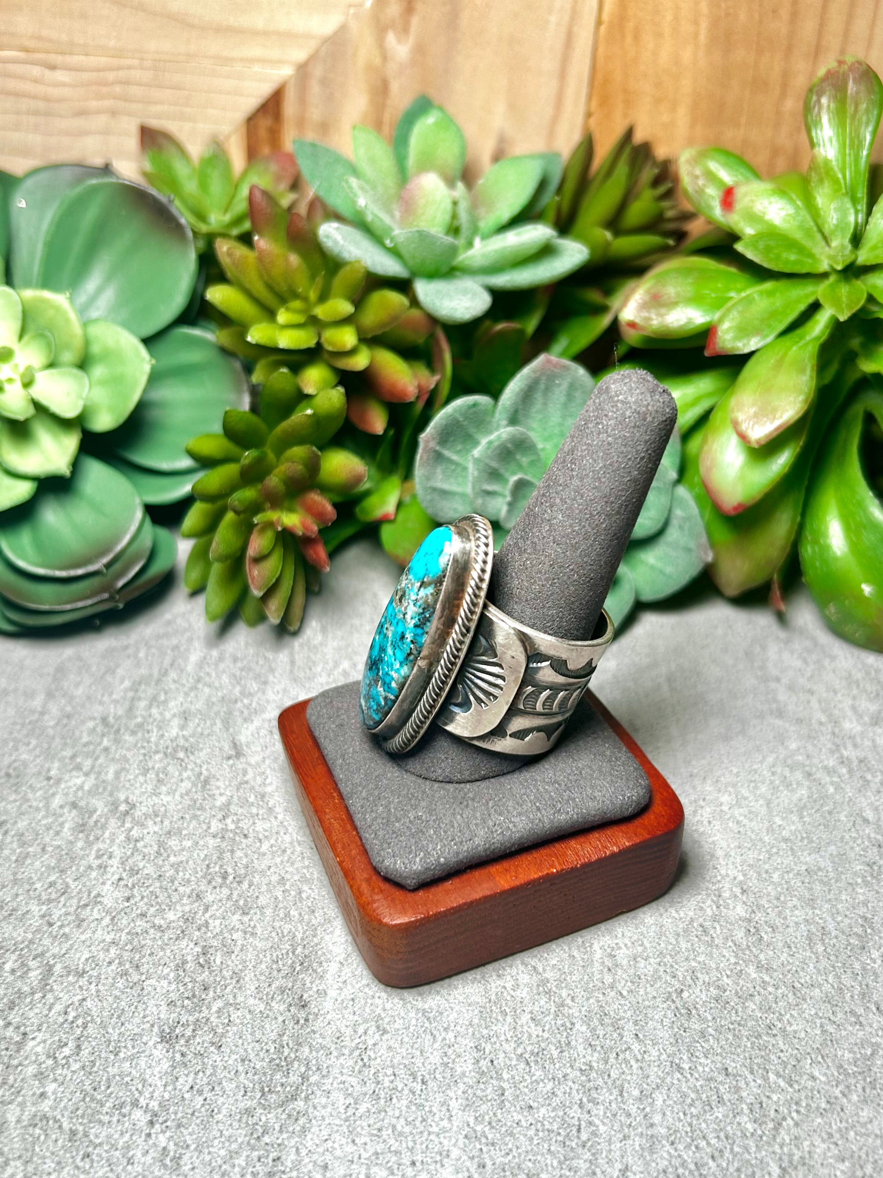 Navajo Made Thunder Mountain Turquoise & Sterling Silver Ring Size 12.5. It measures 1 1/2 inches long and 3/4 of an inch wide. Signed by the artist and stamped sterling silver.