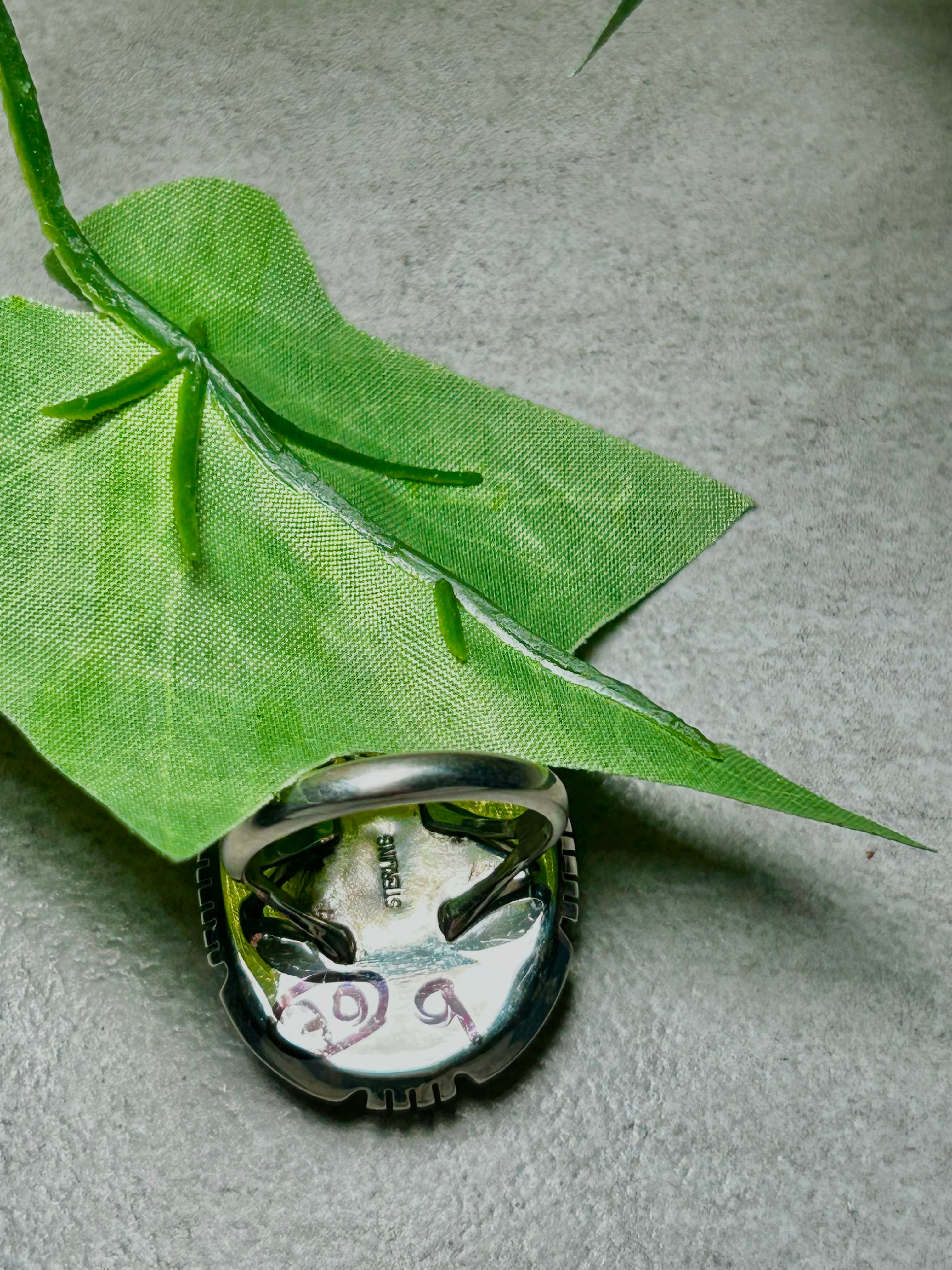 Navajo Made White Buffalo and Sterling Silver Ring Size 9. It measures 1 1/4 inches long and 1 1/8 inches wide. Signed by the artist and stamped sterling silver.