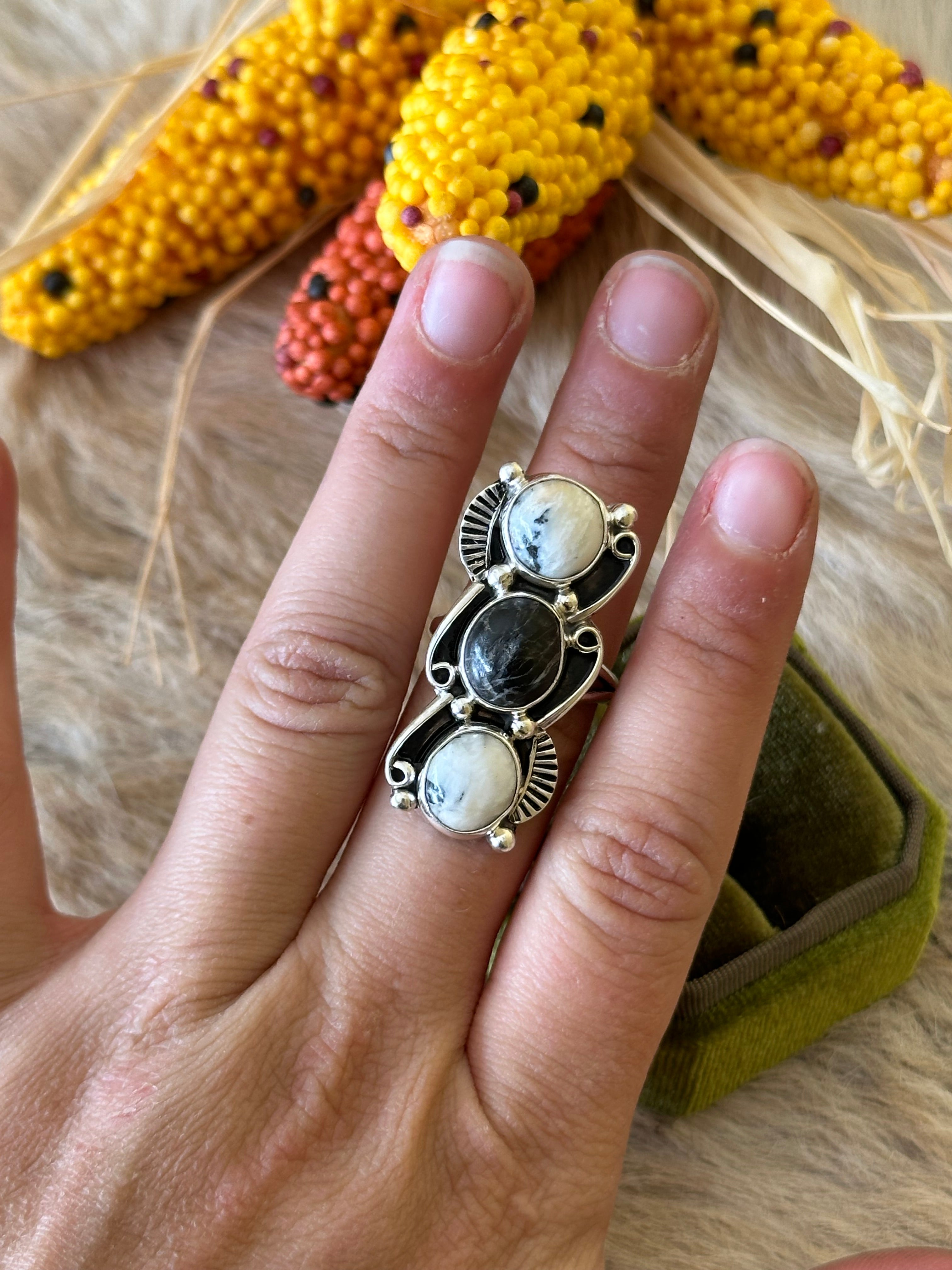 Beautiful rings Navajo Made White Buffalo & Sterling Silver Adjustable Ring Sitting on Size 7.25. It measures 1 1/2 inches long and 5/8 of an inch wide. Signed by the artist and stamped sterling silver.