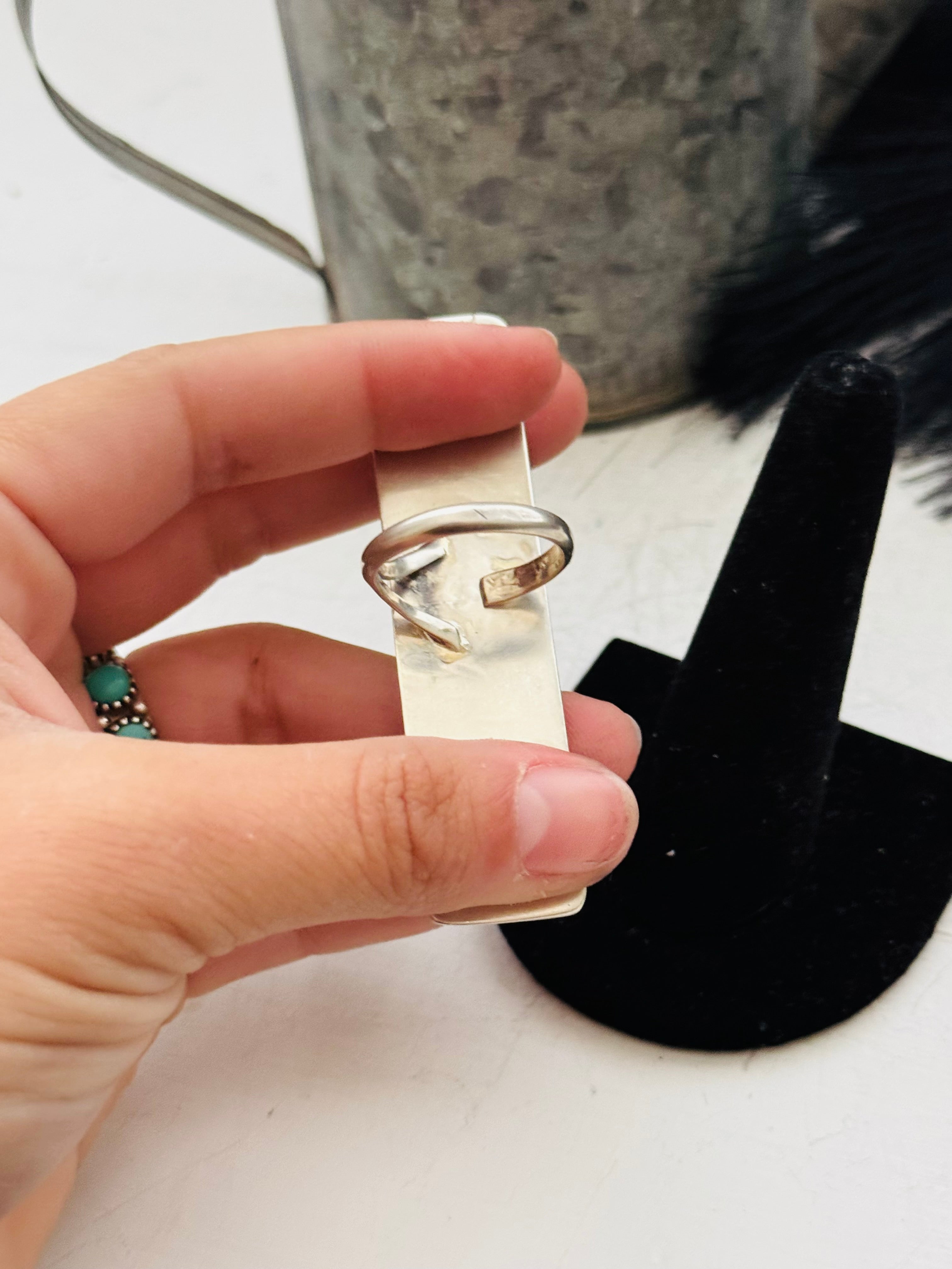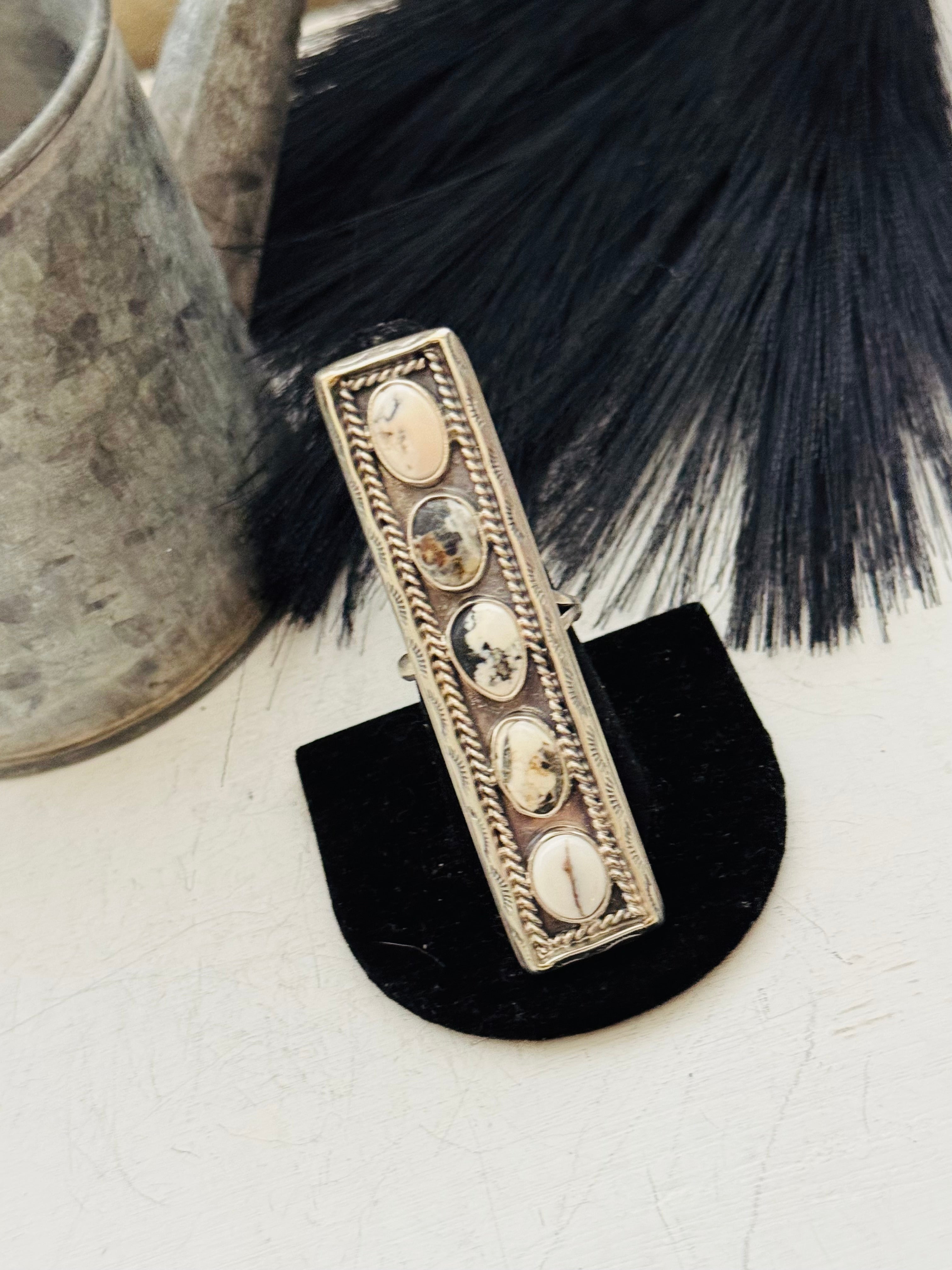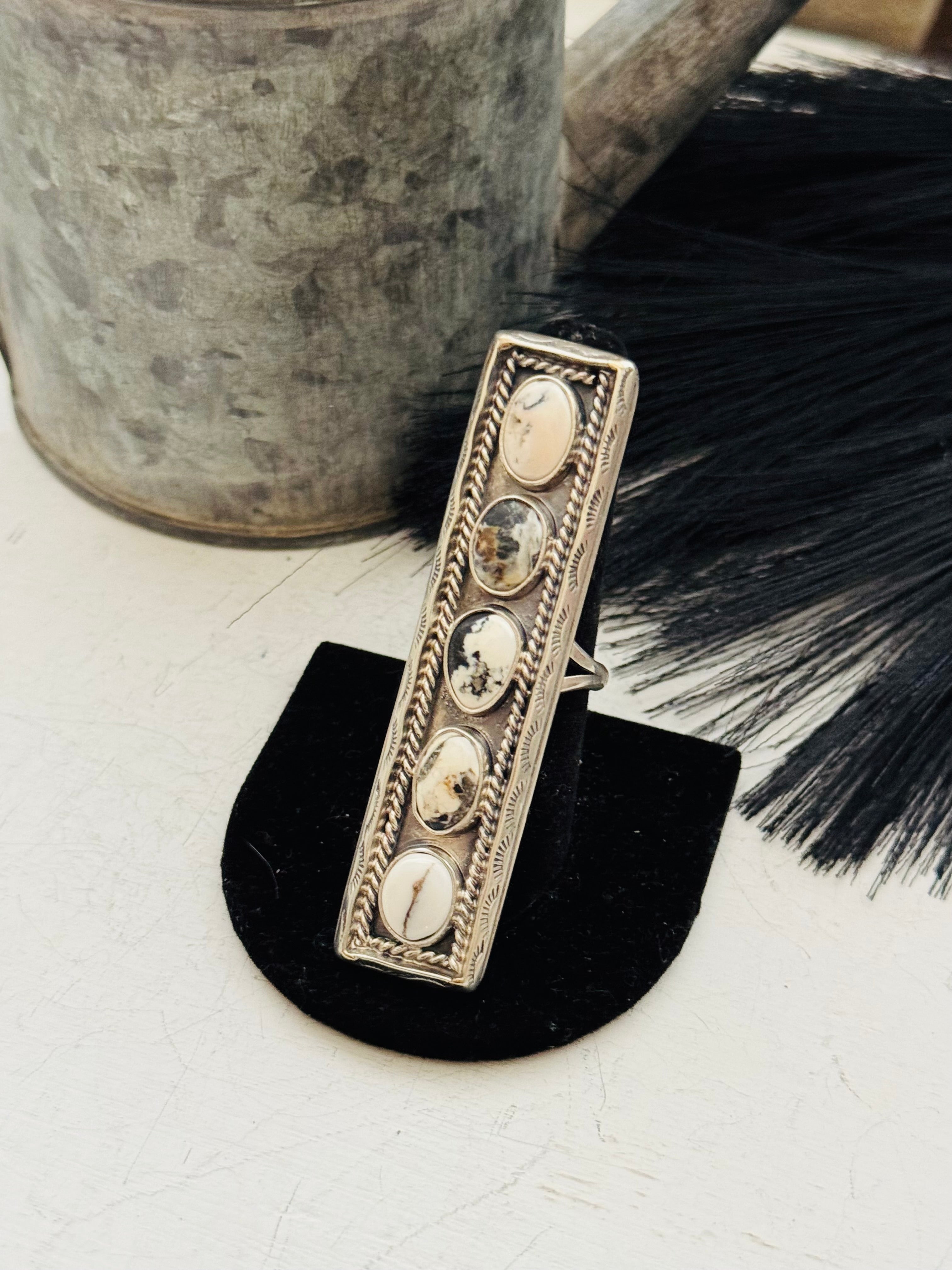 Beautiful rings Navajo Made White Buffalo & Sterling Silver Adjustable Ring. It measures 2 3/4 inches long and 3/4 of an inch wide. Signed by the artist and stamped sterling silver.
