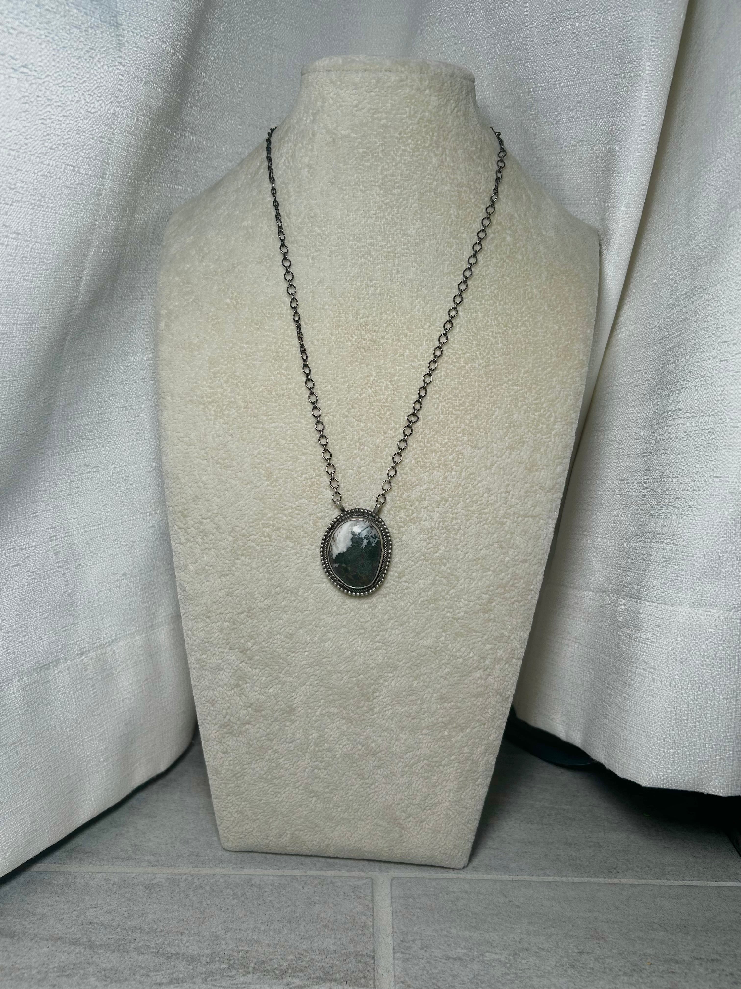 Navajo Made White Buffalo & Sterling Silver Necklace. It measures 21 3/4 inches long with hang while the chain measures 18 inches long. Signed by the artist and stamped sterling silver.