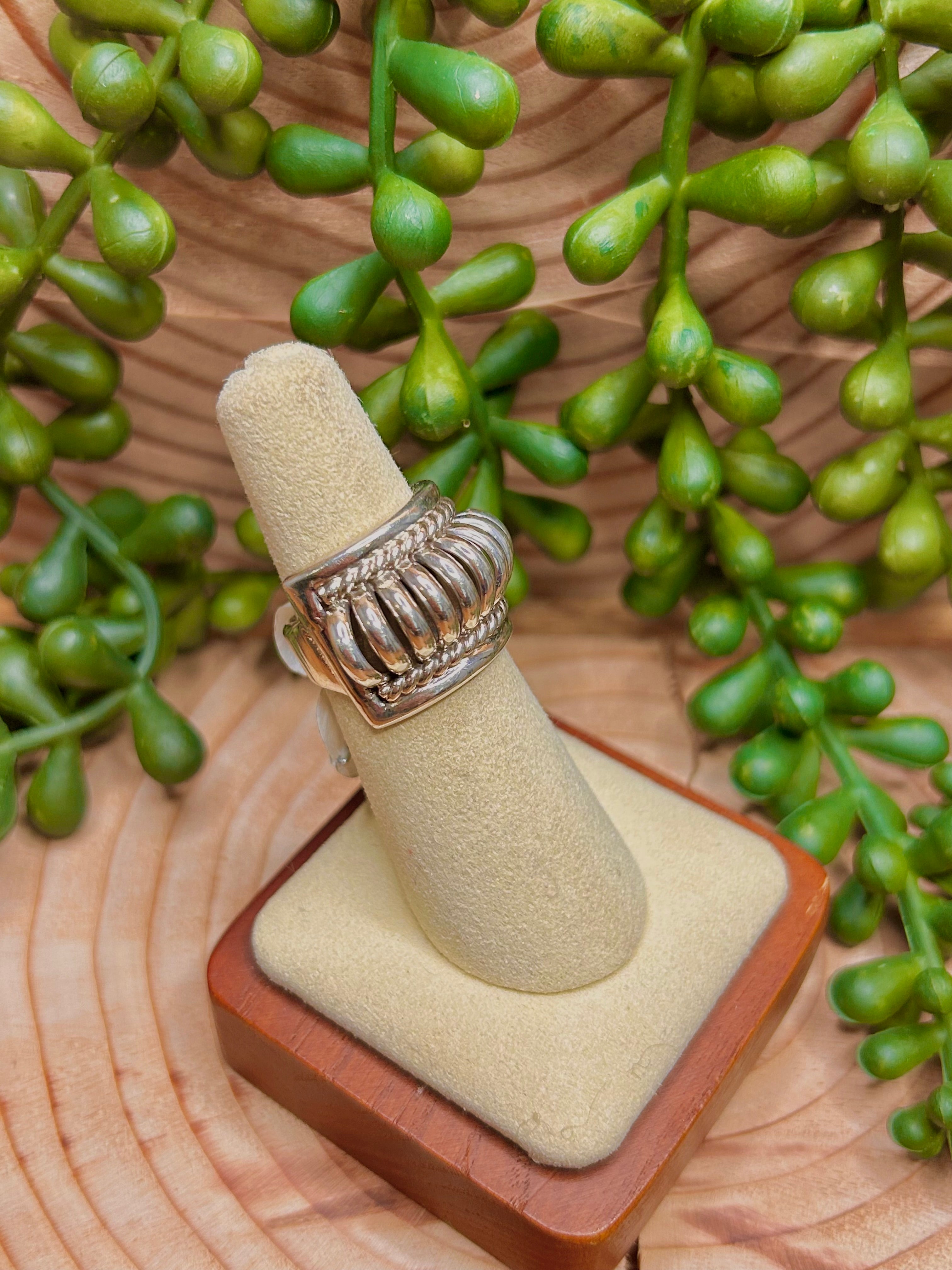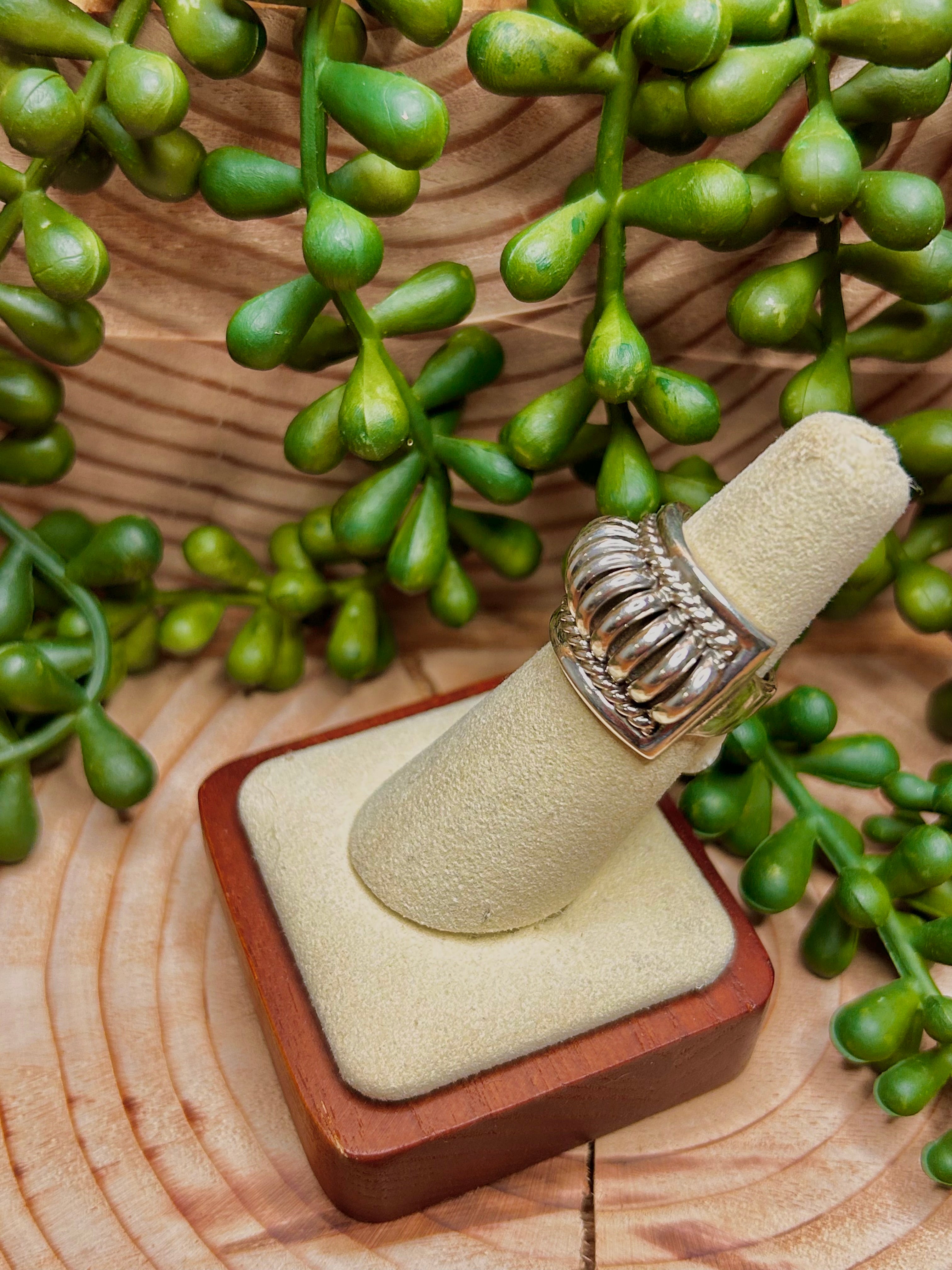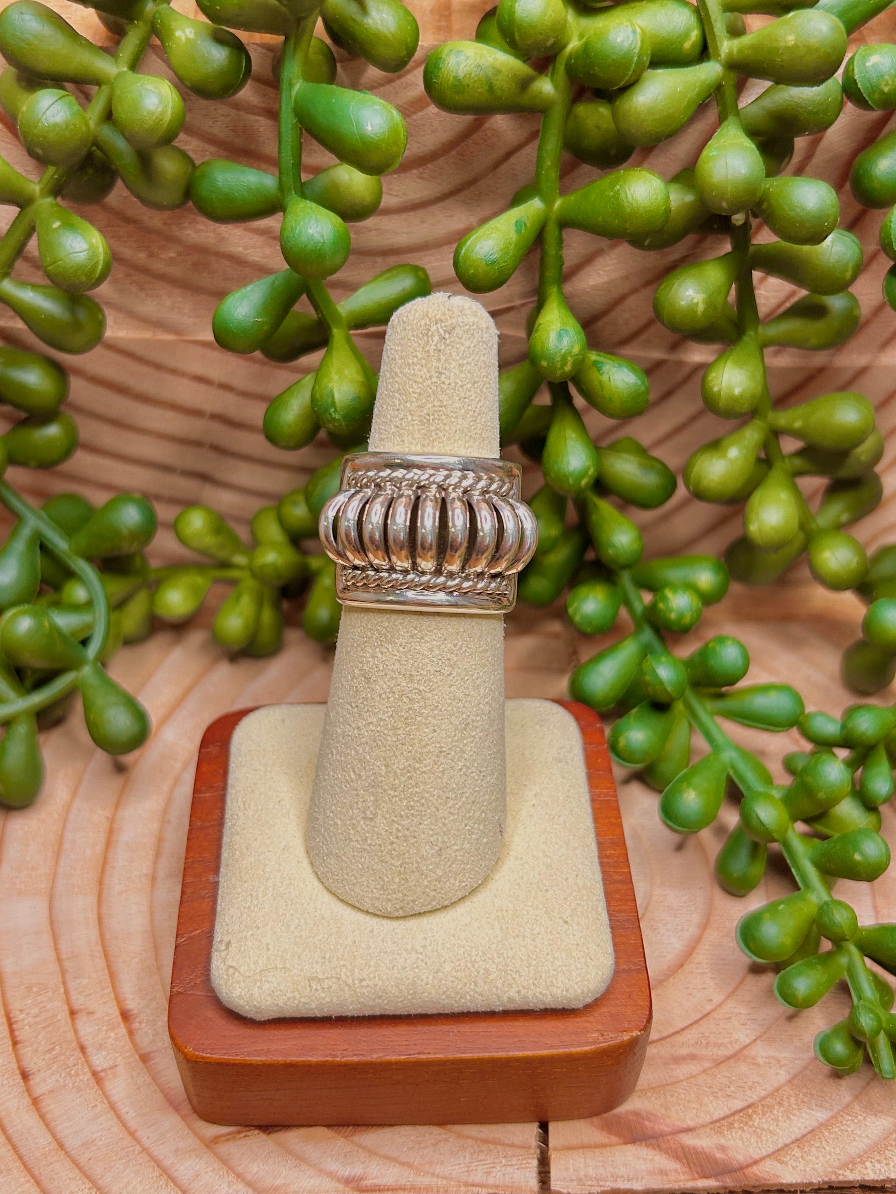Navajo Made Sterling Silver Ring. It measures 3/4 of an inch long and 3/4 of an inch wide. Signed by the artist and stamped sterling silver.