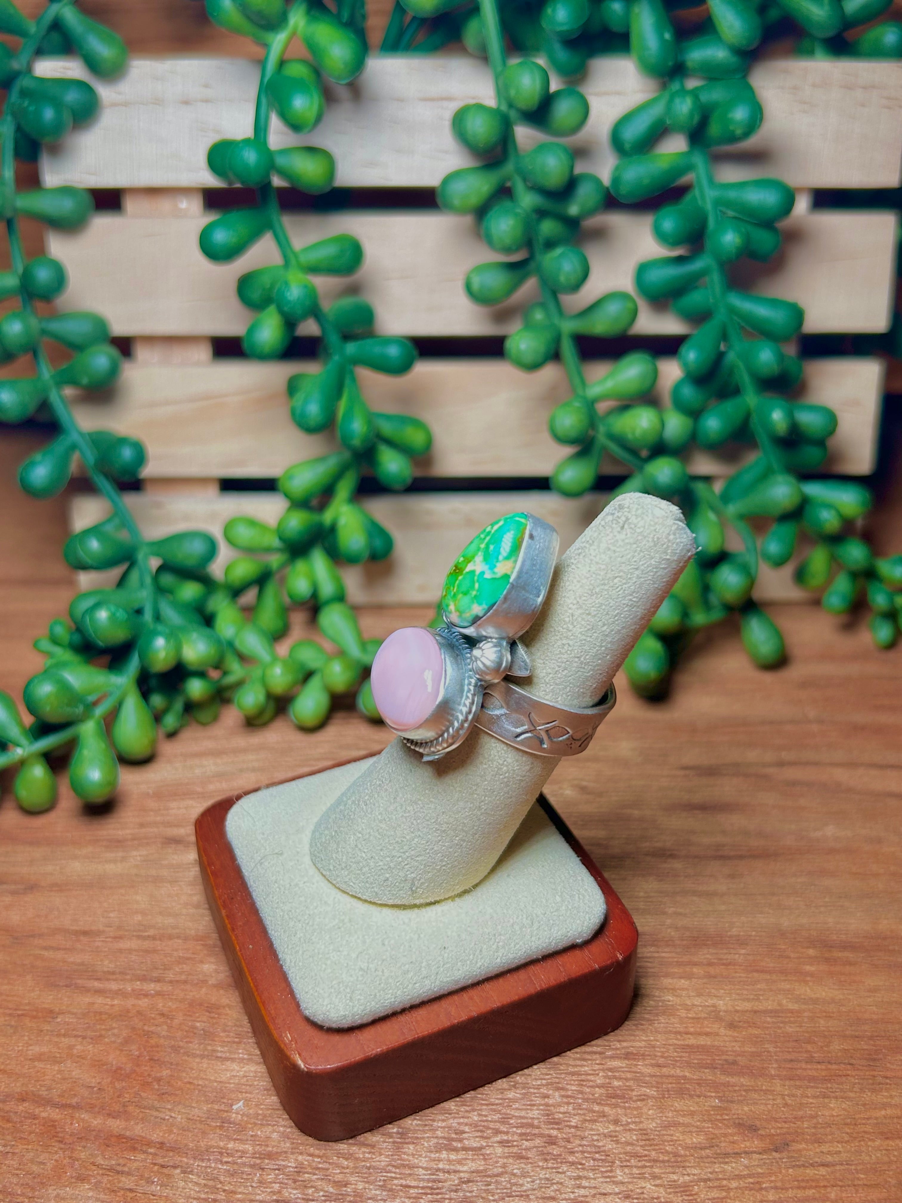 Navajo Made Multi Stone & Sterling Silver Adjustable Ring. It measures 1 1/4 inches long and 3/4 of an inch wide. Signed by the artist and stamped sterling silver.