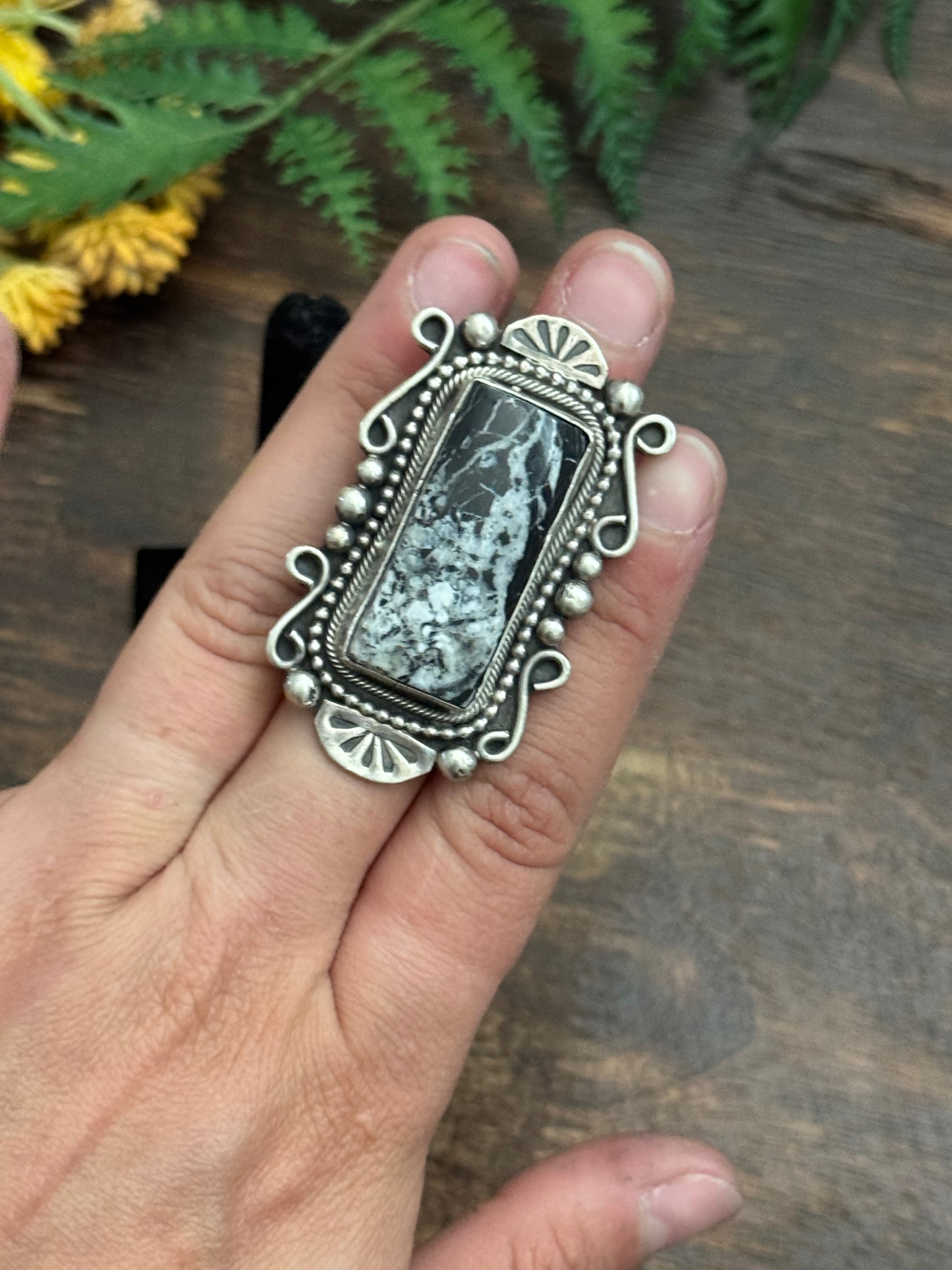 Beautiful rings Navajo Made White Buffalo & Sterling Silver Ring Size 5.5. It measures 1 7/8 inches long and 1 1/4 inches wide. Signed by the artist and stamped sterling silver.