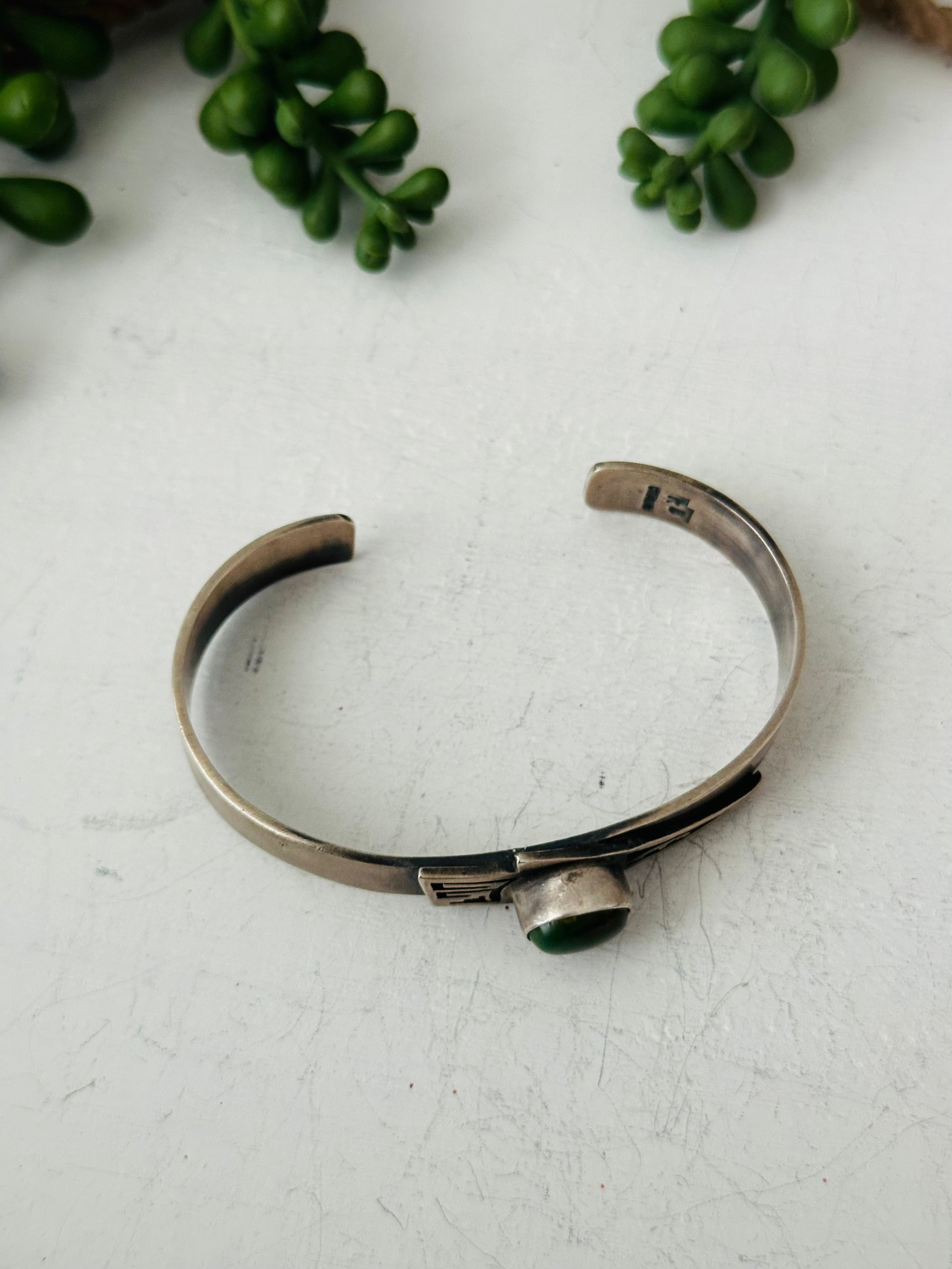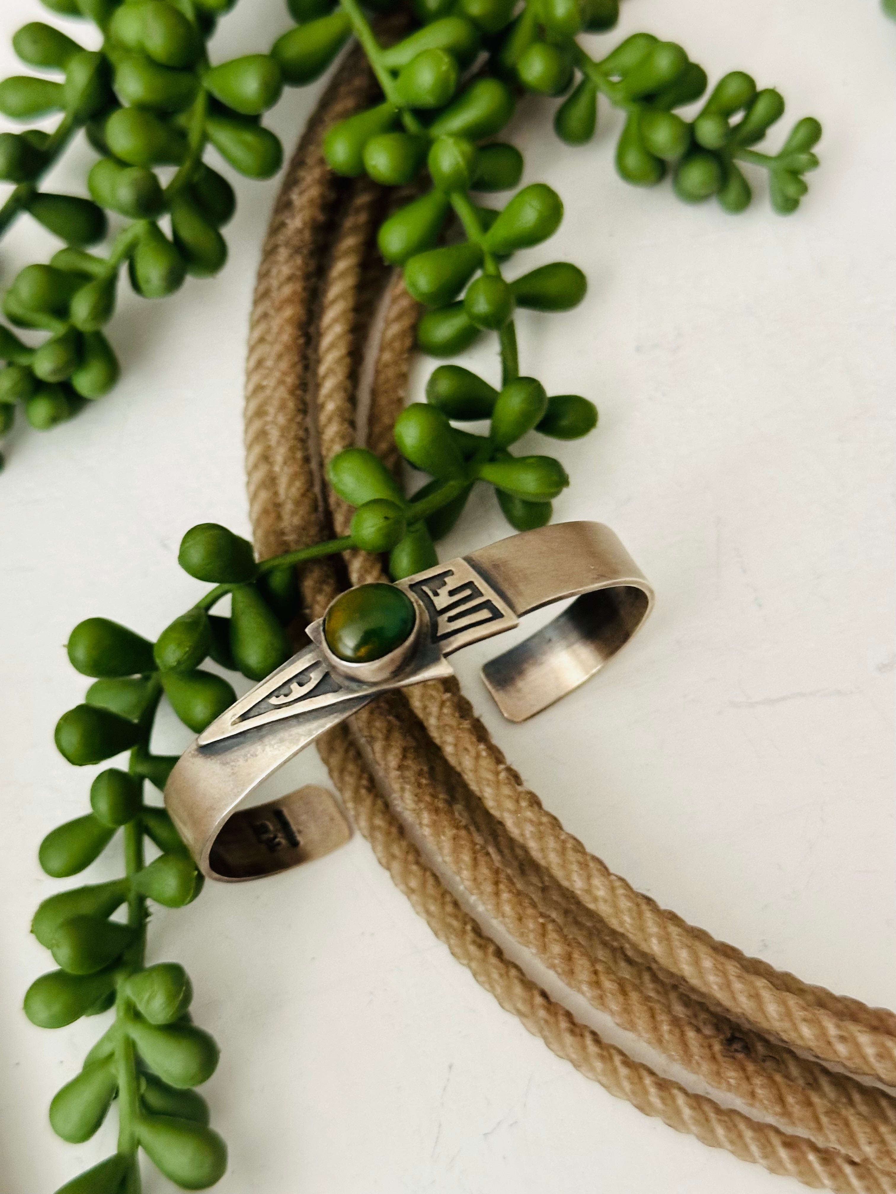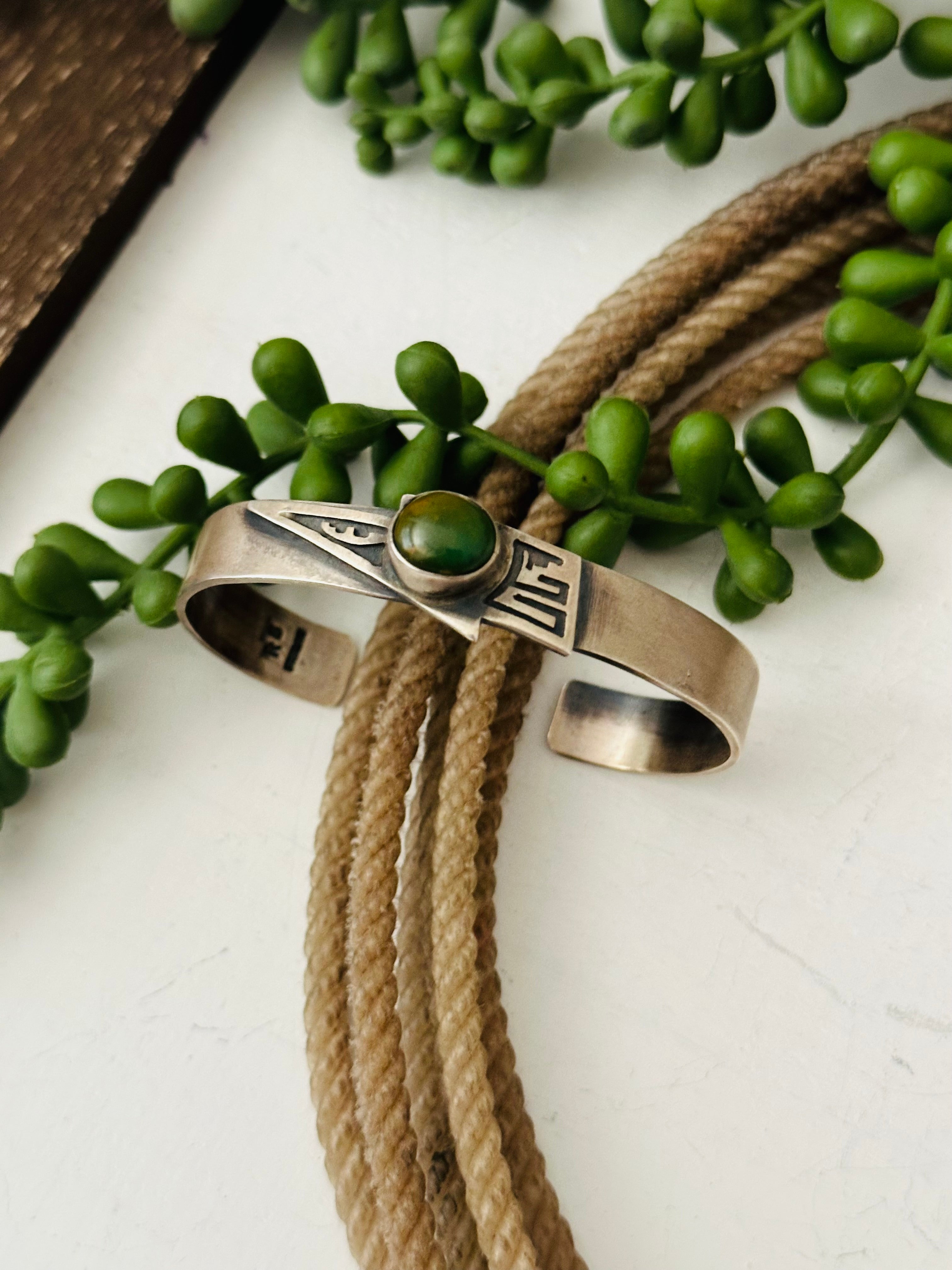 Navajo Natural Royston Turquoise & Sterling Silver Cuff Bracelet. It measures 5/8 of an inch wide with an inside circumference of 5 1/2 inches and a gap of 1 inch. Signed by the artist and stamped sterling silver.