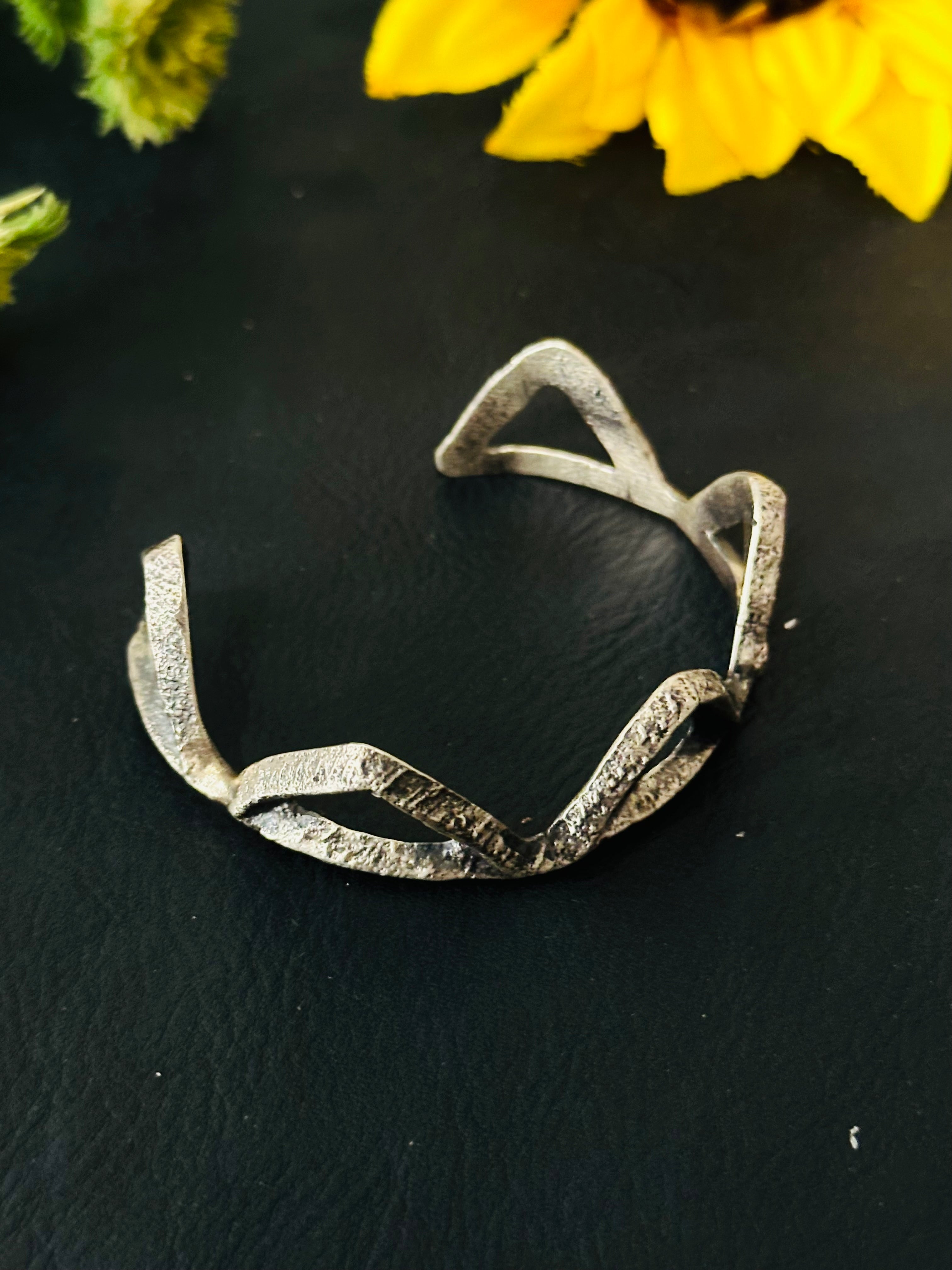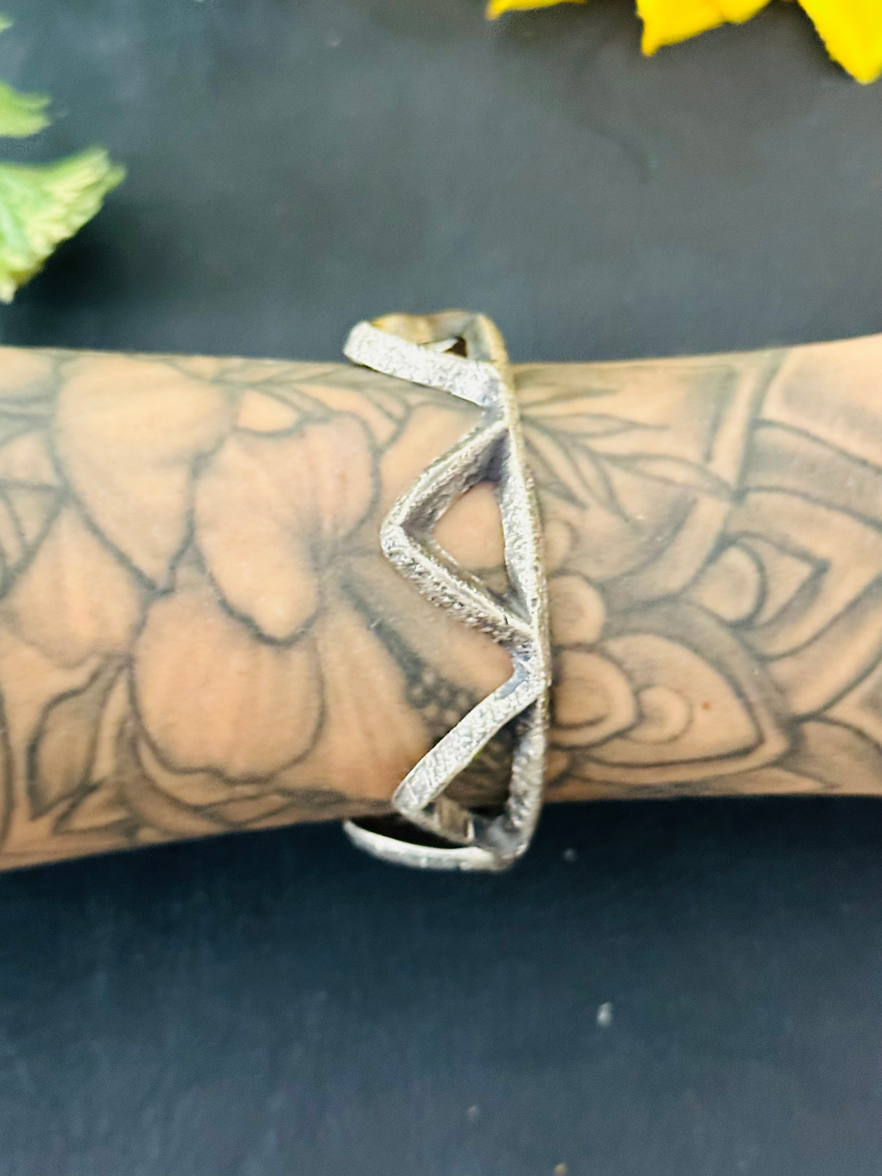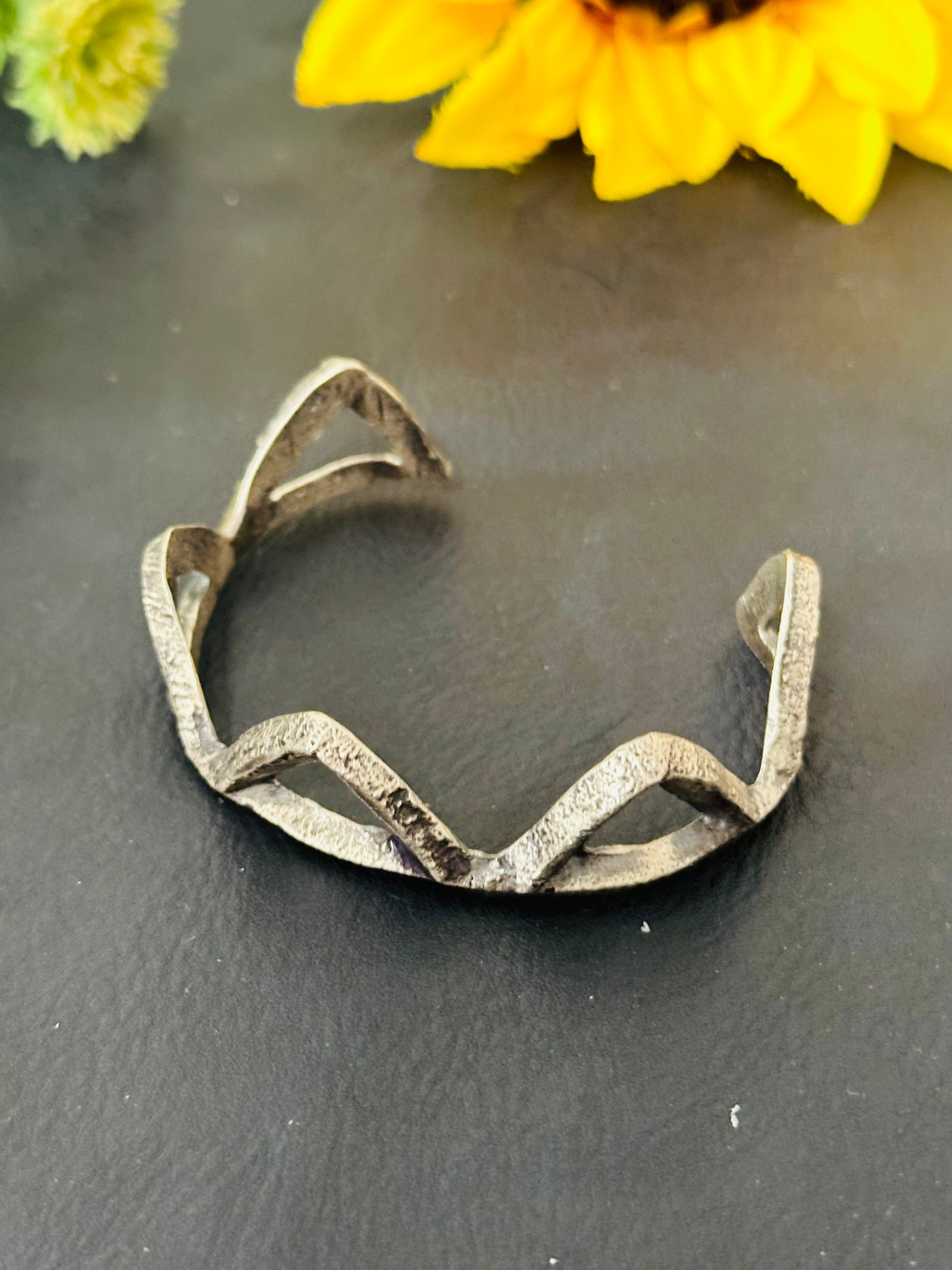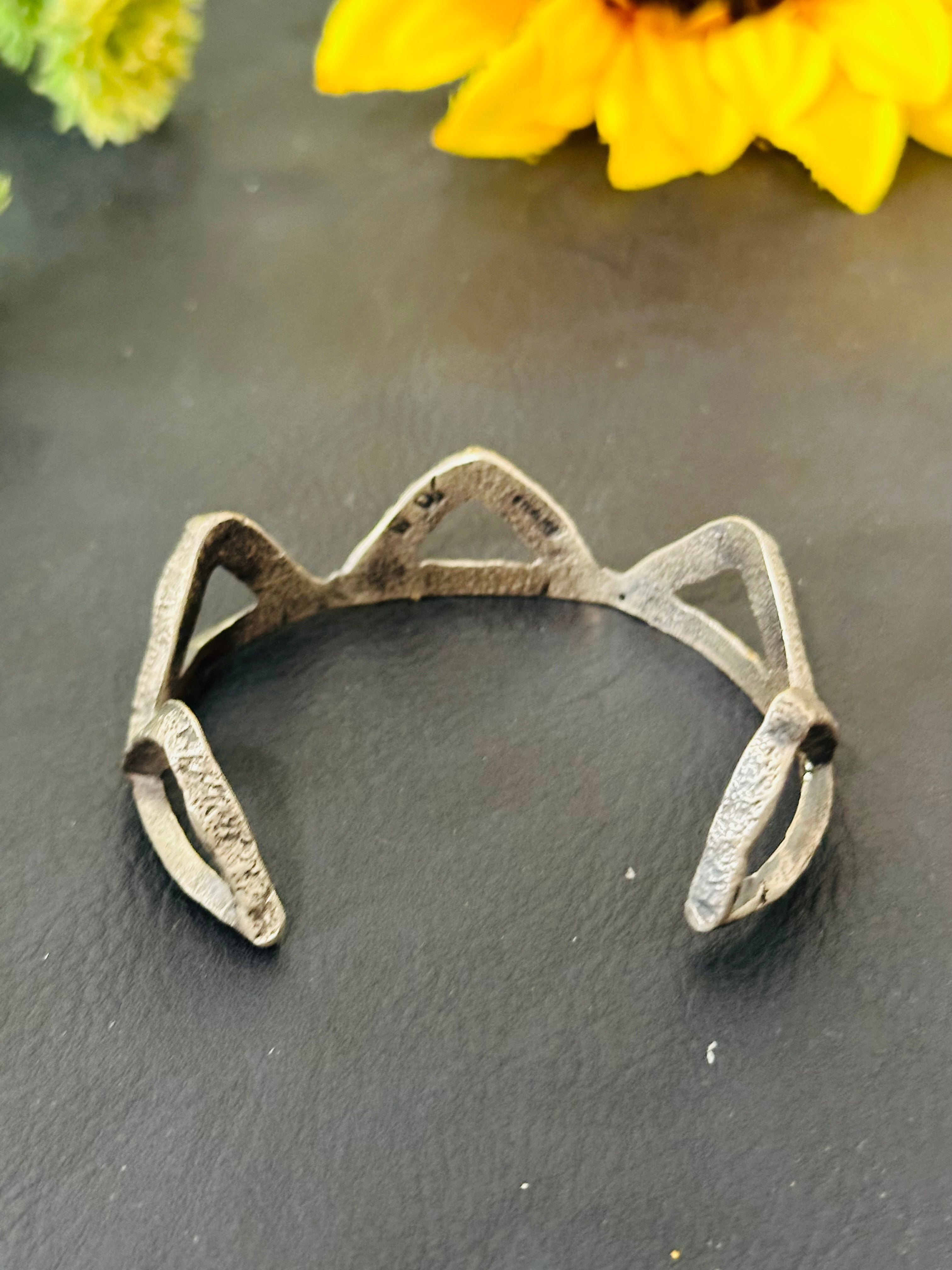 Navajo Made Sterling Silver Cuff Bracelet. It measures 5/8 of an inch wide with an inside circumference of 5 inches and a gap of 1 1/4 inches. Signed by the artist and stamped sterling silver.