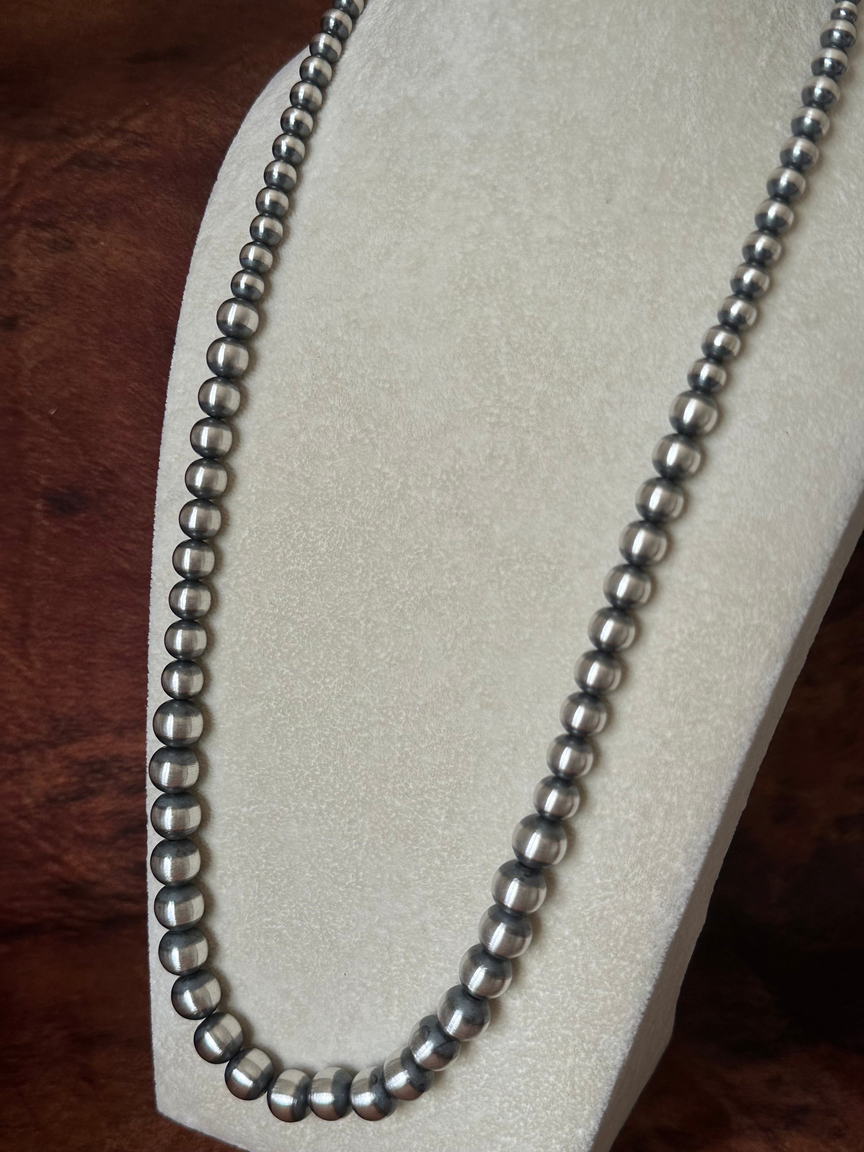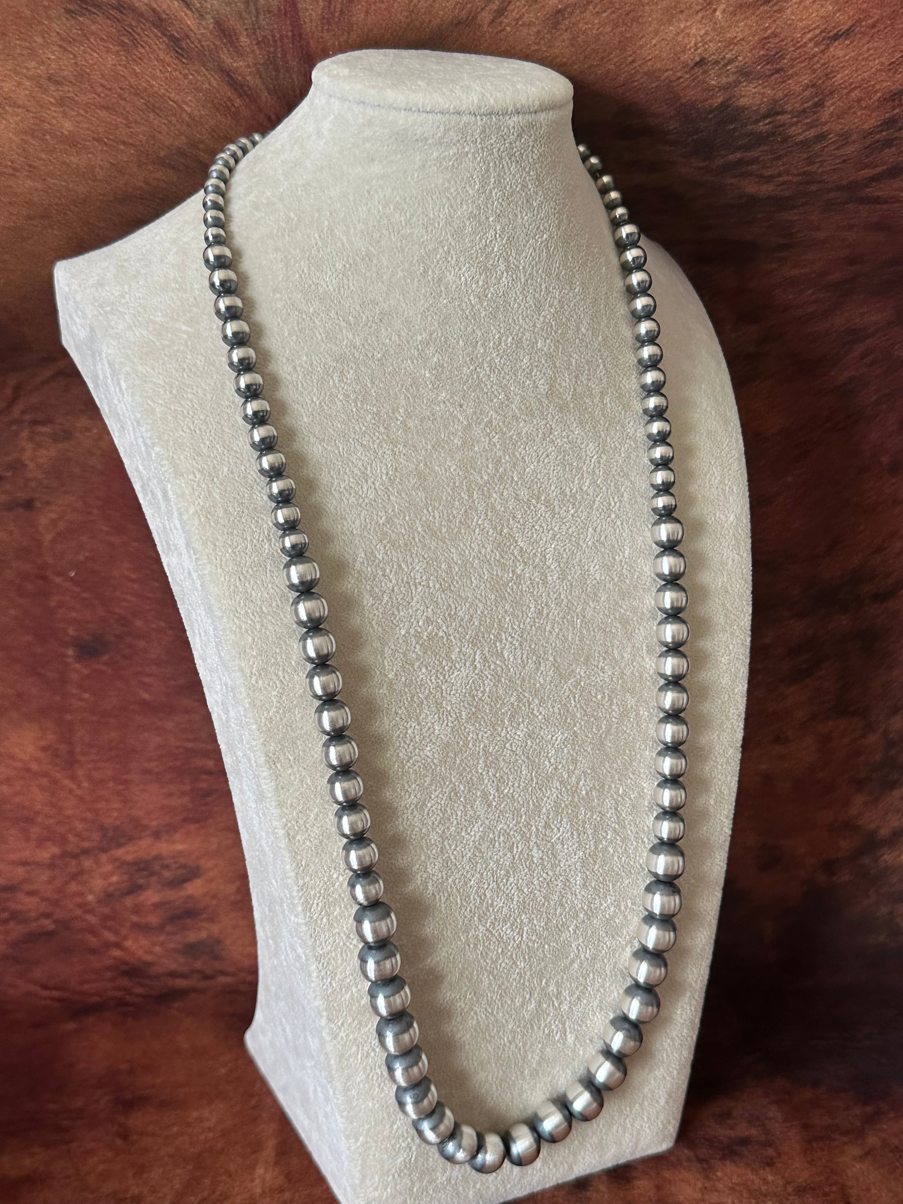 Navajo Strung 6 MM-12 MM Graduated Sterling Silver Pearls Beaded Necklace. It measures 30 inches long.