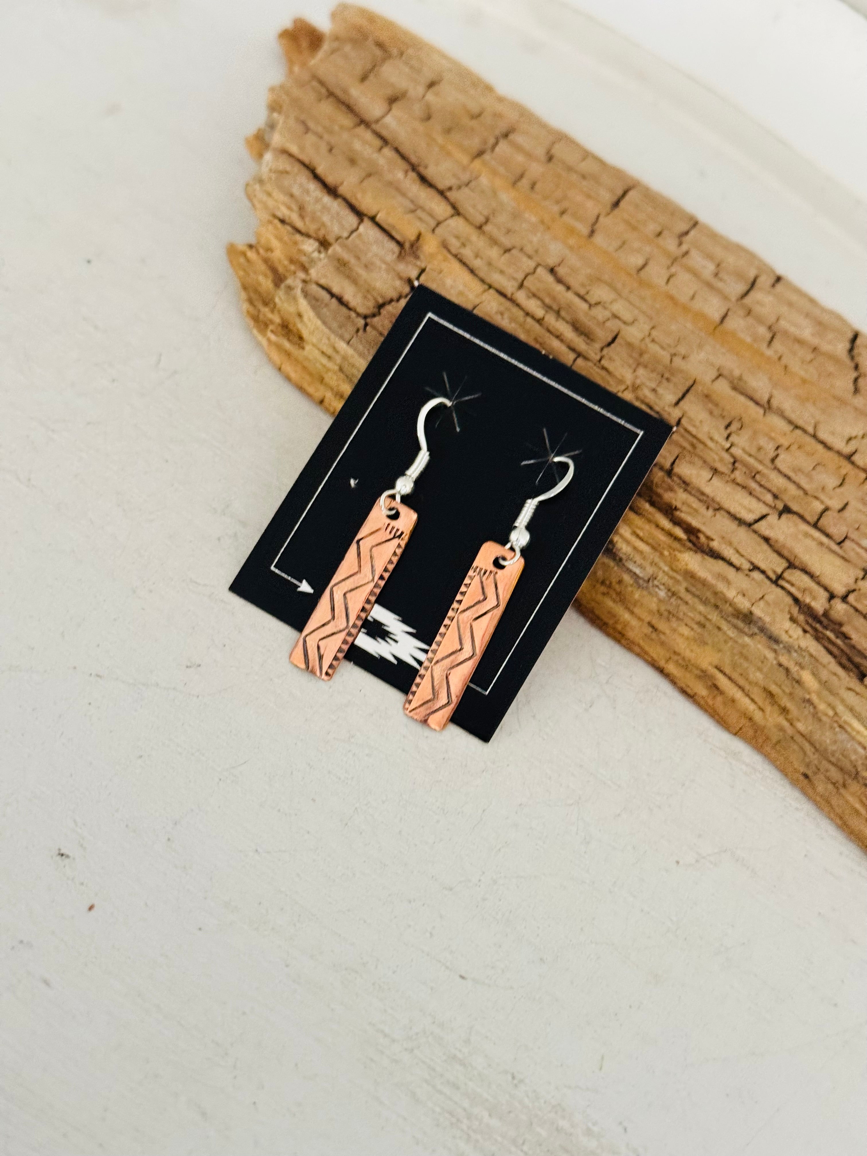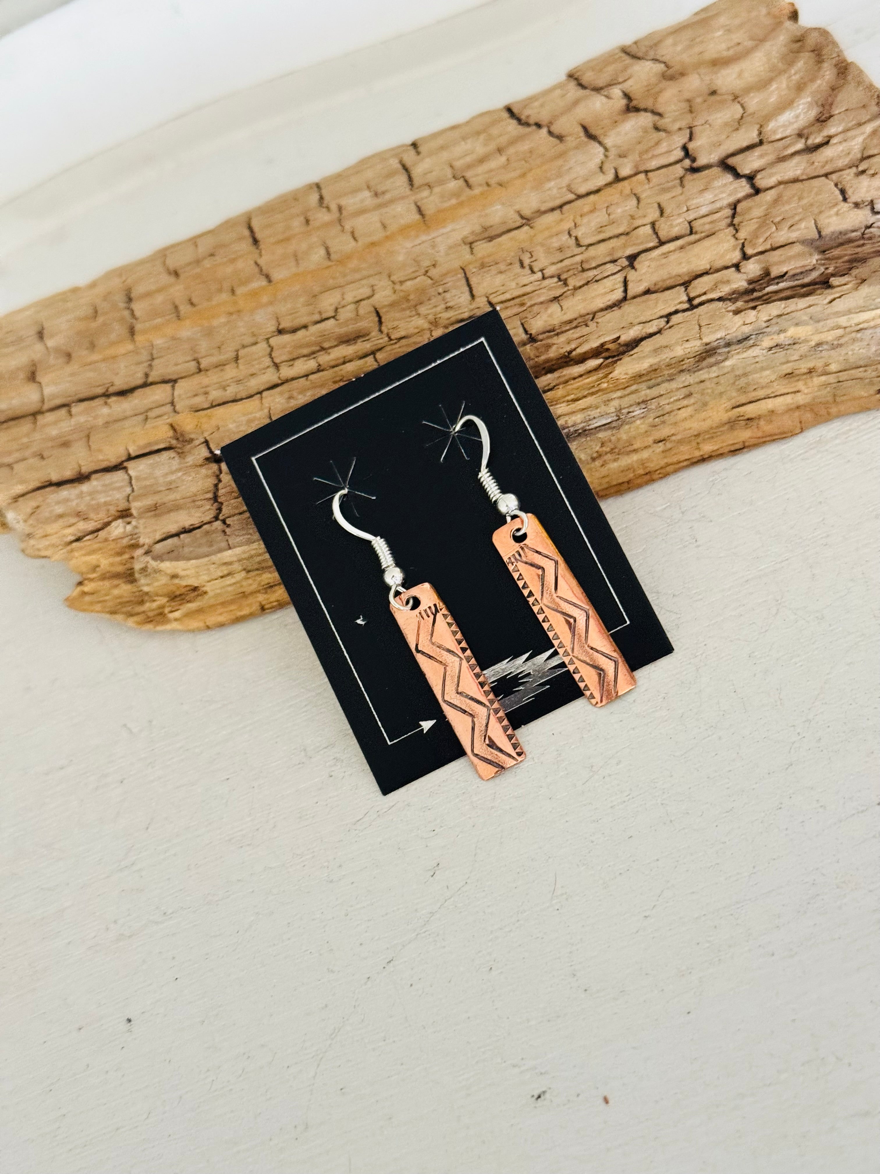 Navajo Strung Copper & Sterling Silver Dangle Earrings. It measures 1 1/4 inches long and 1/4 of an inch wide.