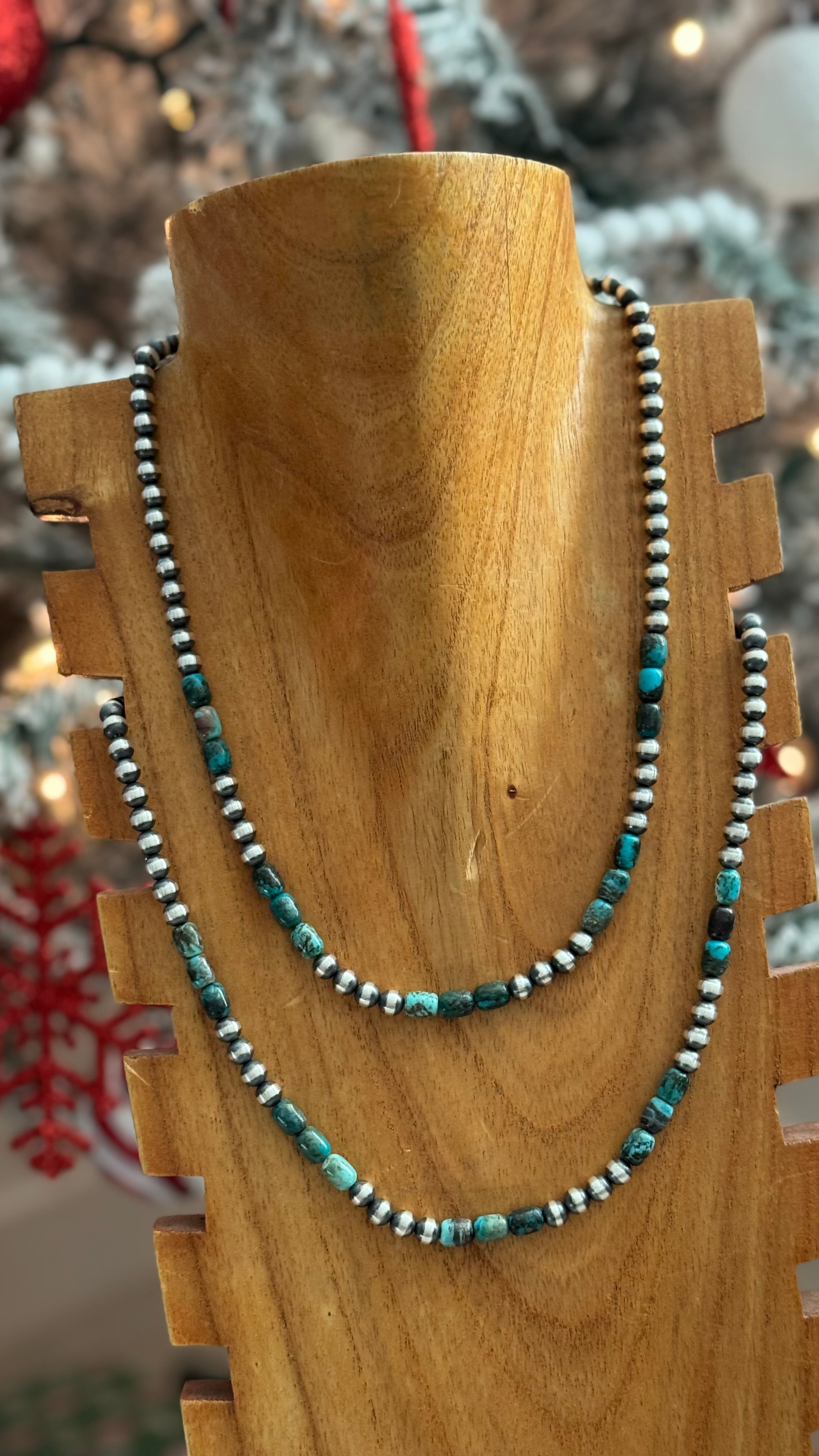 Navajo Strung Egyptian Turquoise & Sterling Silver Graduated Pearl Necklace. They measure 20 inches long. Stones will differ due to natural stones.