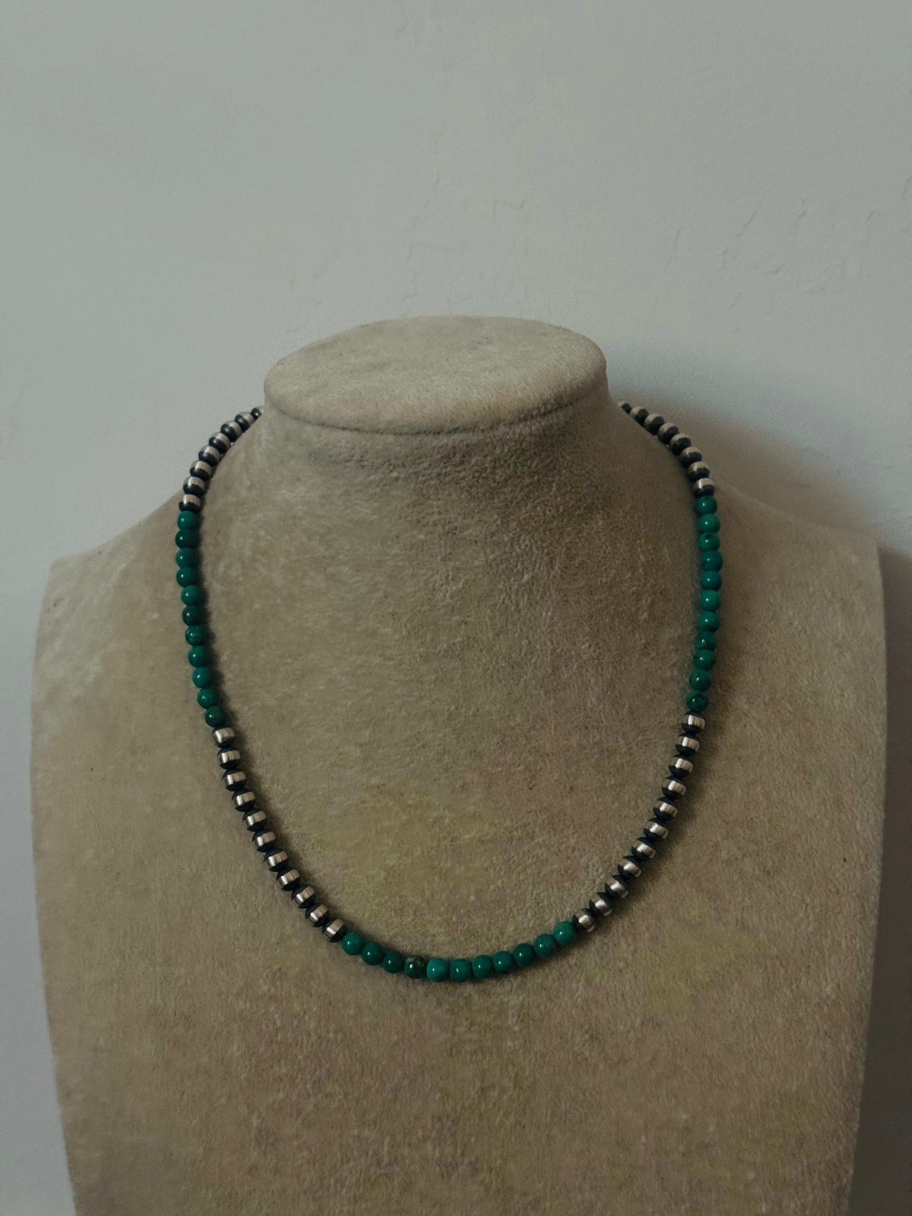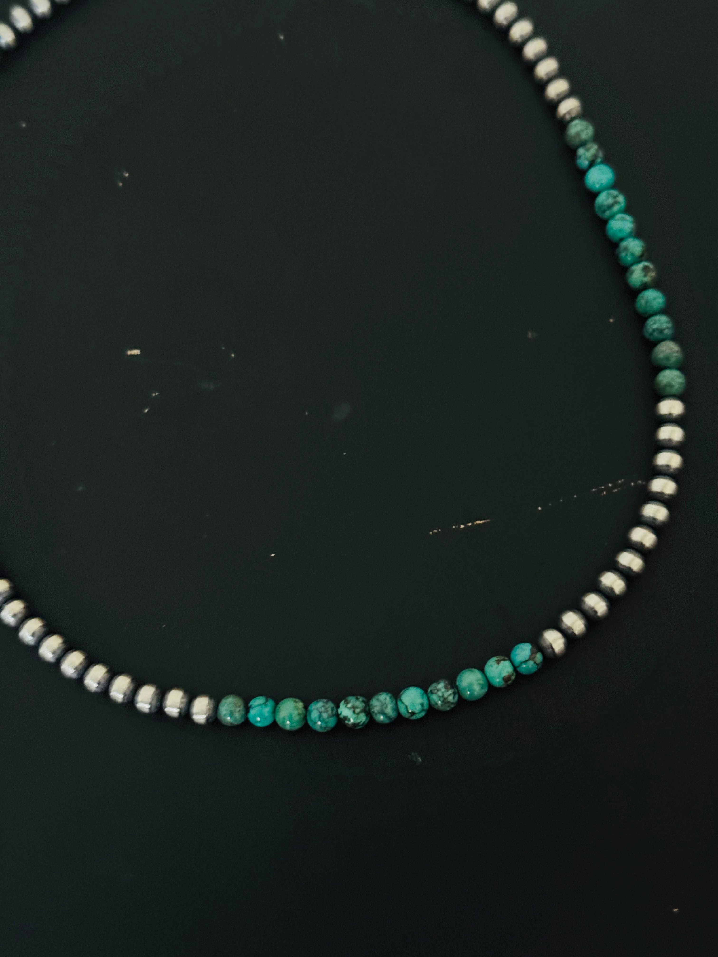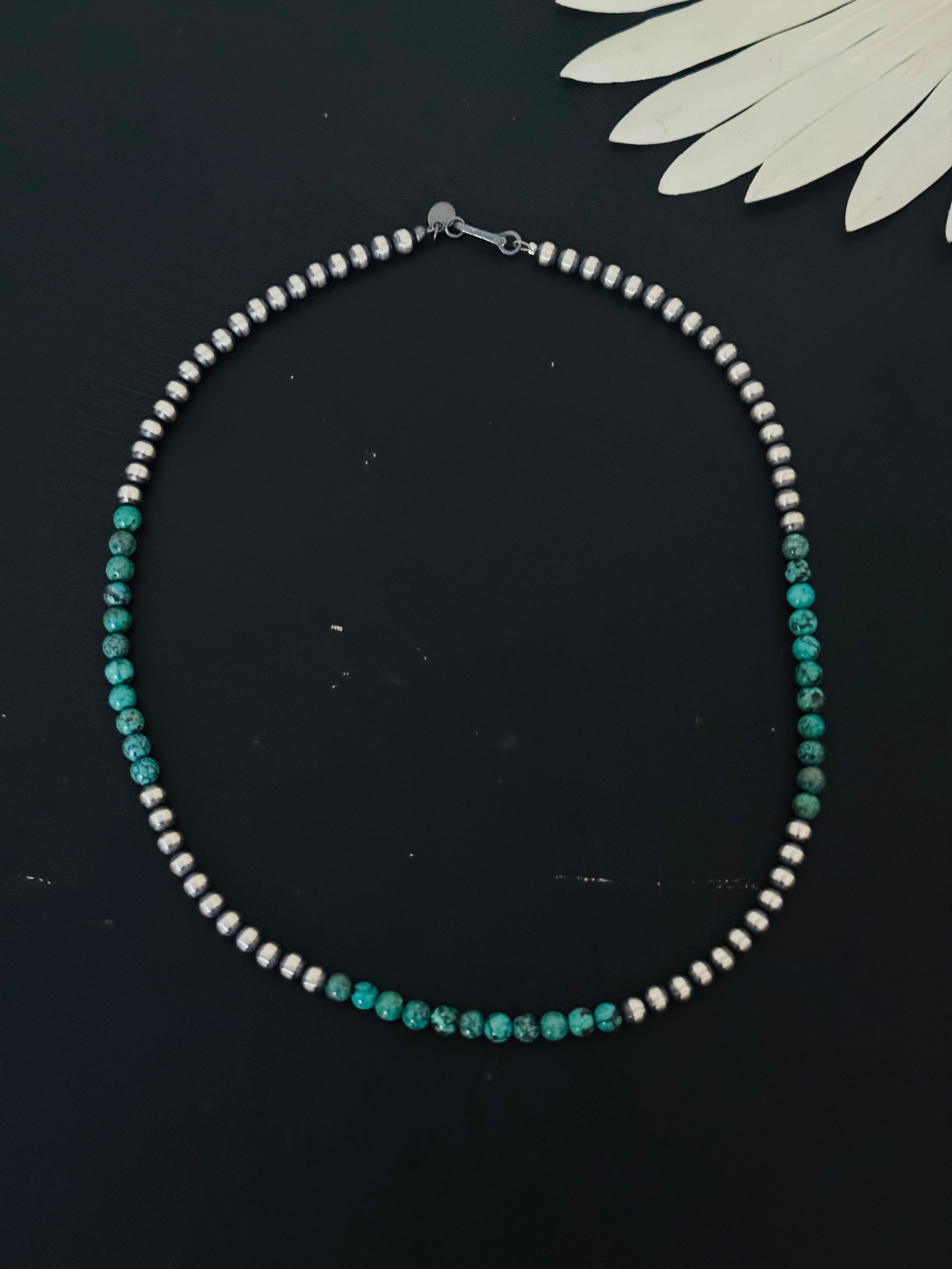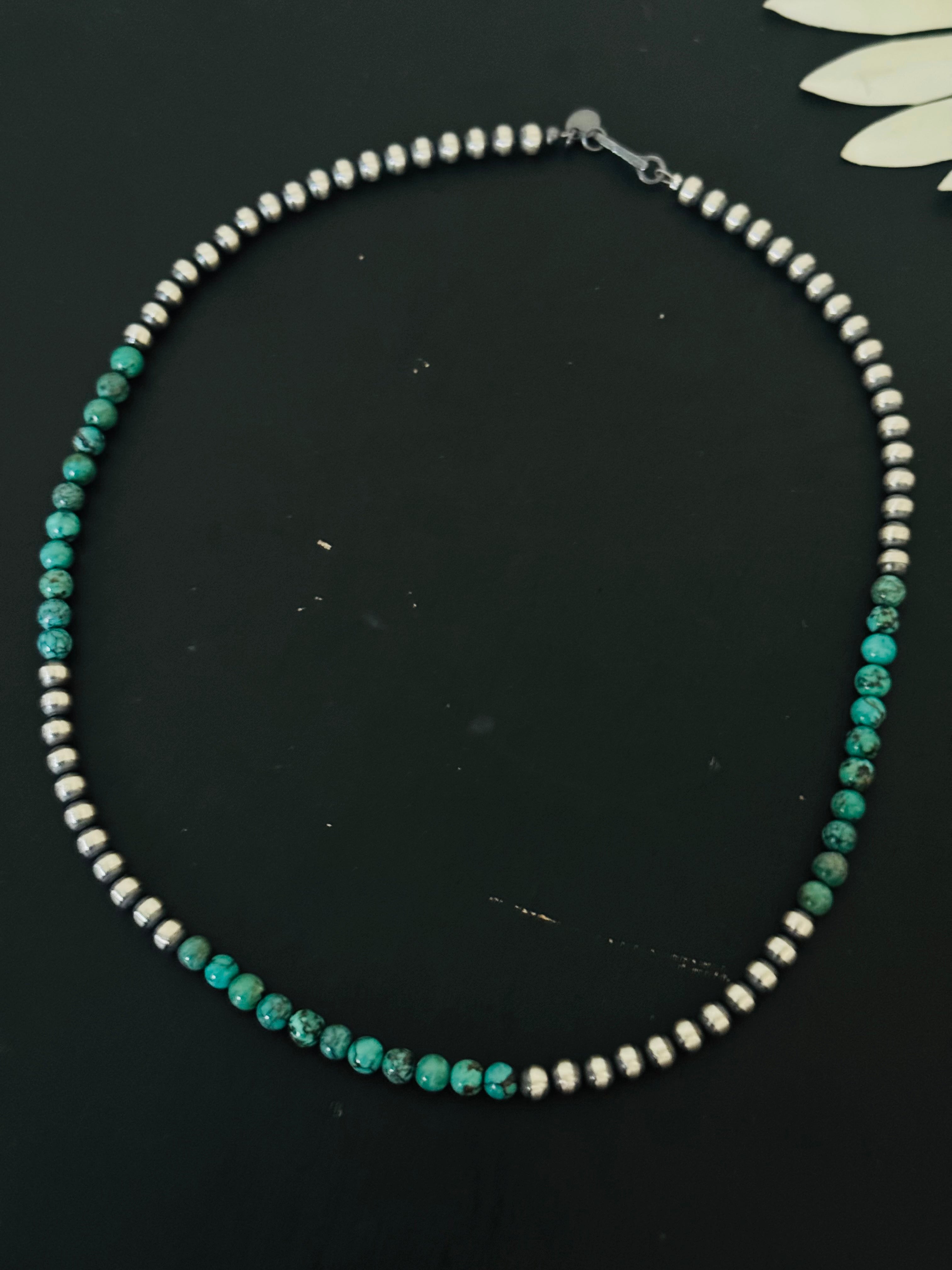 Navajo Strung Hubei Turquoise & Sterling Silver Pearl Beaded Necklace. It measures 16 inches long.