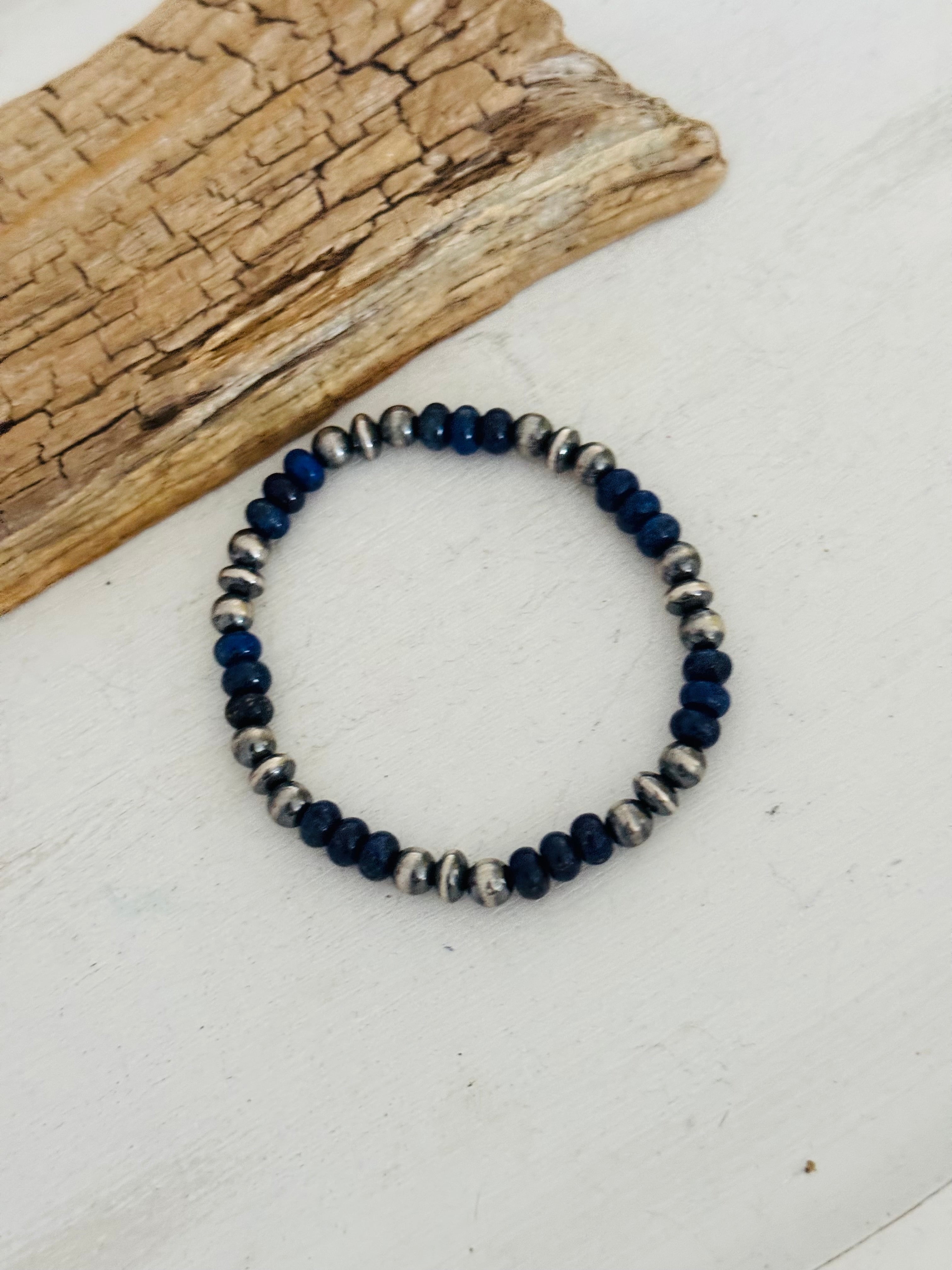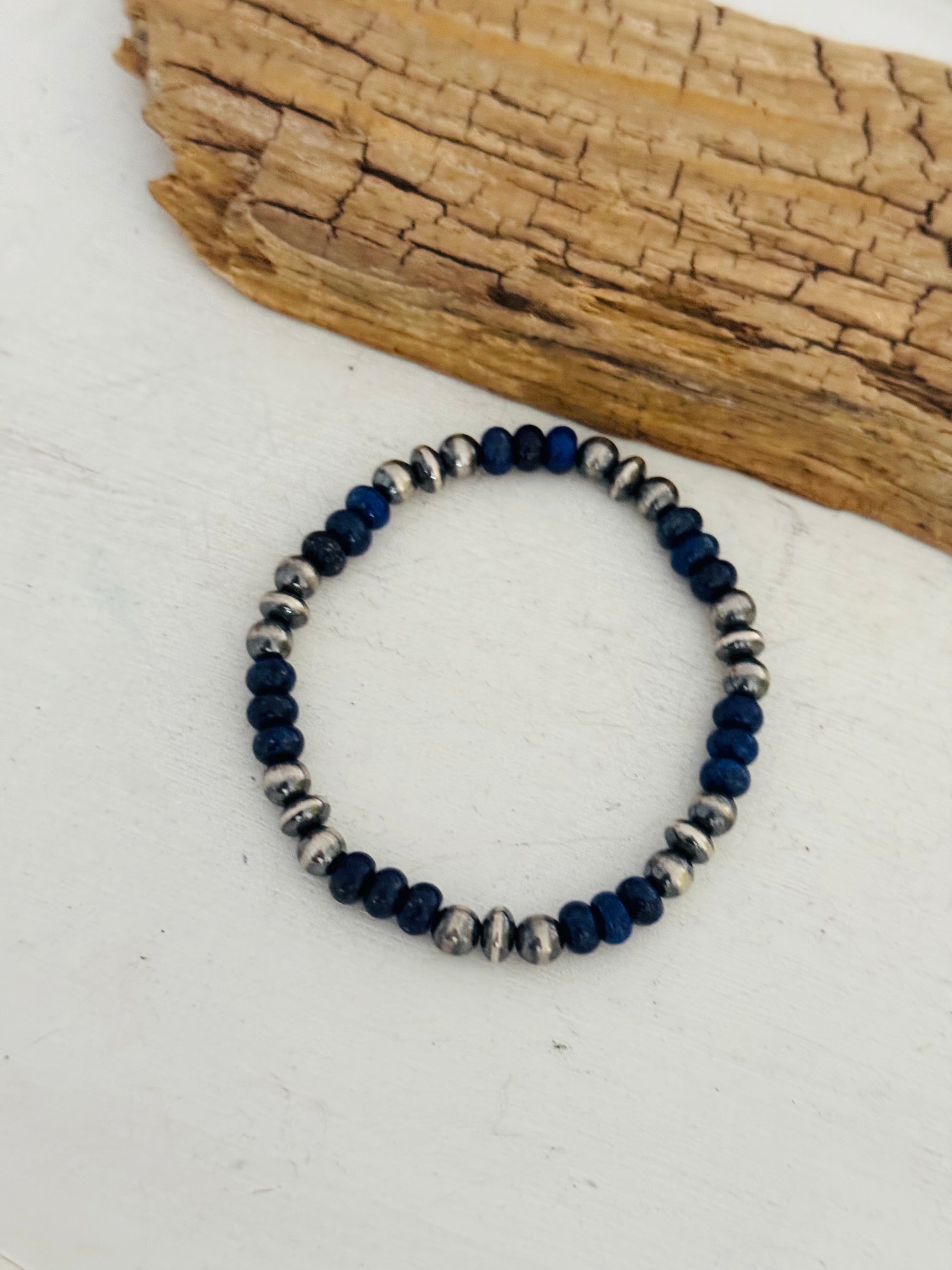 Navajo Strung Lapis & Sterling Silver Pearl Beaded Stretch Bracelet