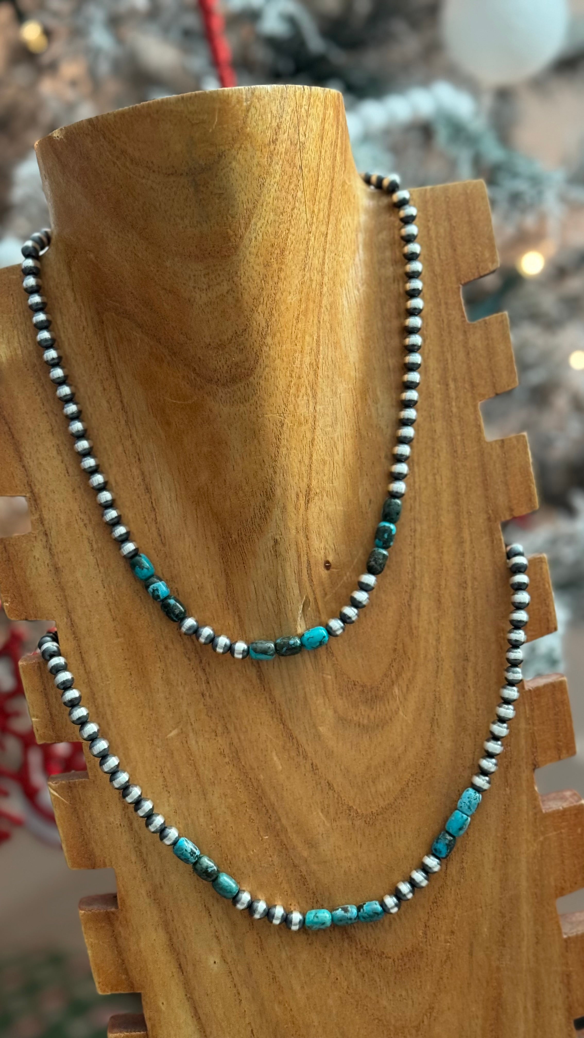 Navajo Strung Egyptian Turquoise & Sterling Silver Graduated Pearl Necklace. They measure 18 inches long. Stones will differ due to natural stones.
