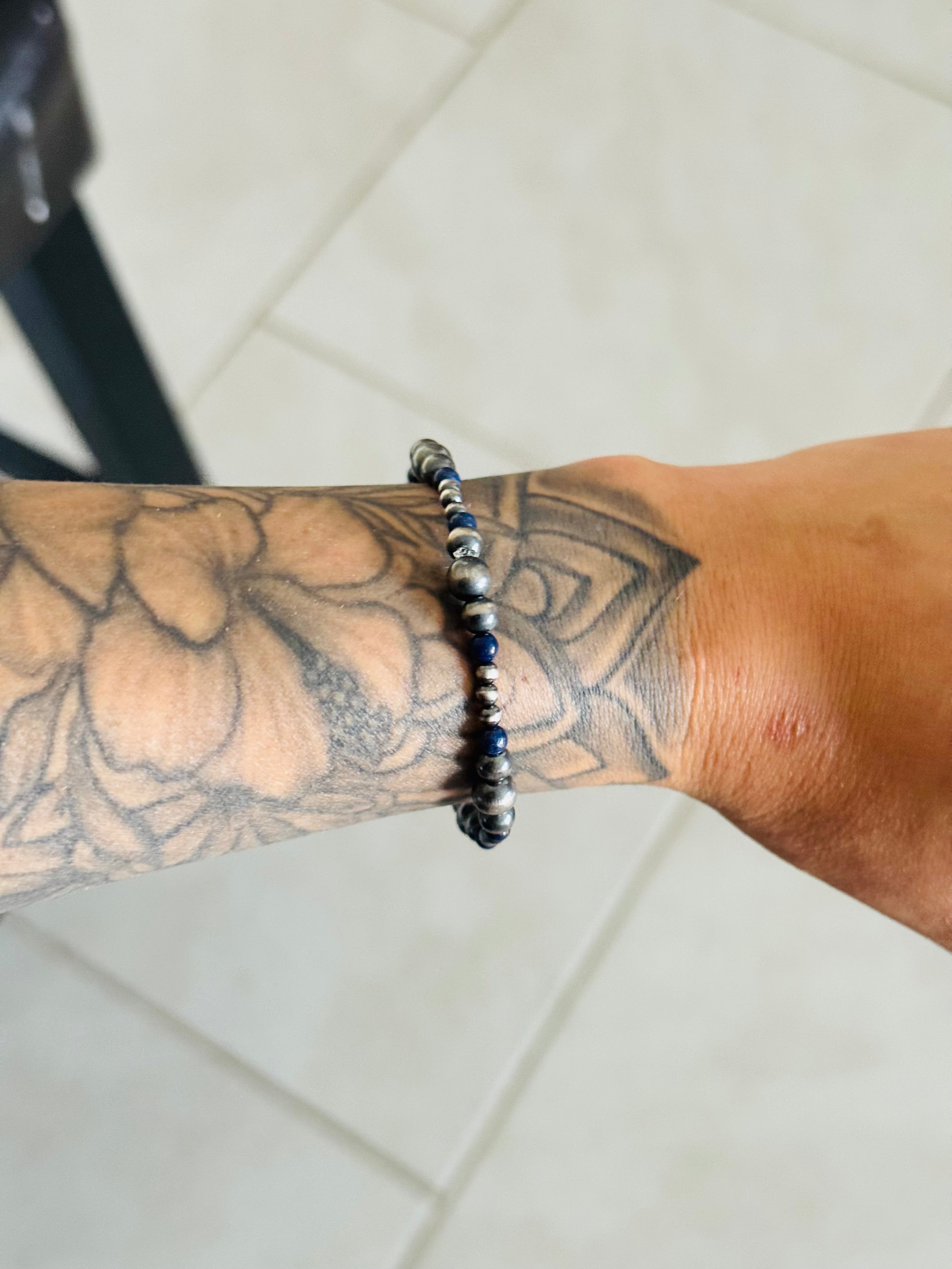 Navajo Strung Lapis & Sterling Silver Pearl Beaded Stretch Bracelet. It measures 7 inches long.
