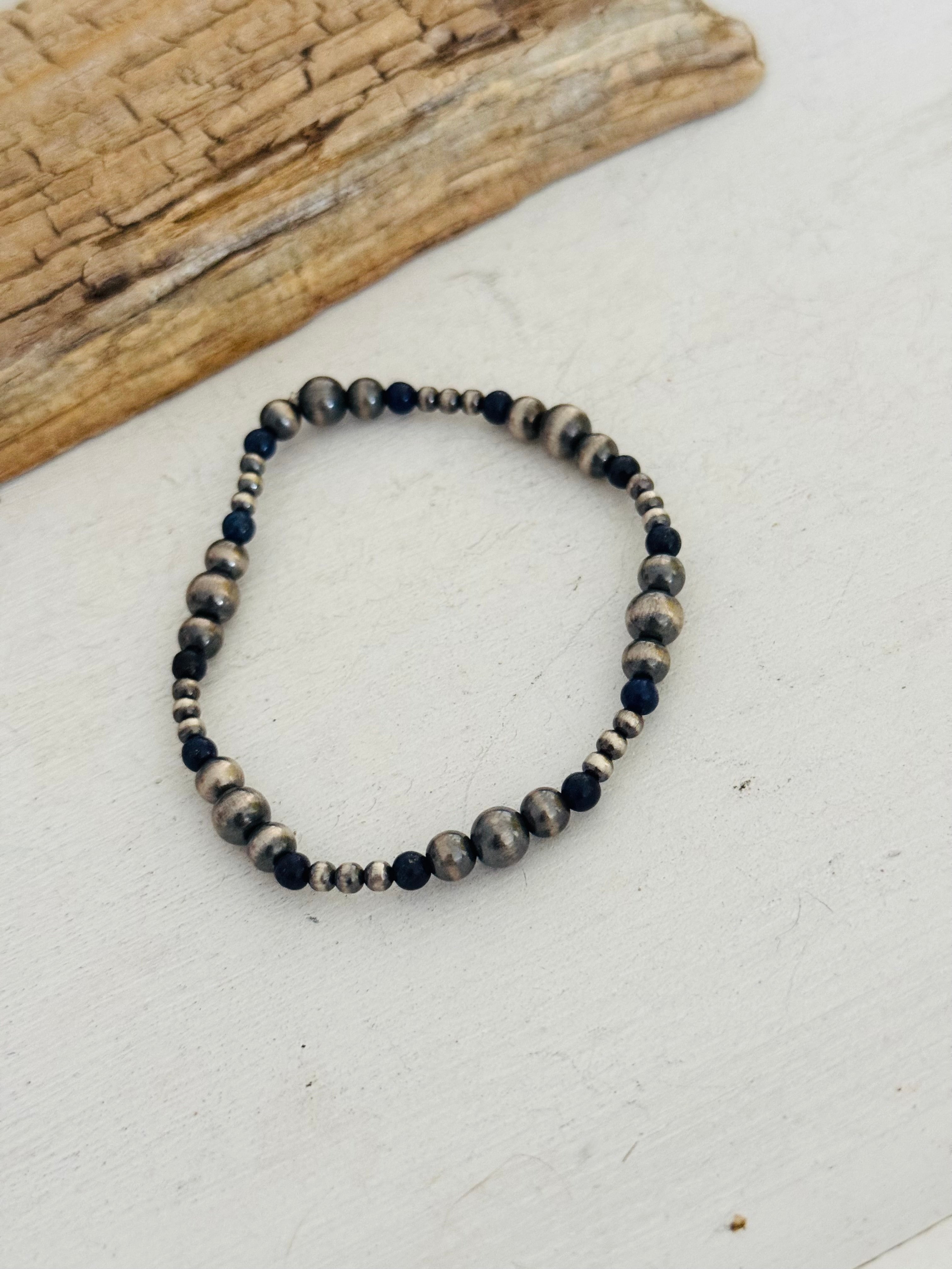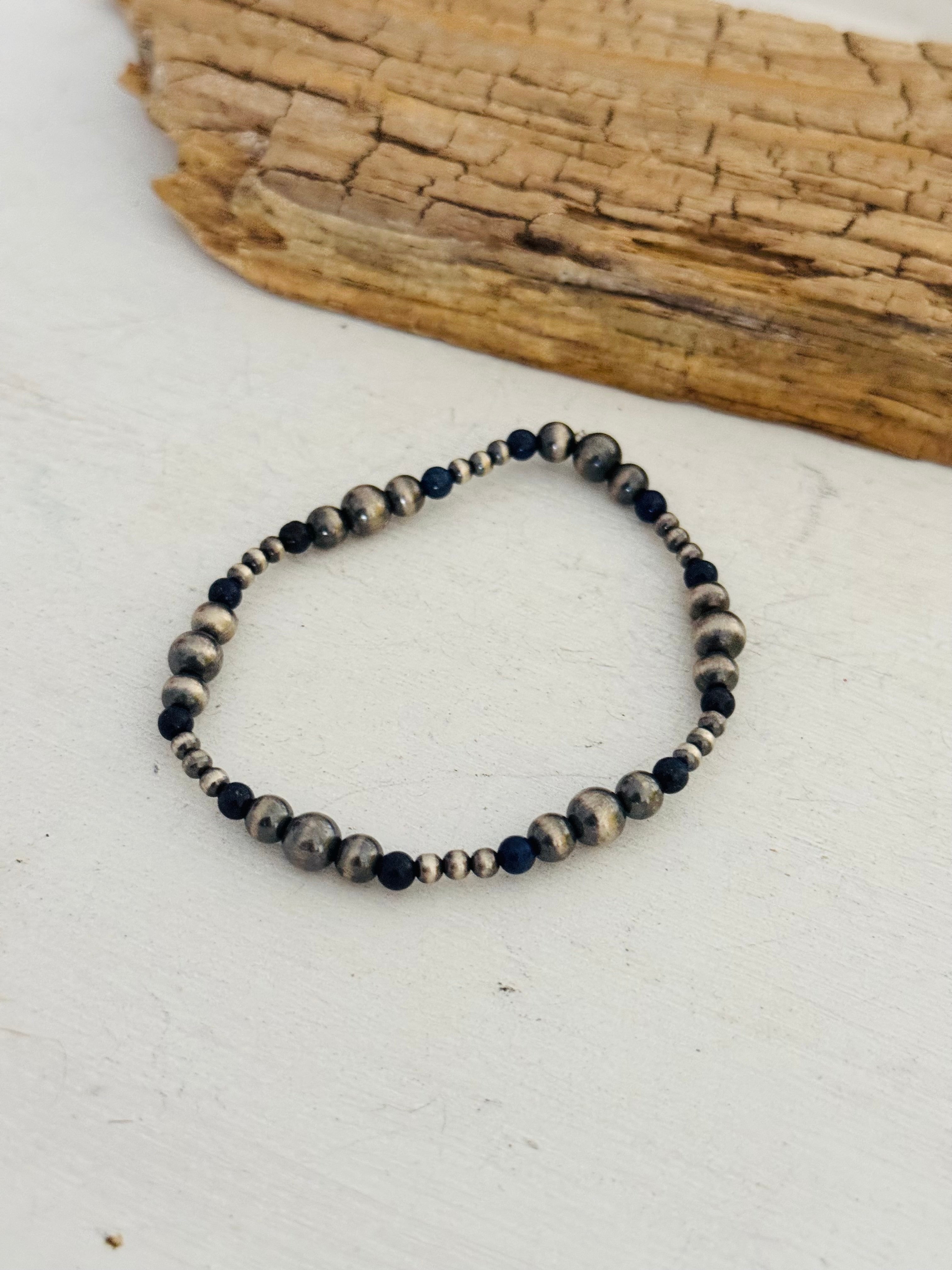 Navajo Strung Lapis & Sterling Silver Pearl Beaded Stretch Bracelet