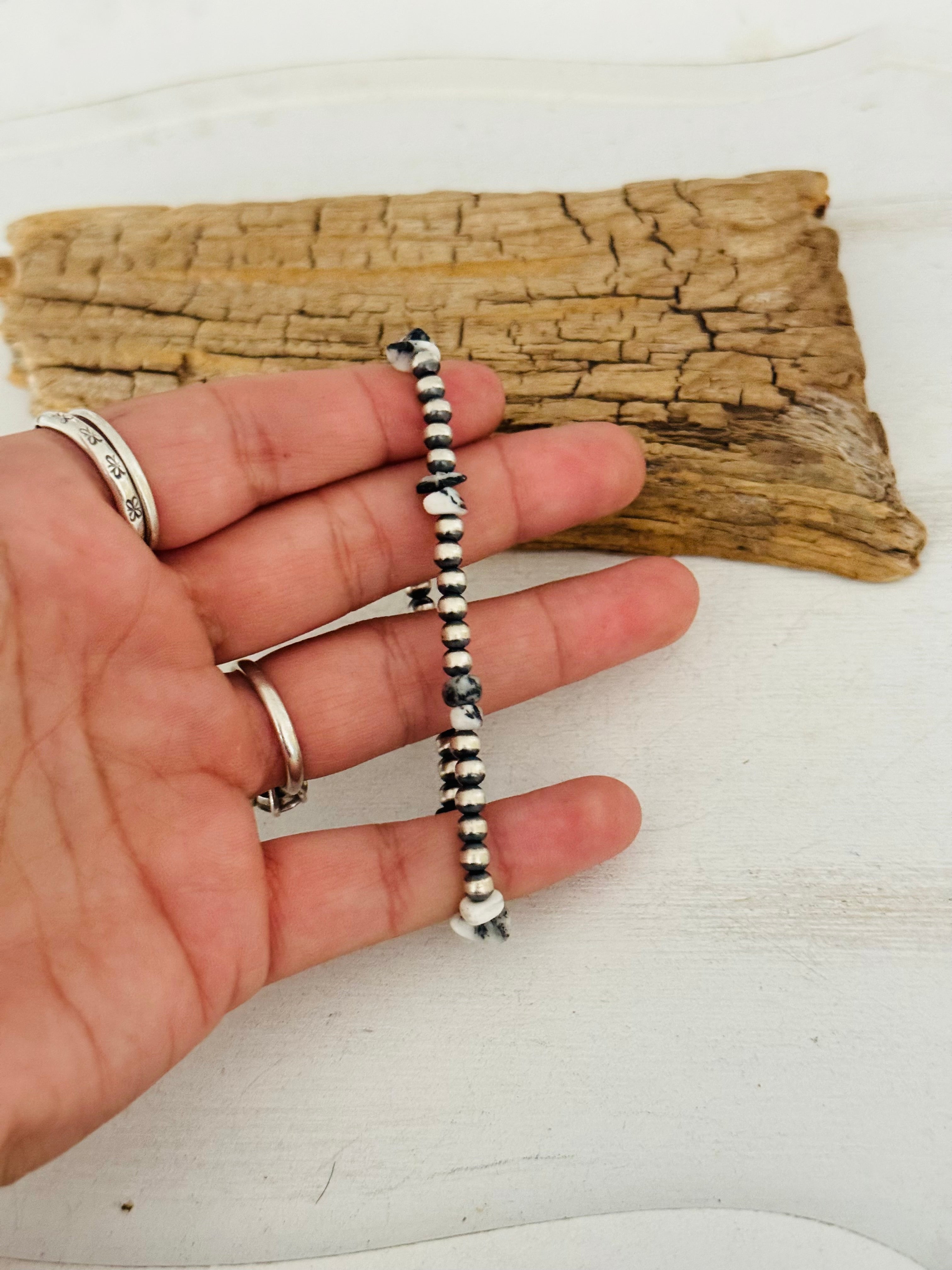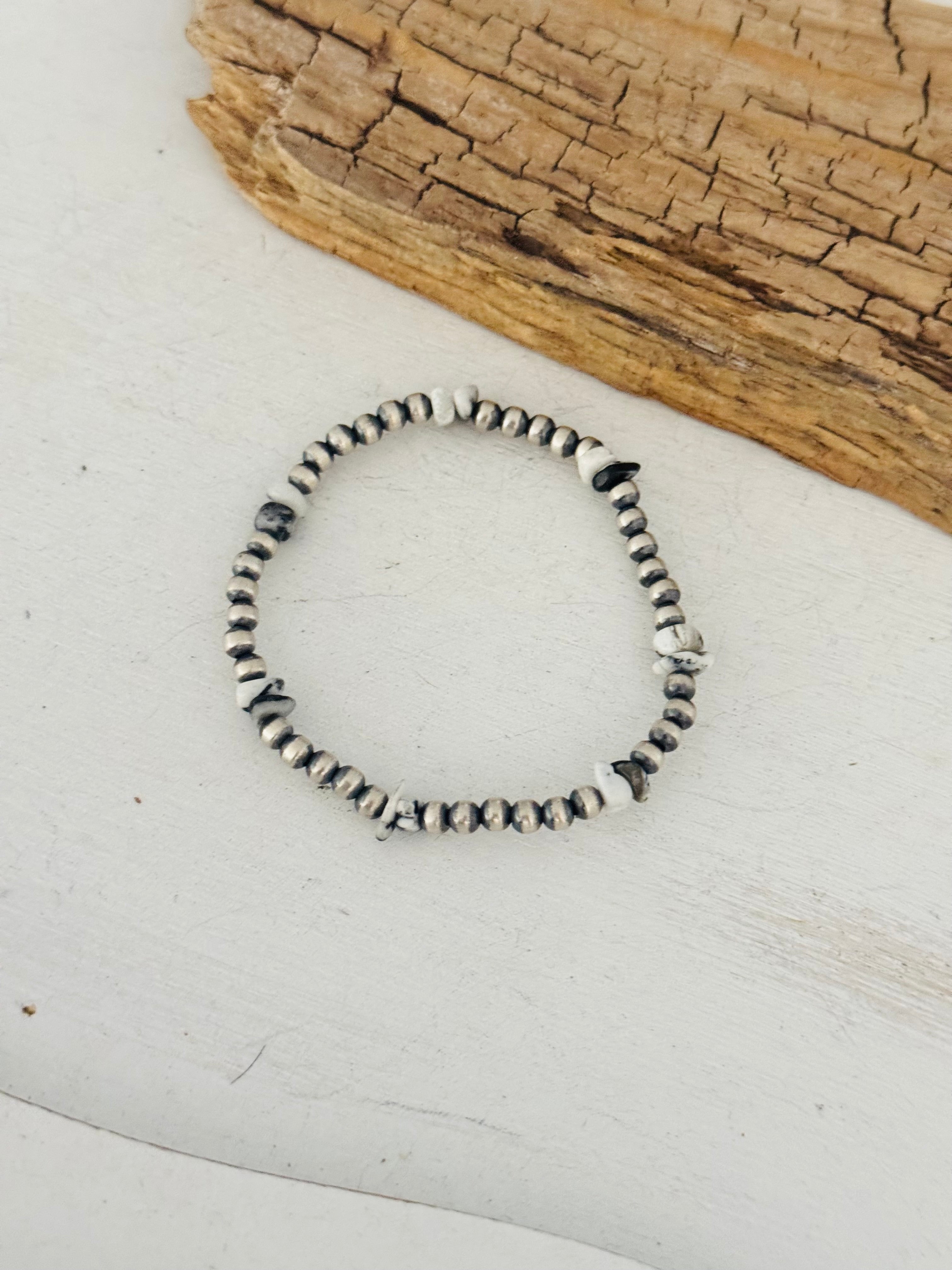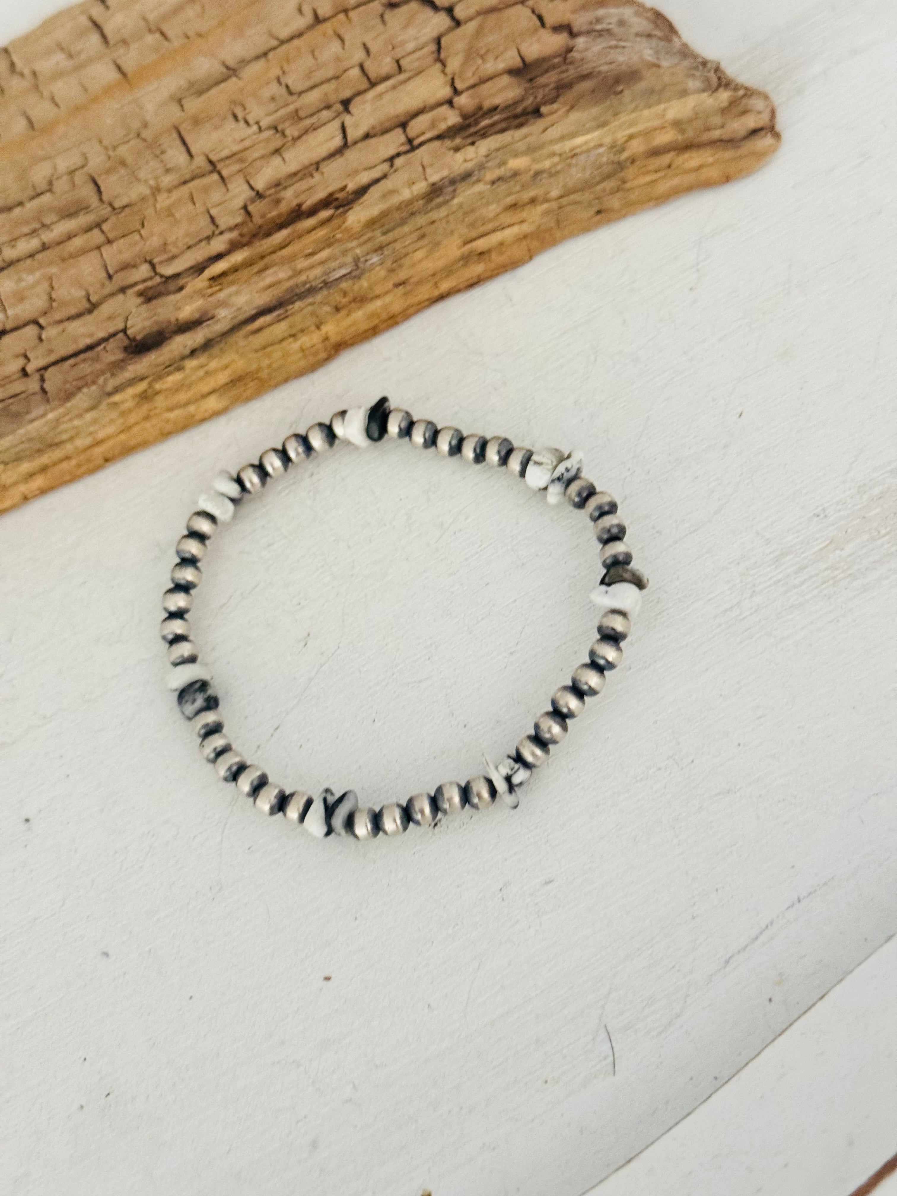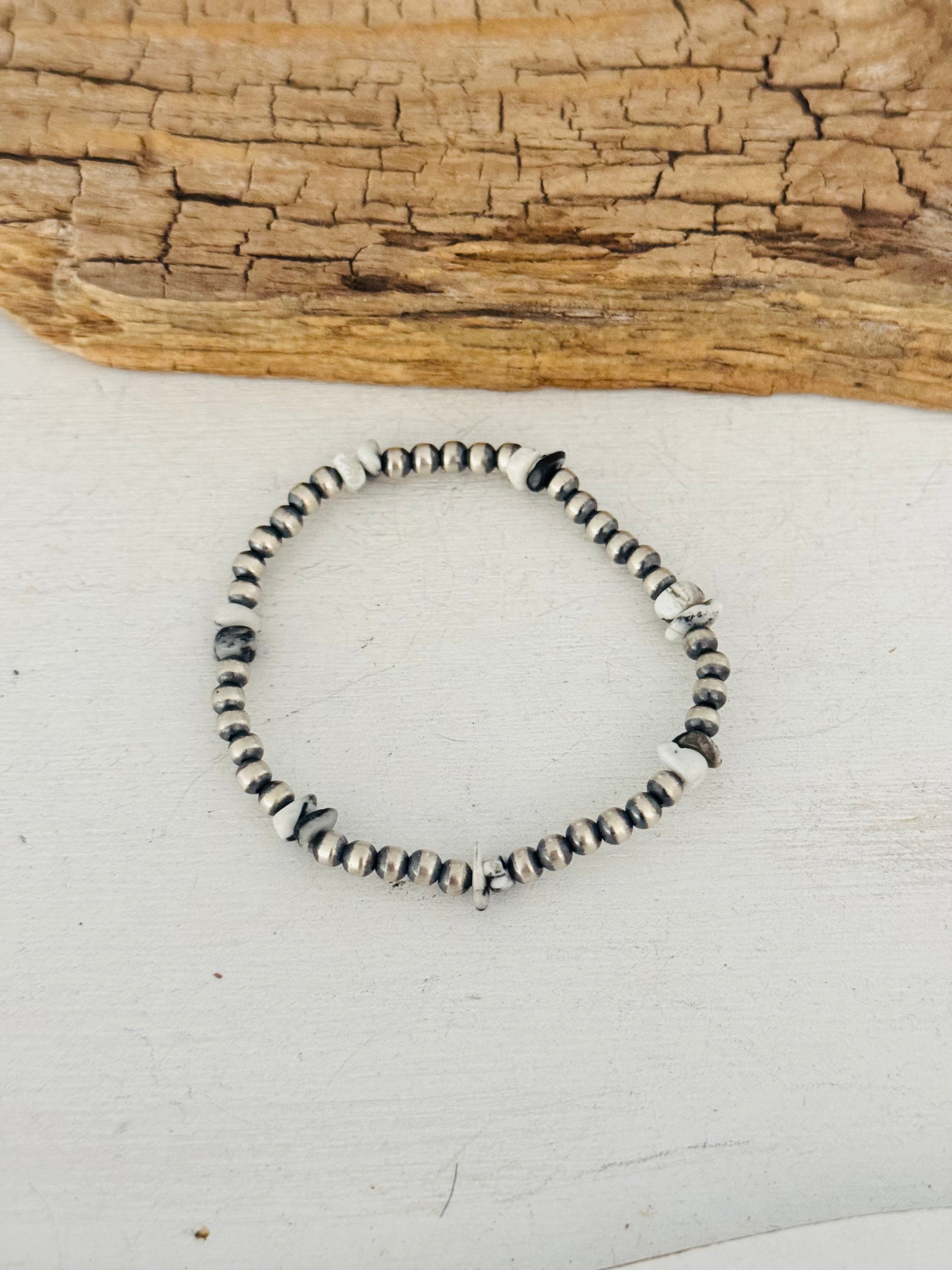 Navajo Strung White Buffalo & Sterling Silver Pearl Beaded Stretch Bracelet. It measures 7 inches long.