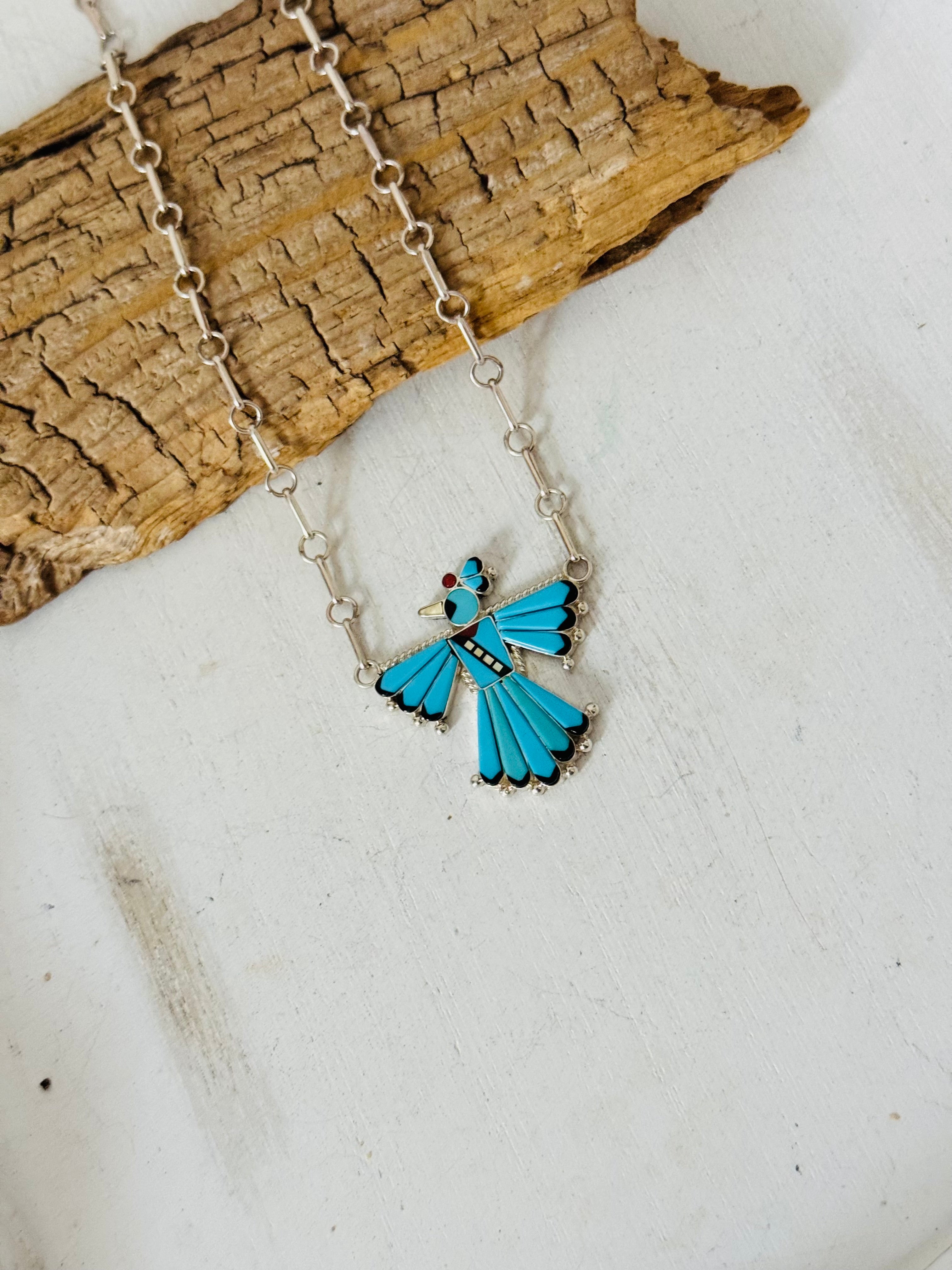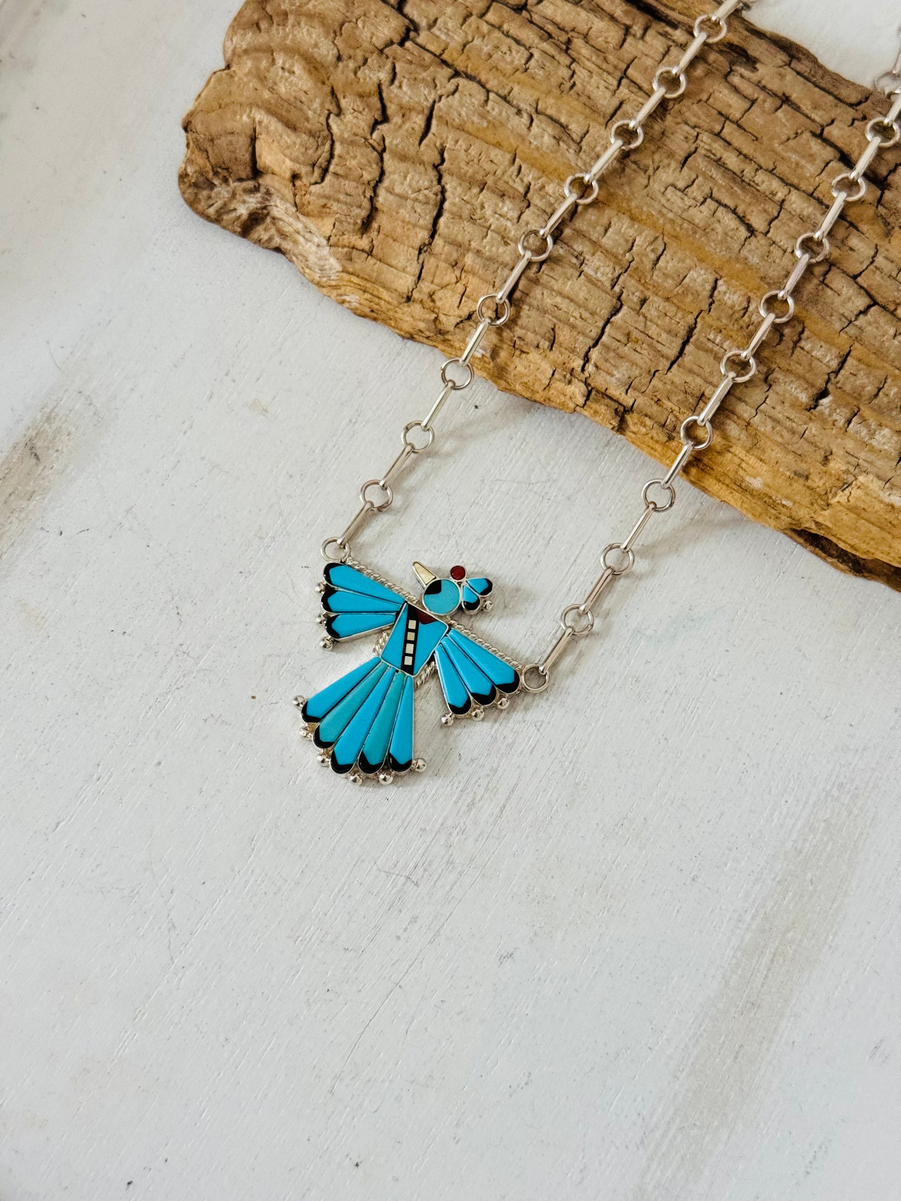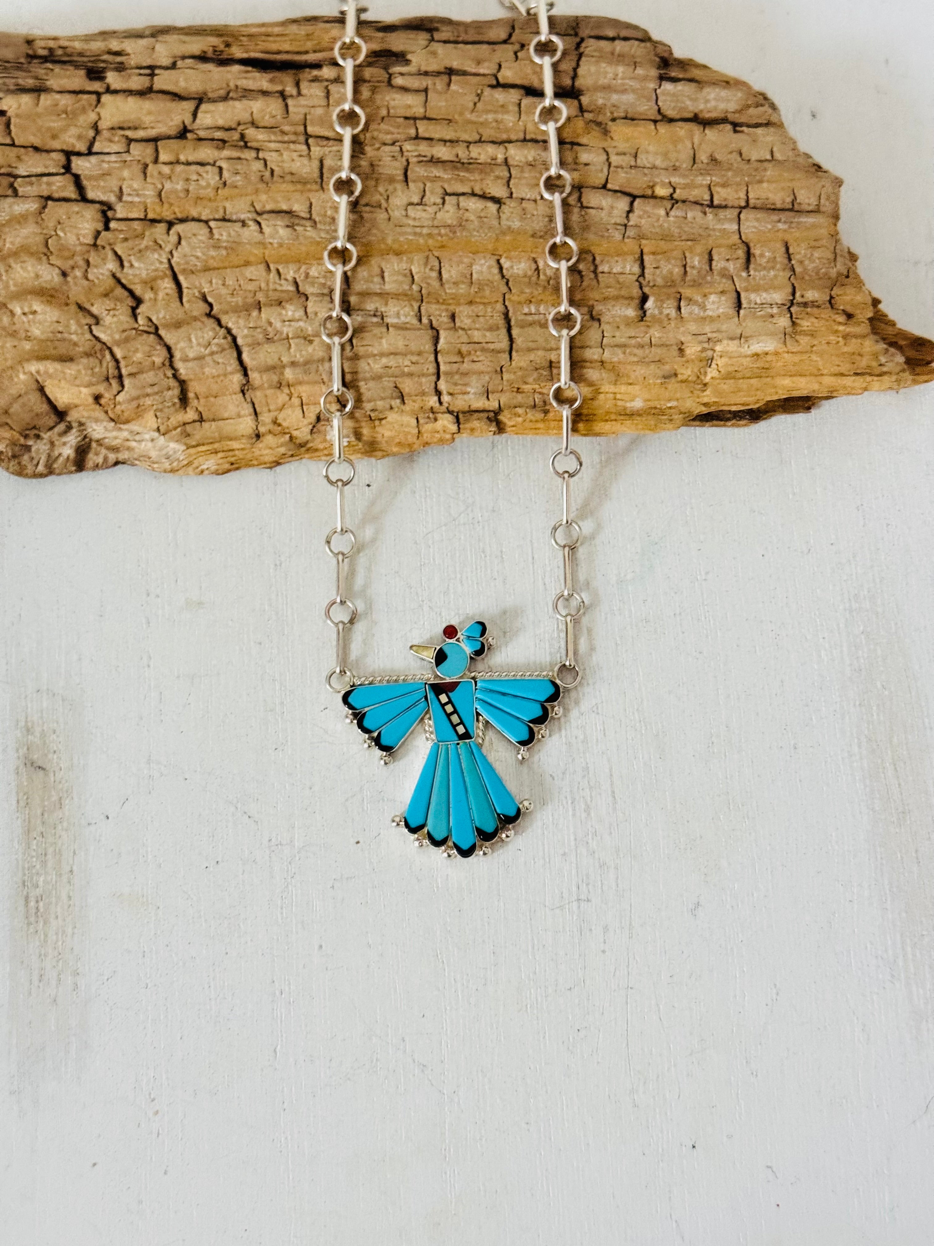 Michelle Pena Multi Stone & Sterling Silver Thunderbird Inlay Necklace. It measures just under 20 inches long. Stamped and signed