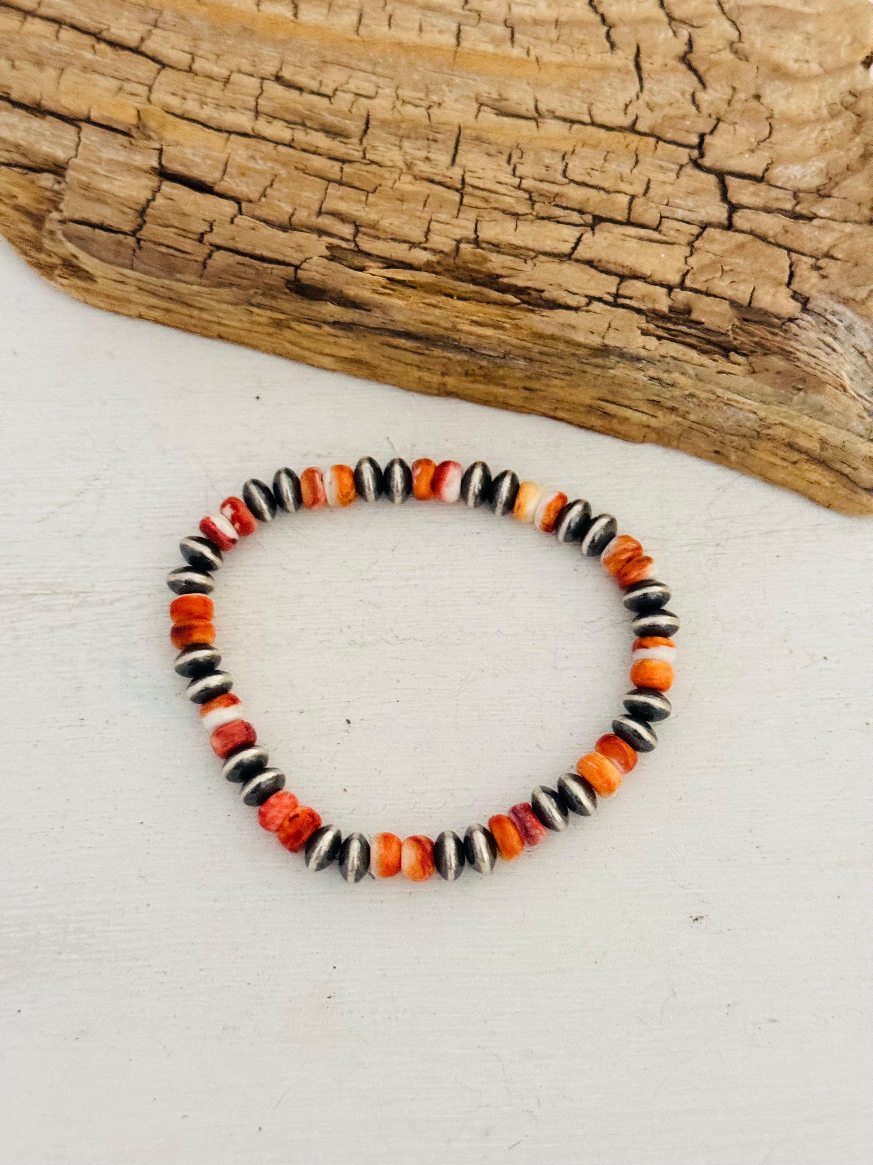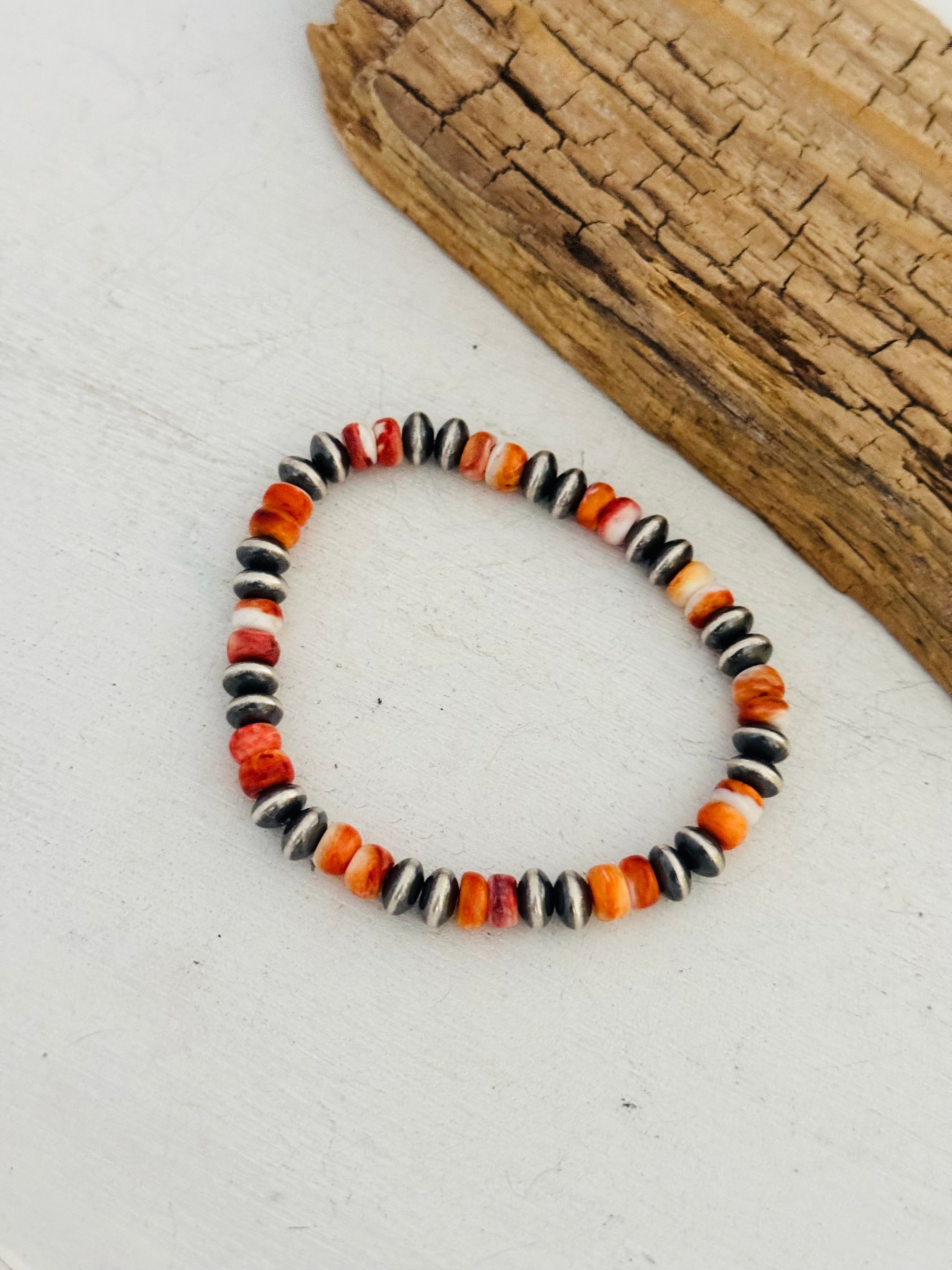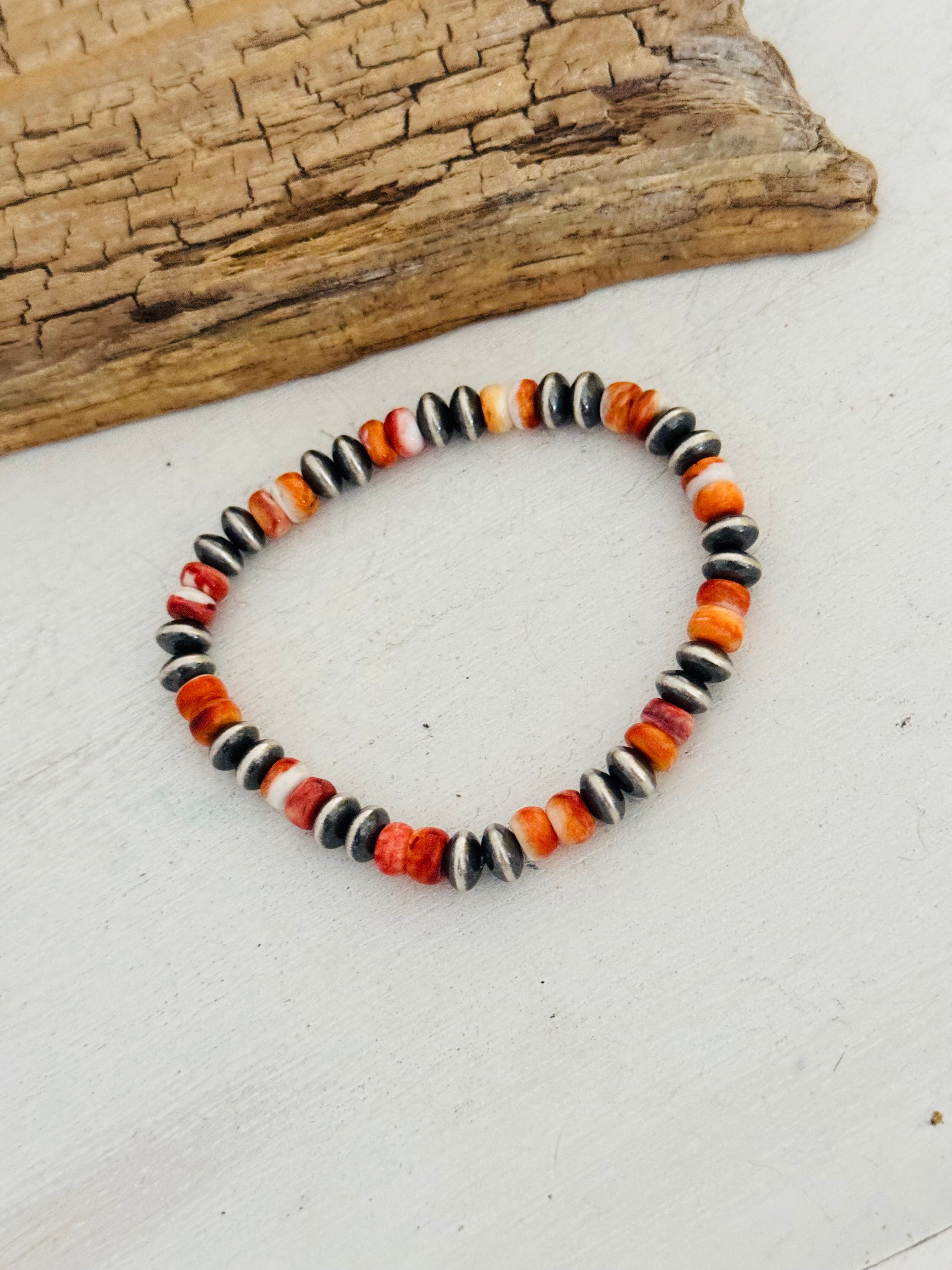 Navajo Strung Spiny Oyster & Sterling Silver Pearl Beaded Stretch Bracelet