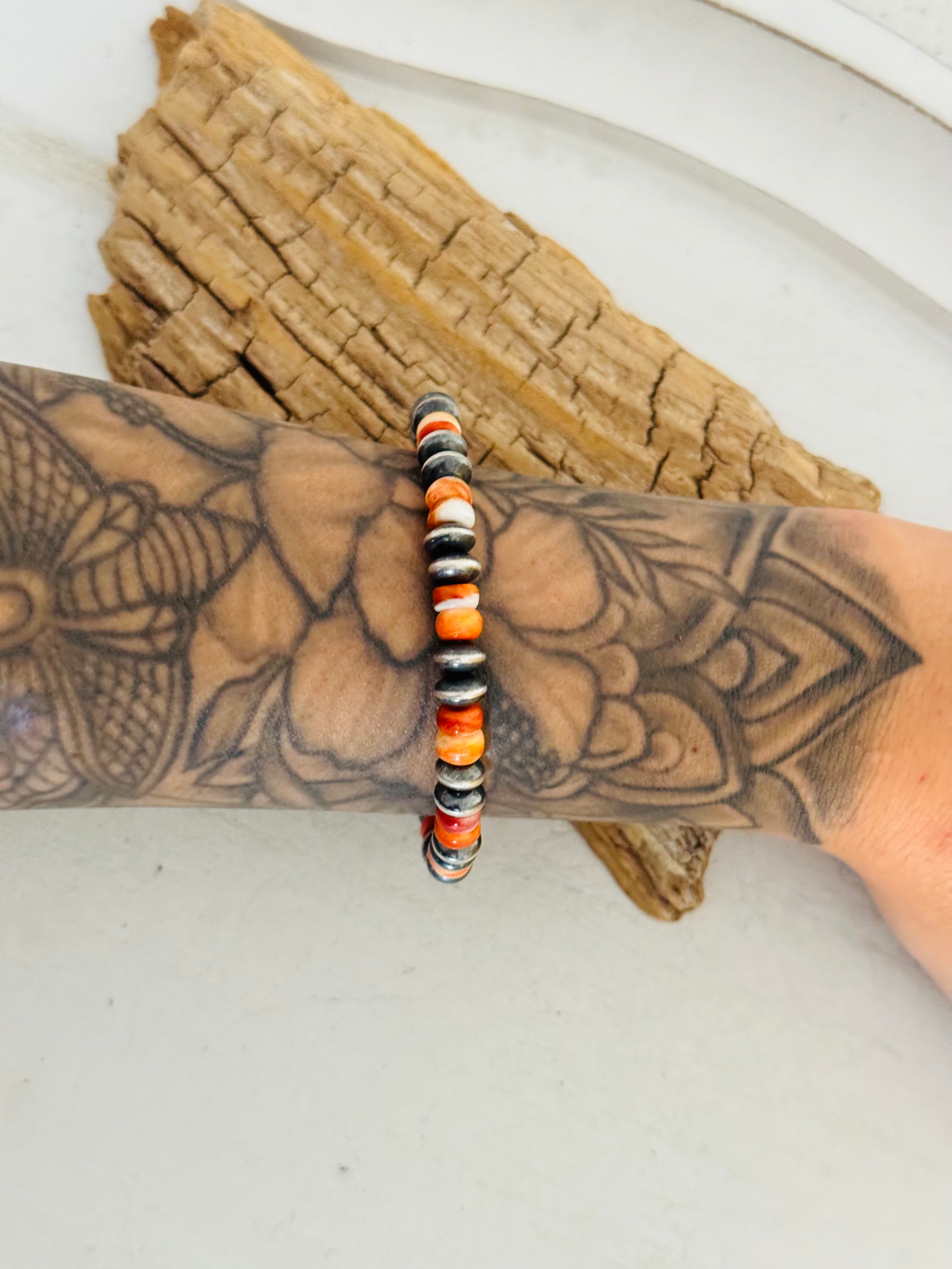 Navajo Strung Spiny Oyster & Sterling Silver Pearl Beaded Stretch Bracelet. It measures 7 inches long.