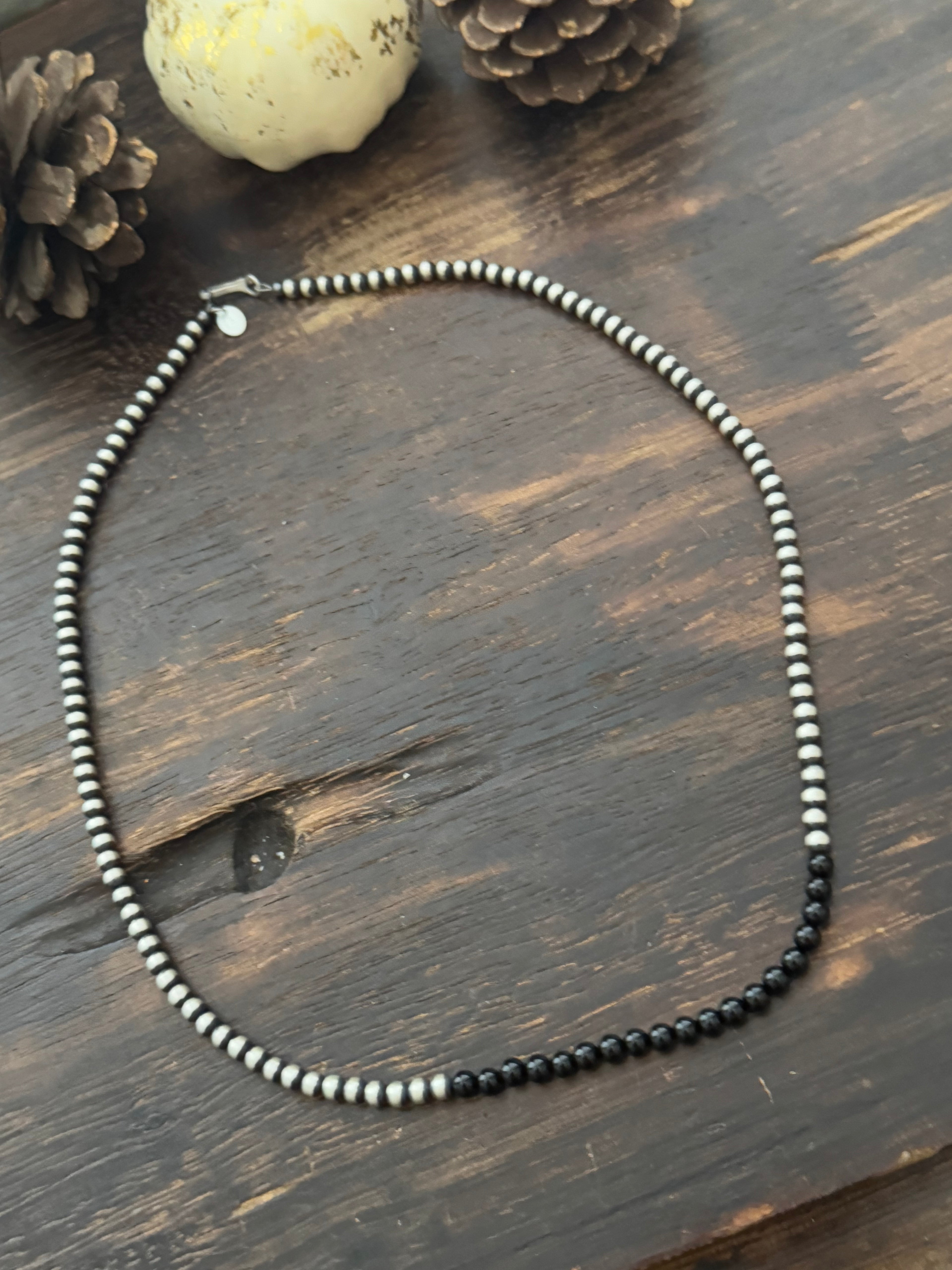 Navajo Strung Onyx & Sterling Silver Pearls Beaded Necklace