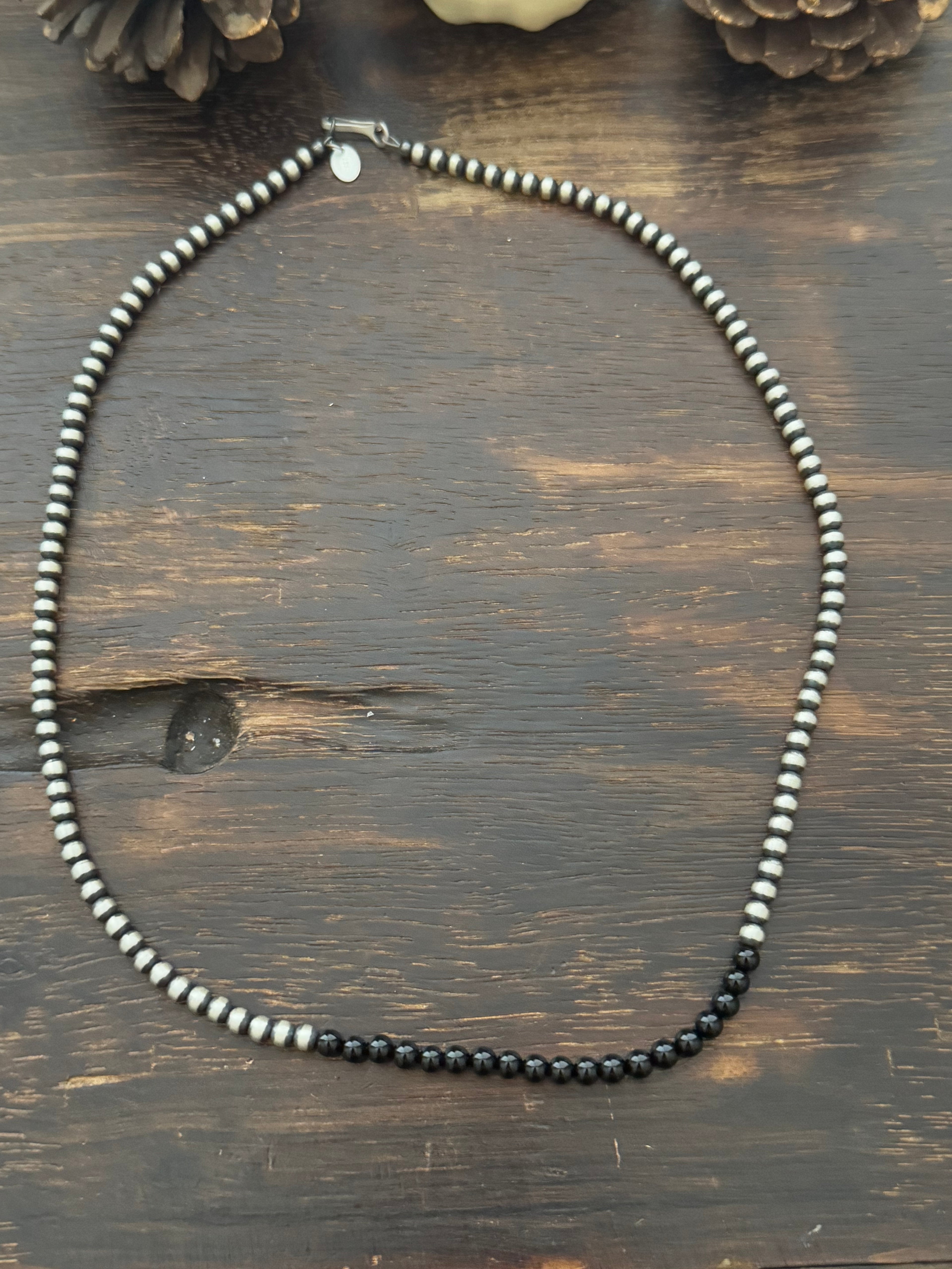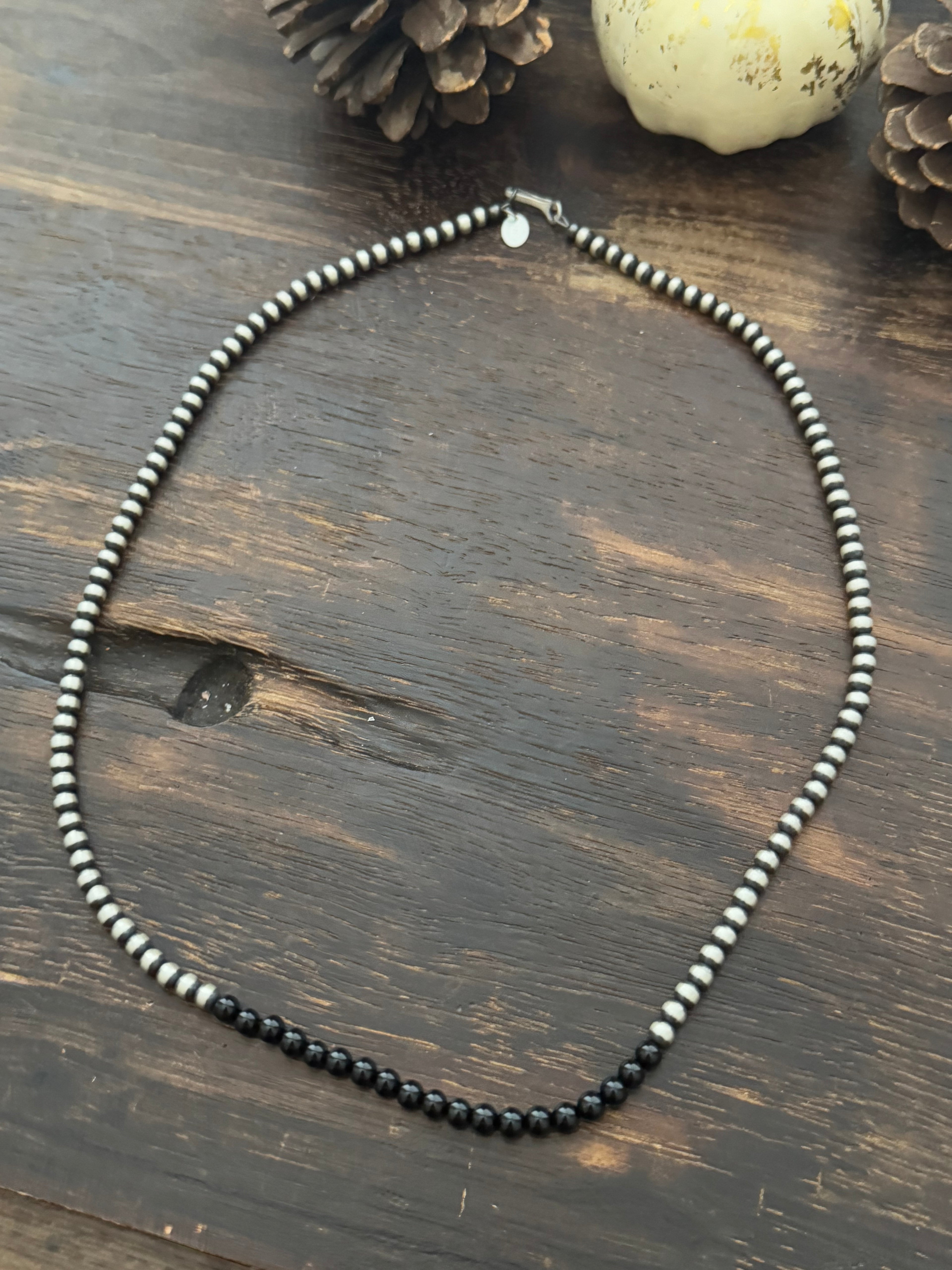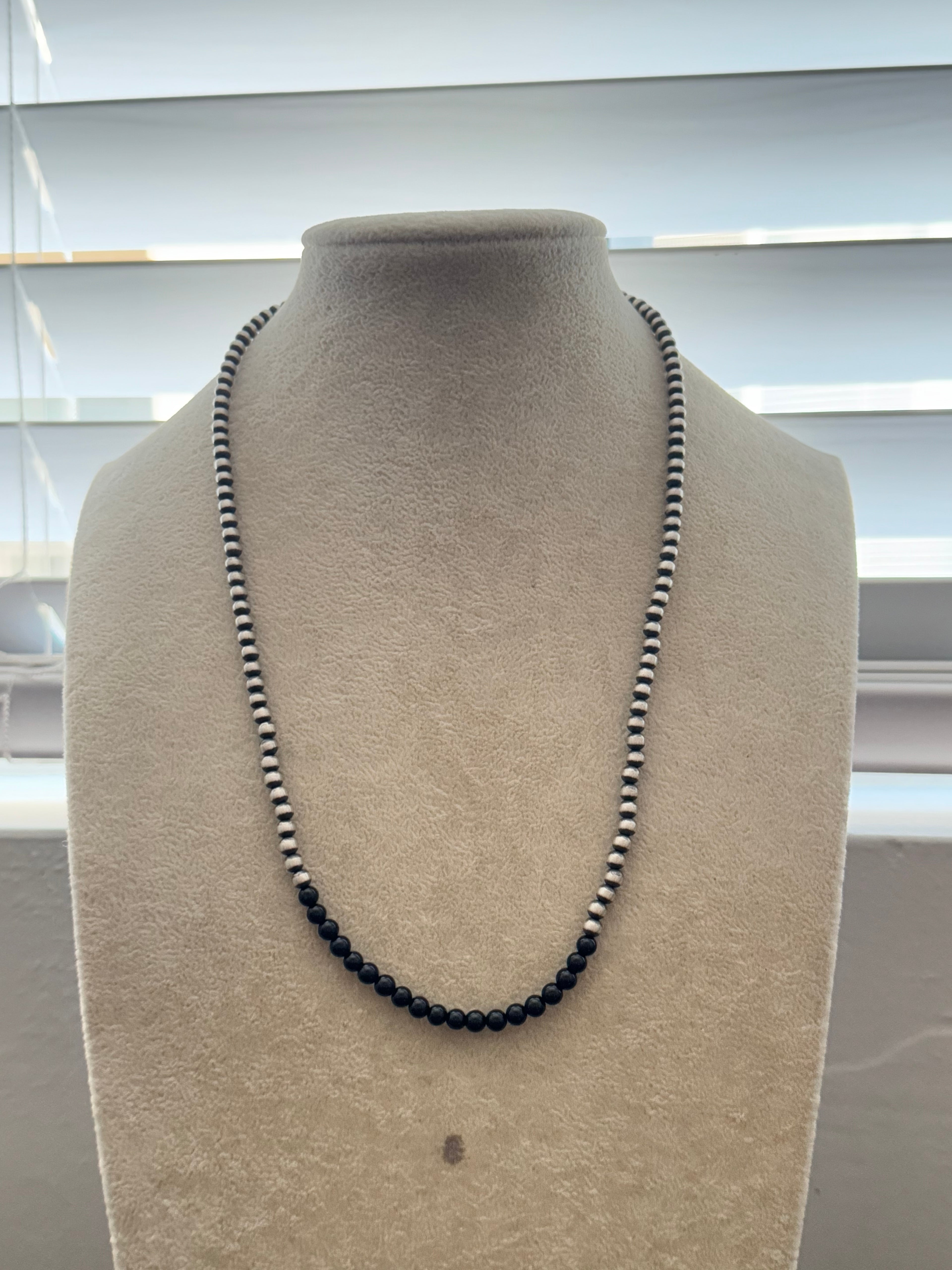 Navajo Strung Onyx & Sterling Silver Pearls Beaded Necklace. It measures 18 inches long.