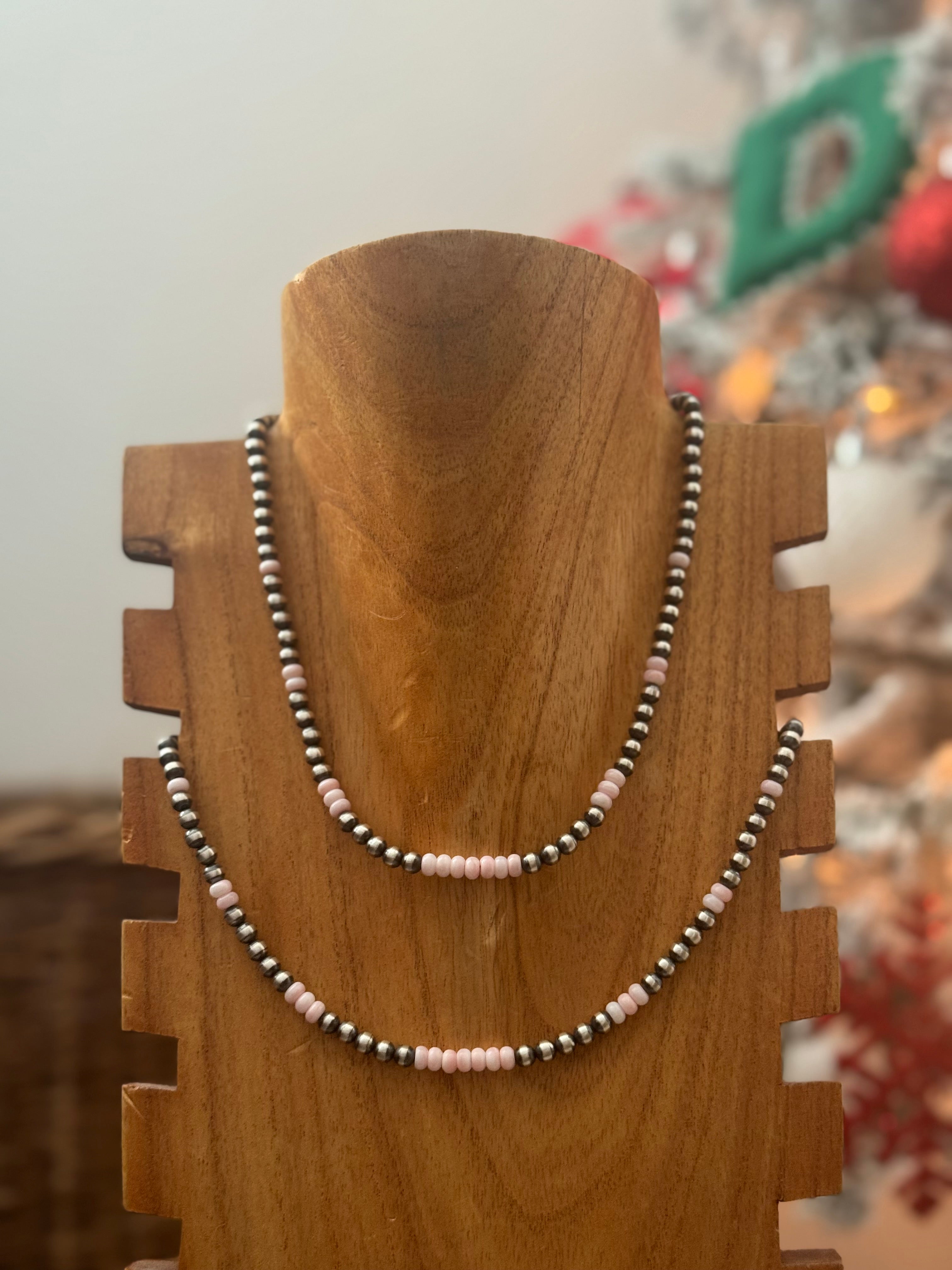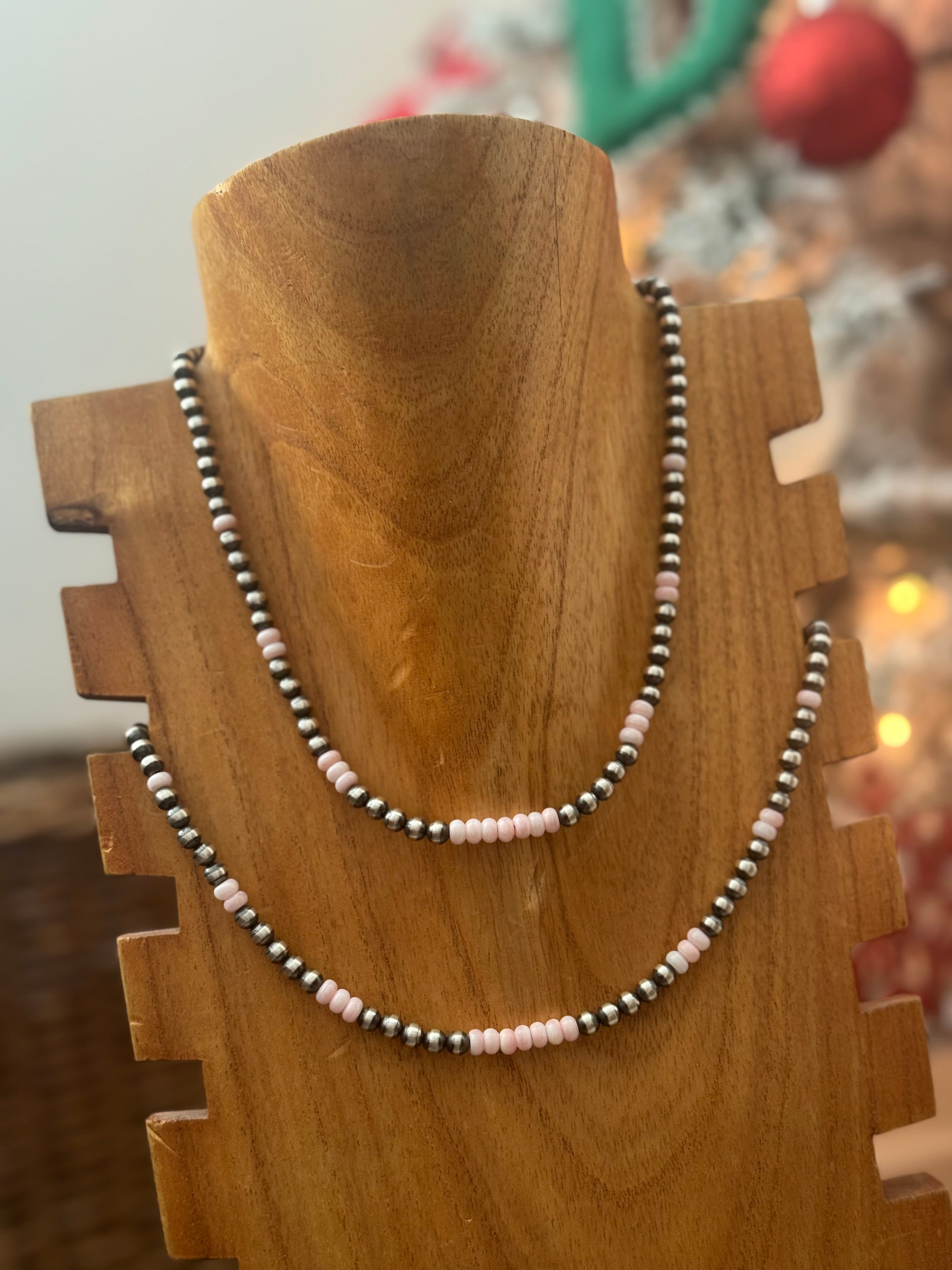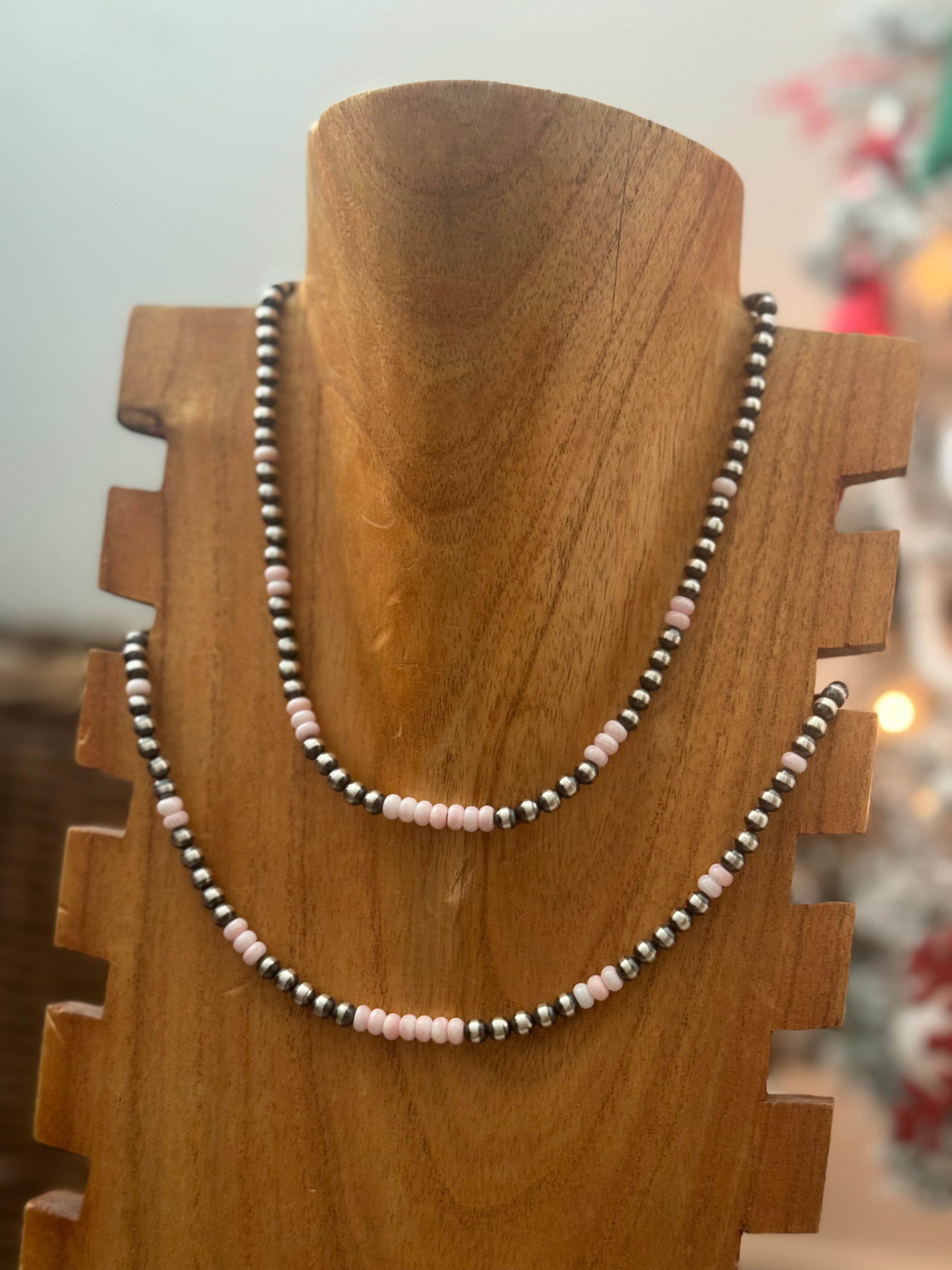 Navajo Strung Pink Conch & Sterling Silver Pearl Necklace. It measures 16 inches long.
