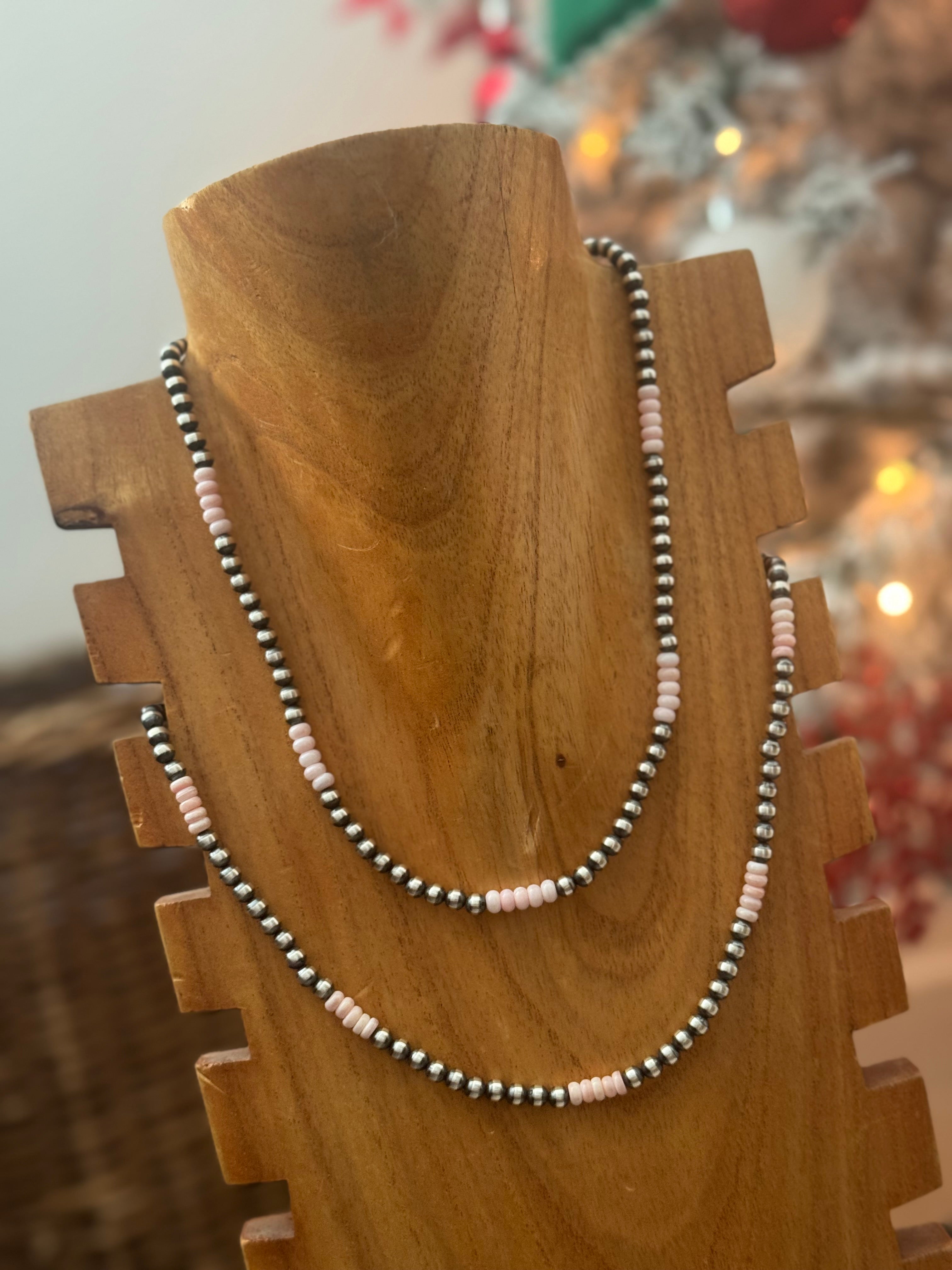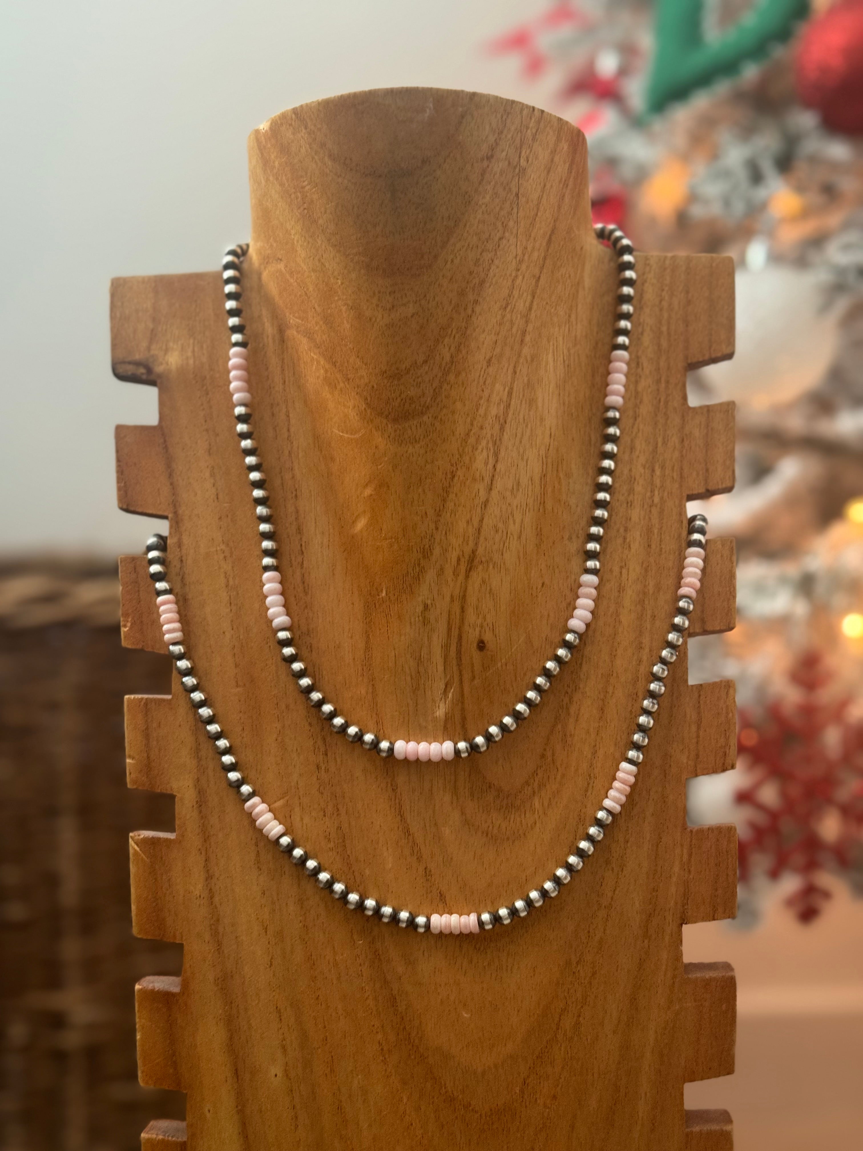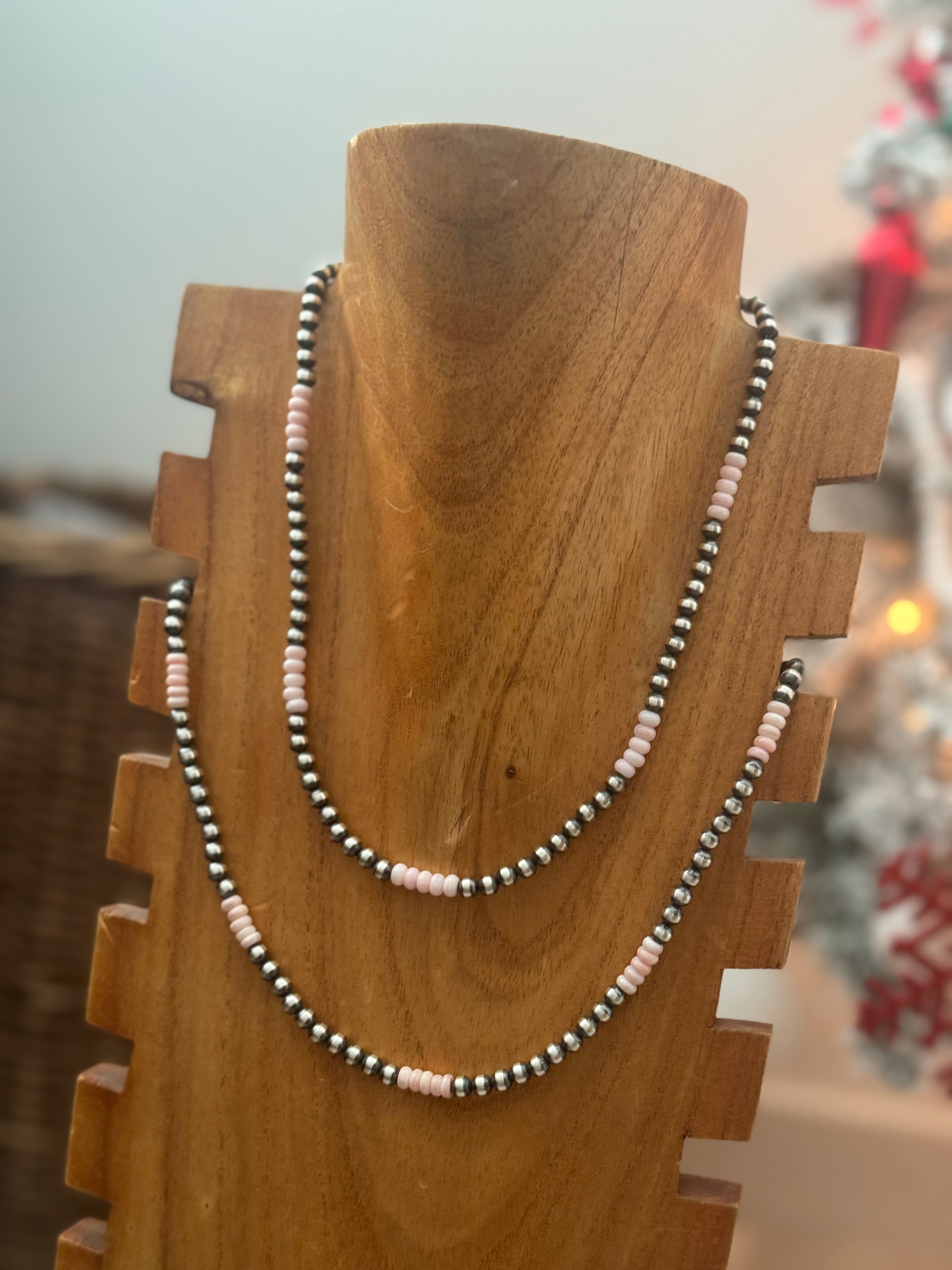 Navajo Strung Pink Conch & Sterling Silver Pearl Necklace. It measures 18 inches long.