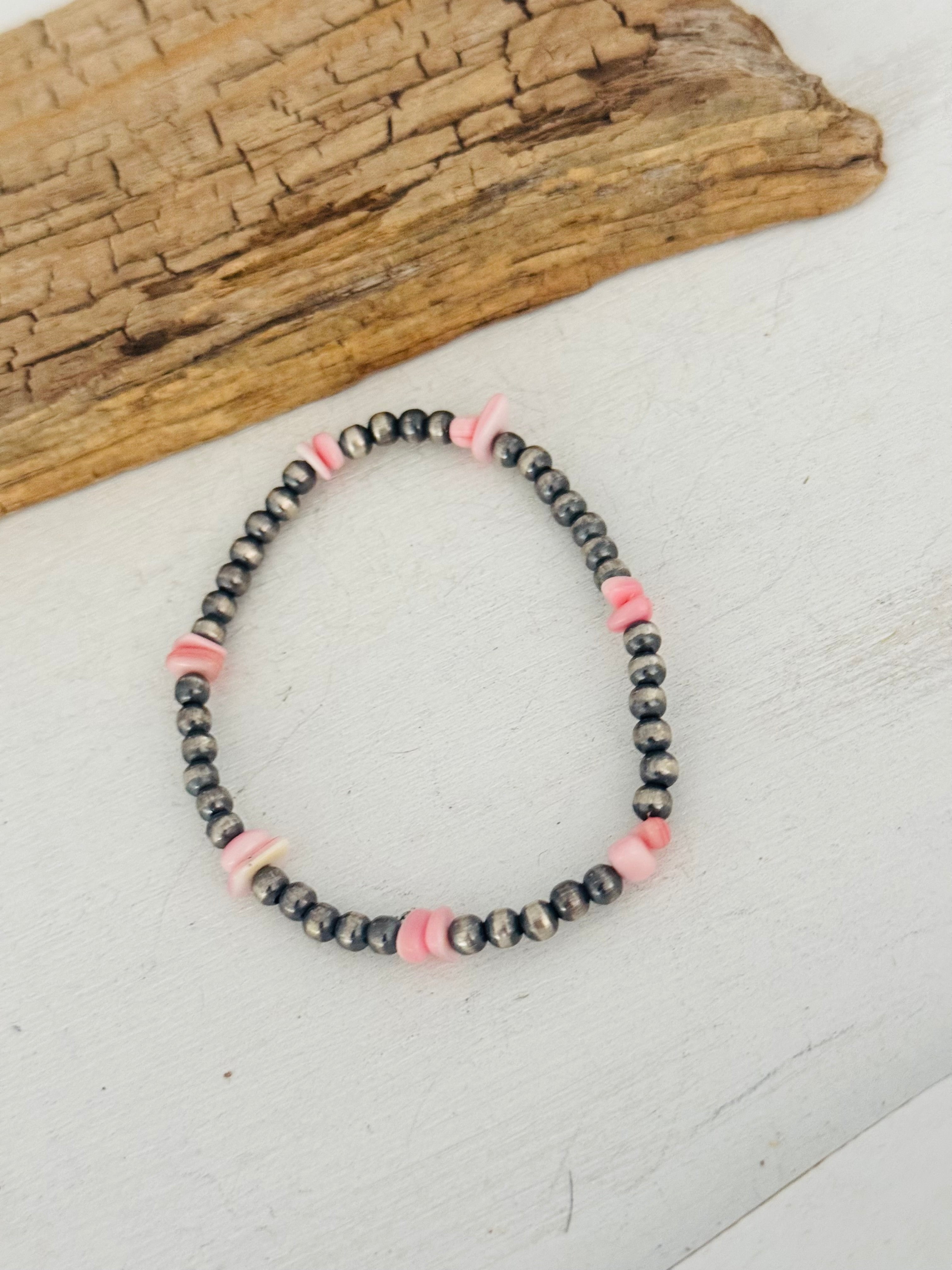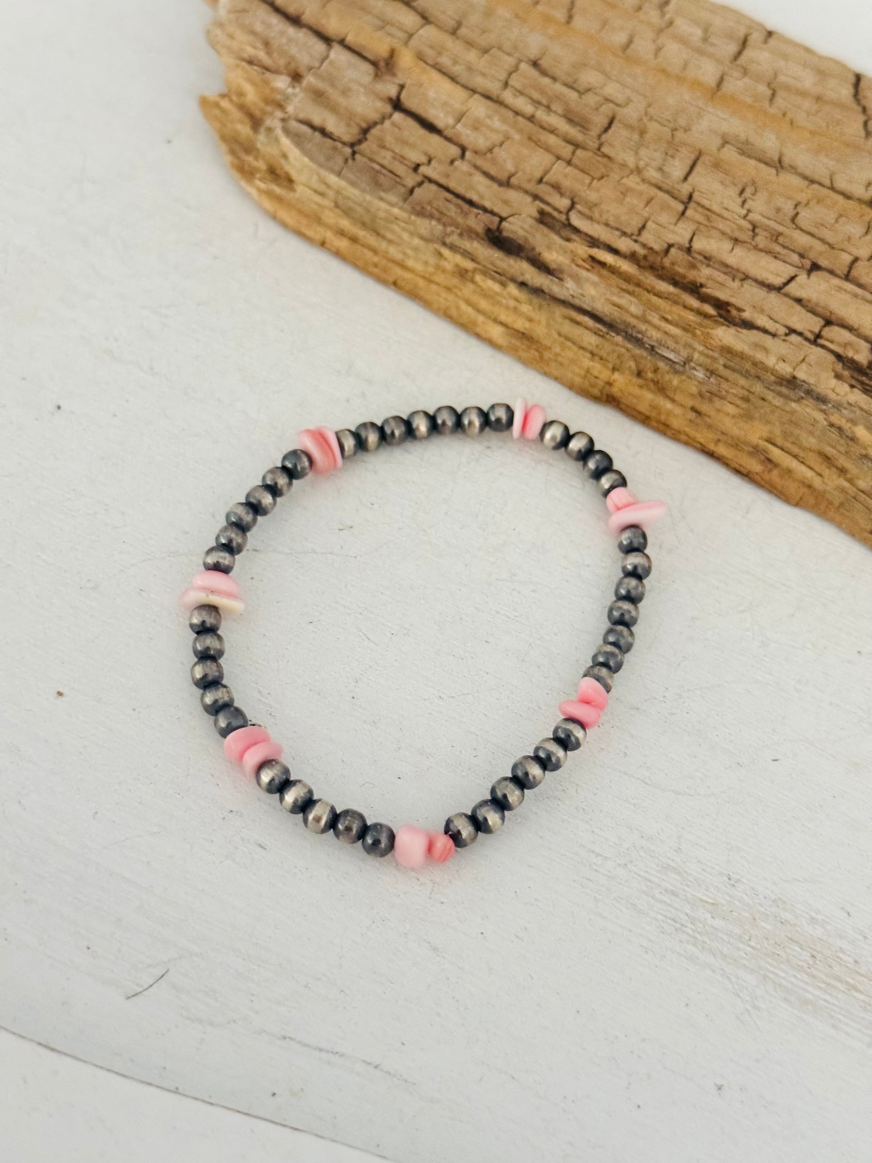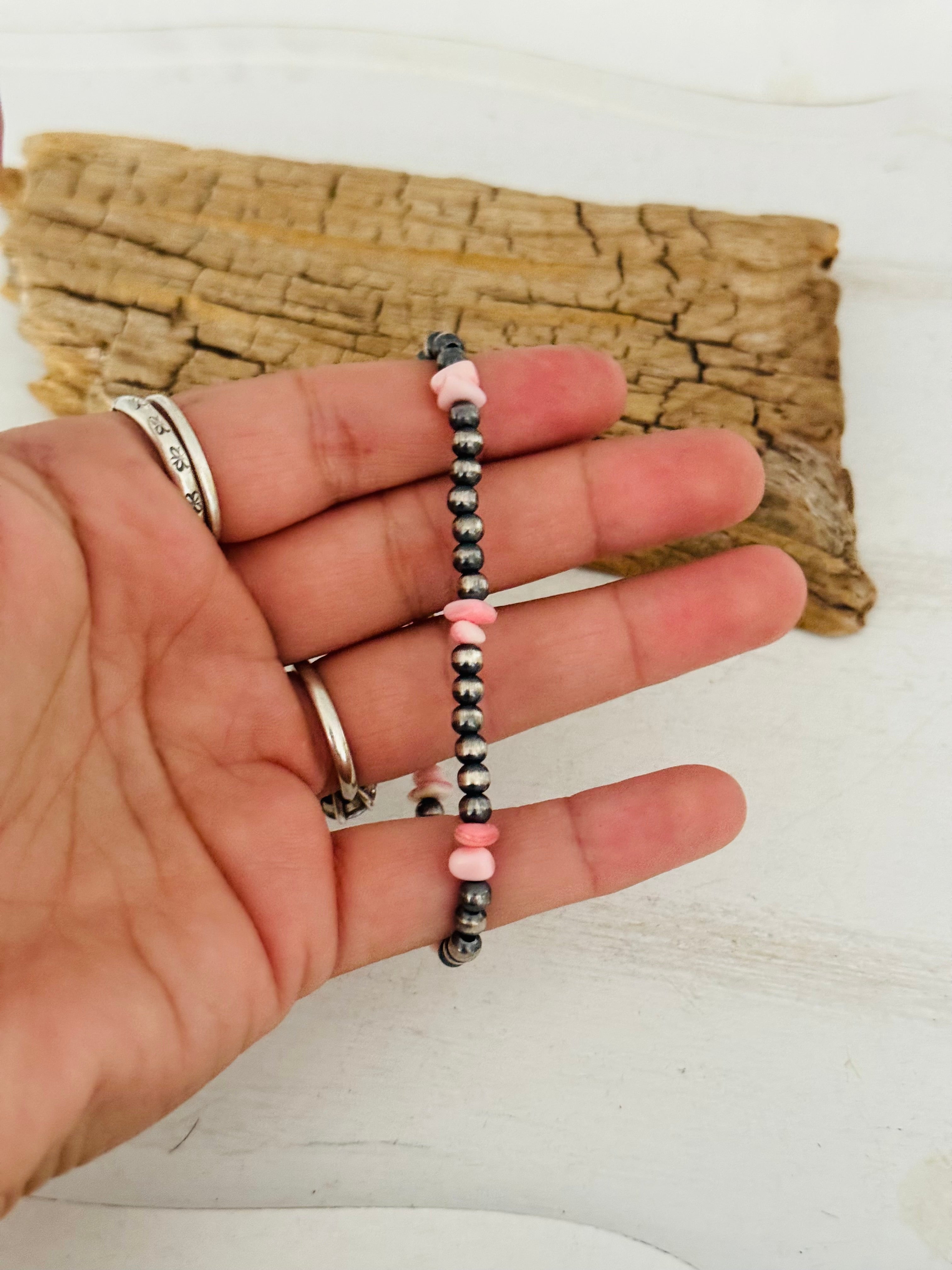 Navajo Strung Pink Conch & Sterling Silver Pearl Beaded Stretch Bracelet