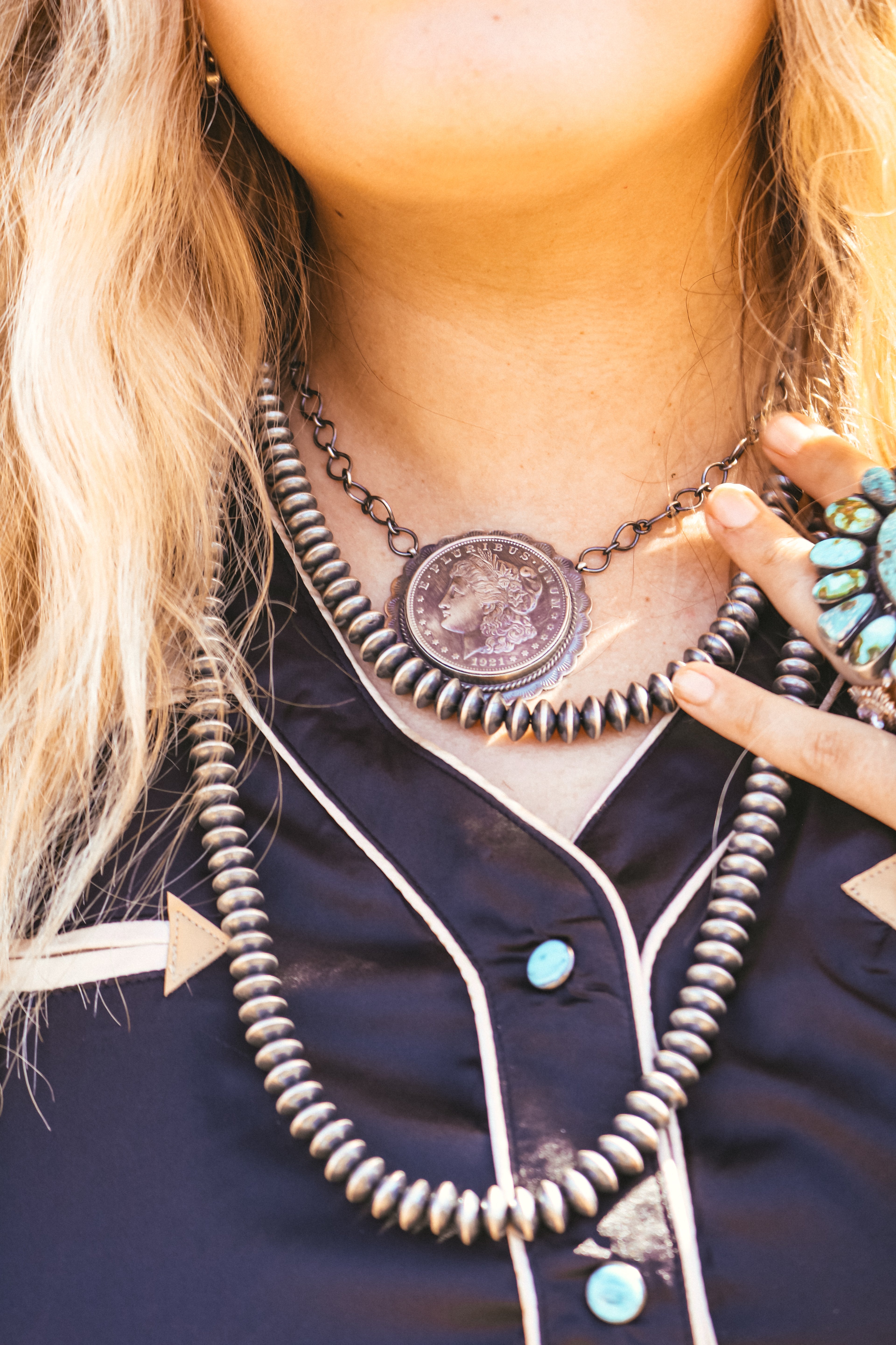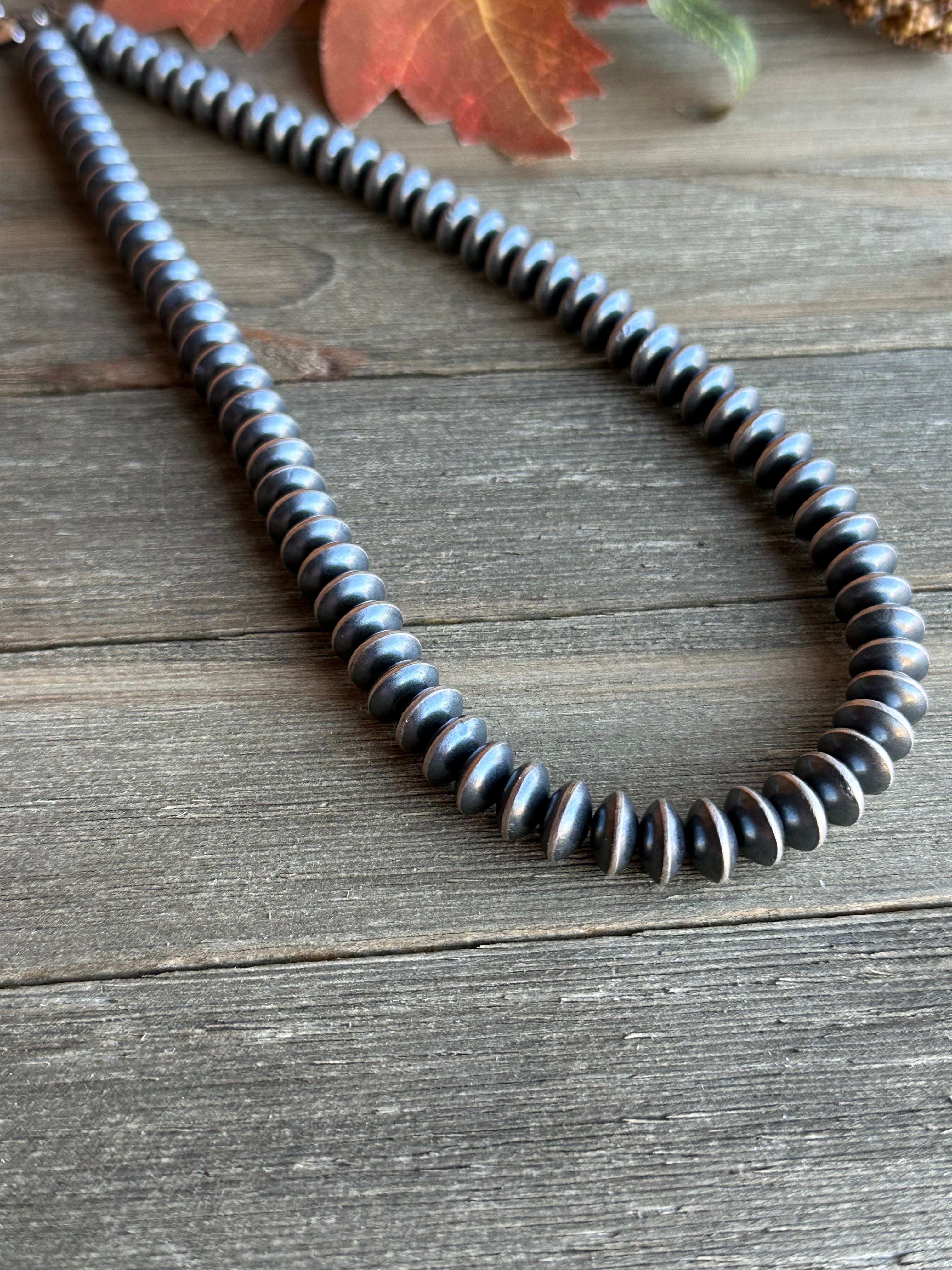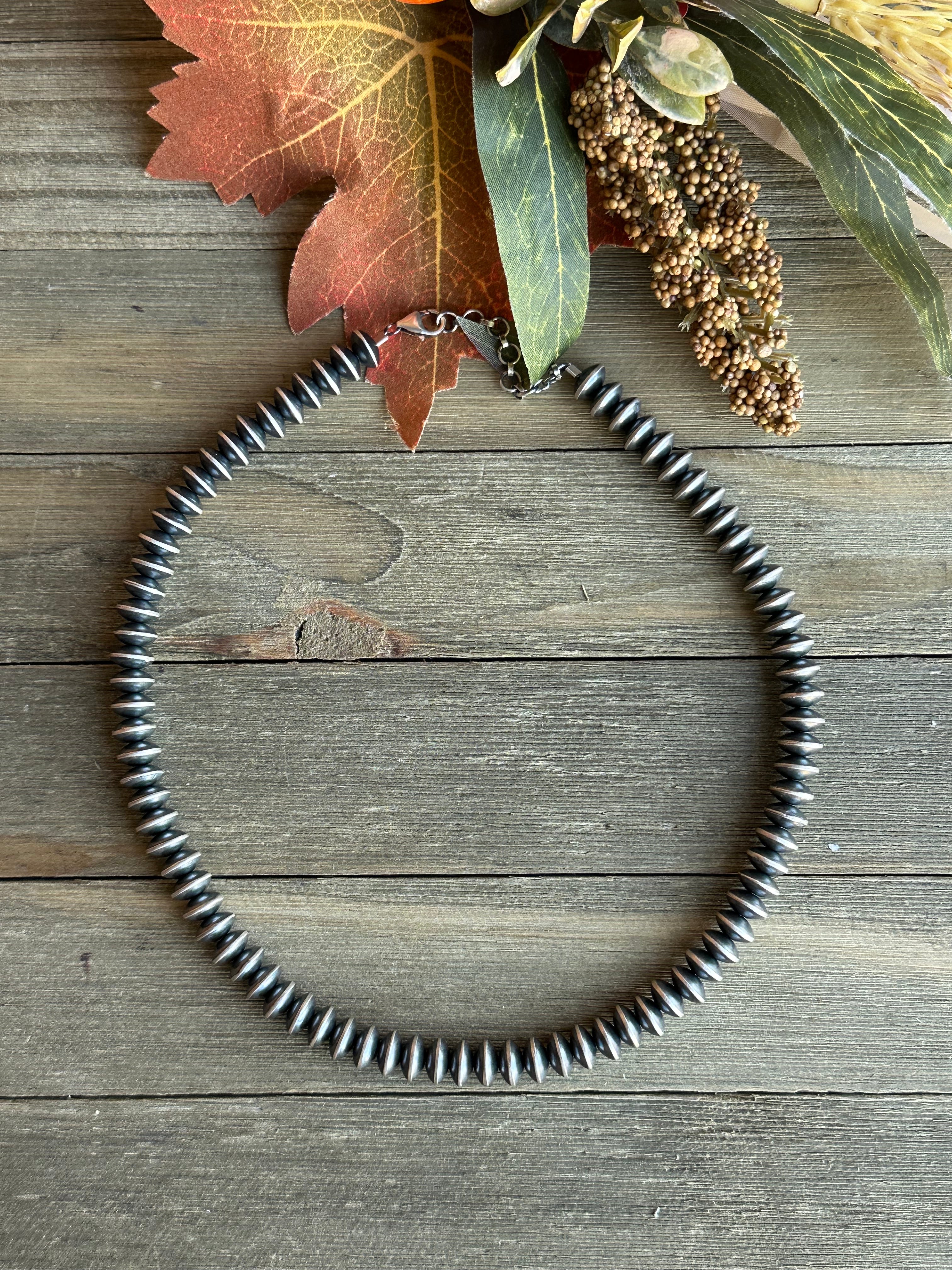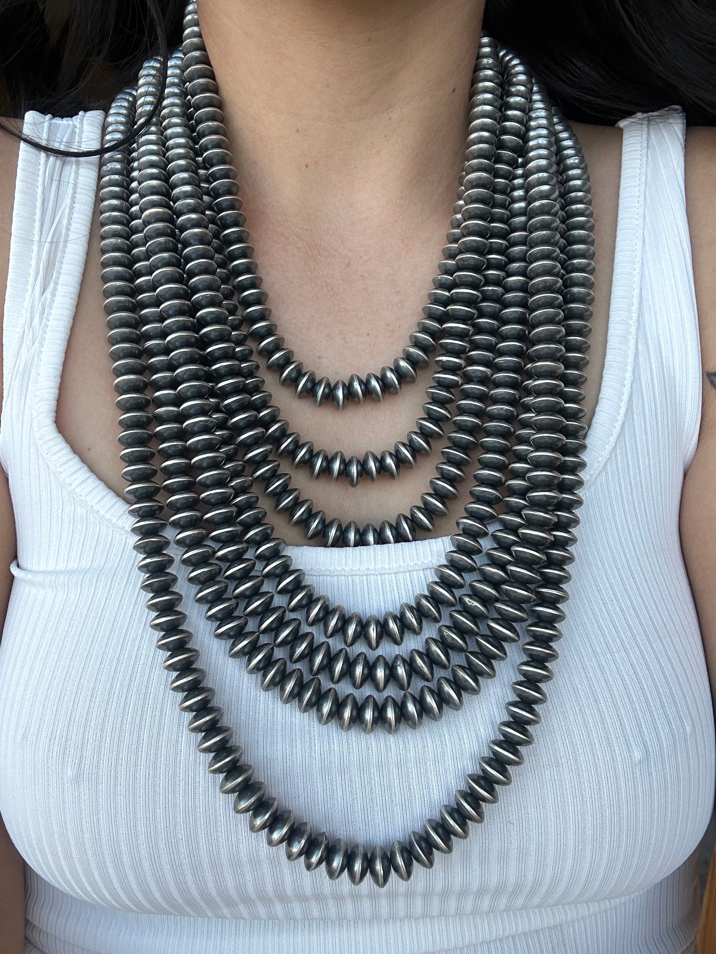 Southwest Handmade Sterling Silver 10 MM Disk Pearls Beaded Necklace. They measure between 16-28 inches long.