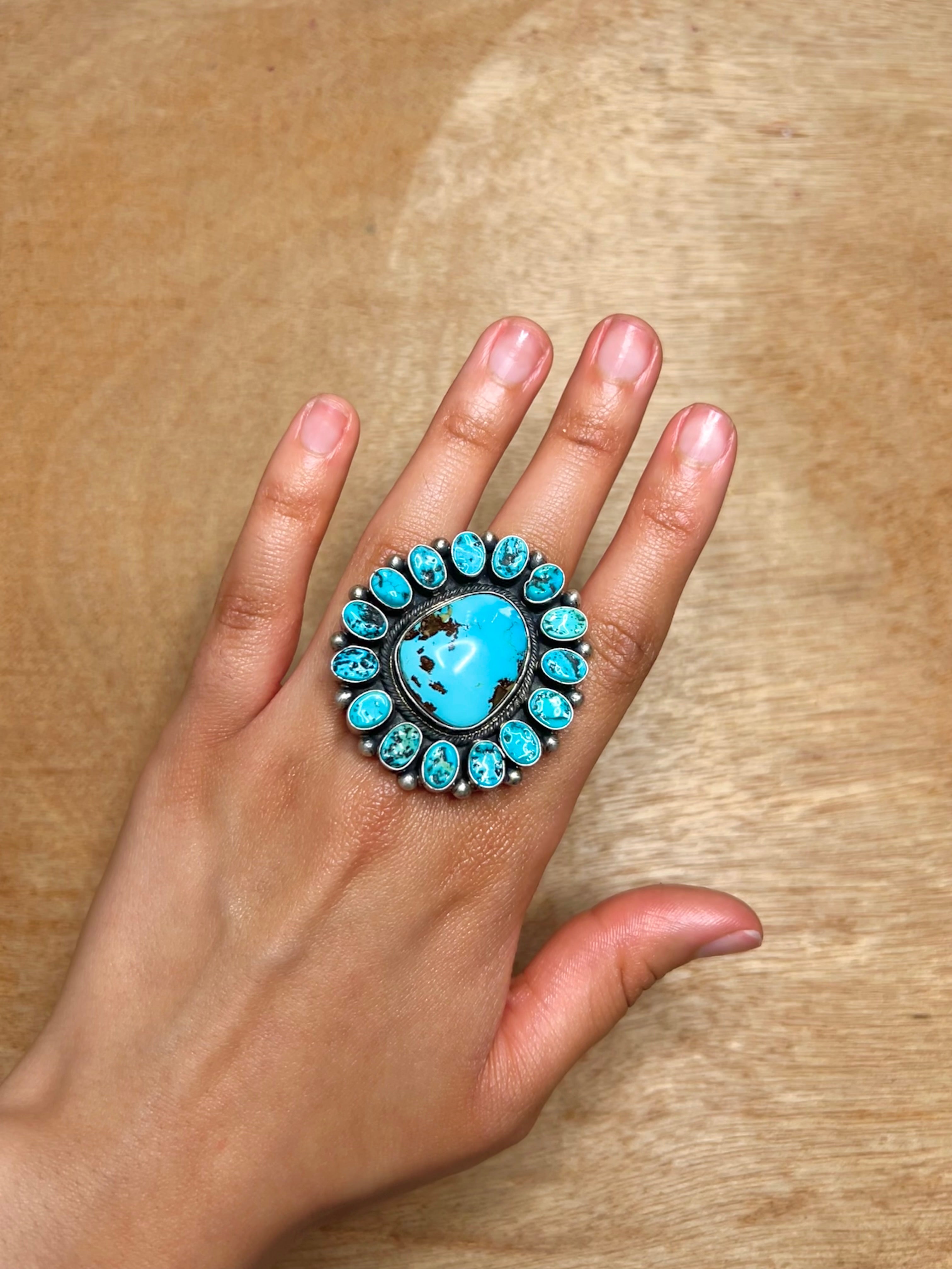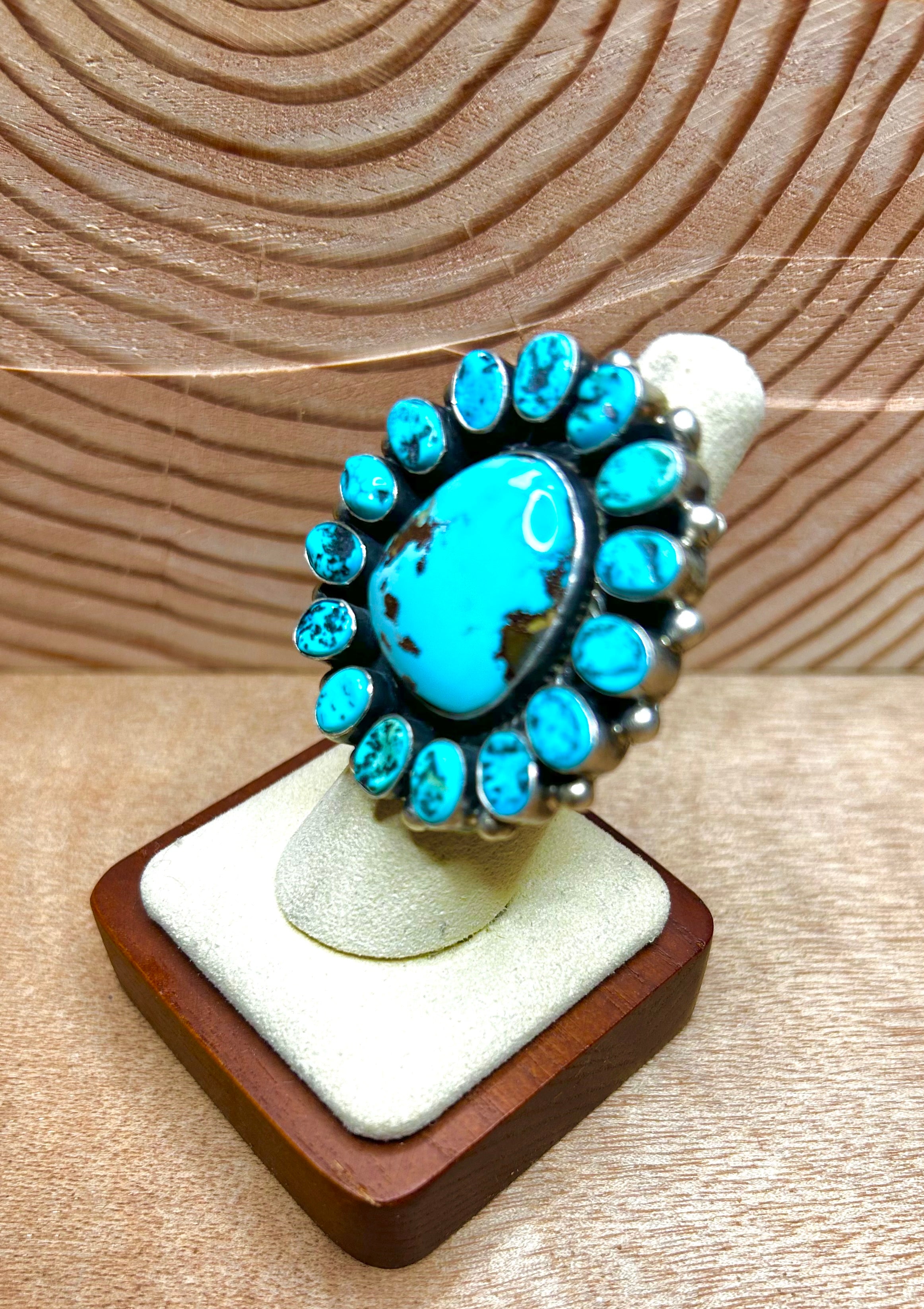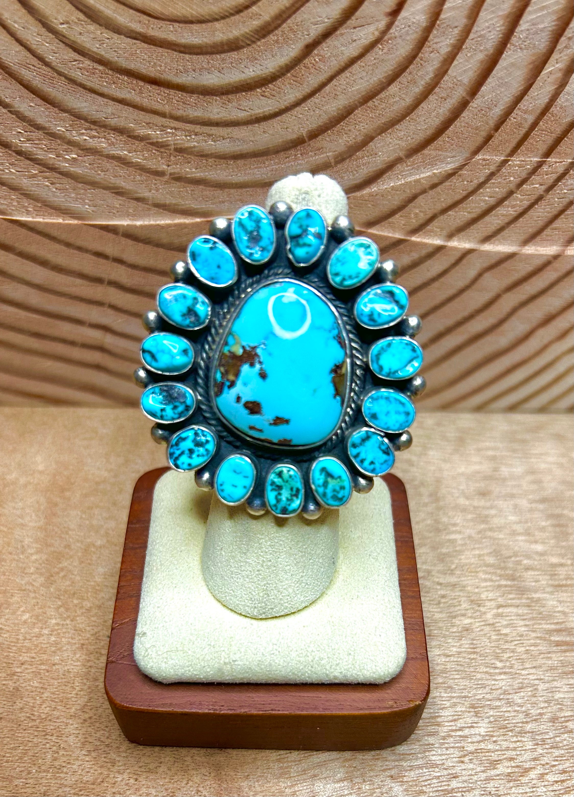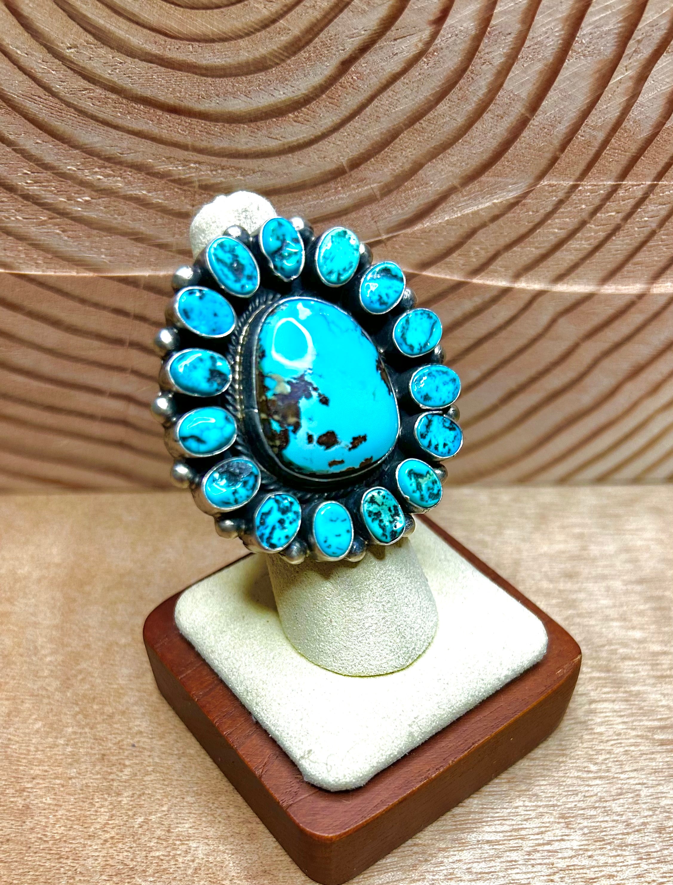 Blaine Yellowhorse Tyrone & Kingman Turquoise & Sterling Sliver Cluster Ring Size 6.75