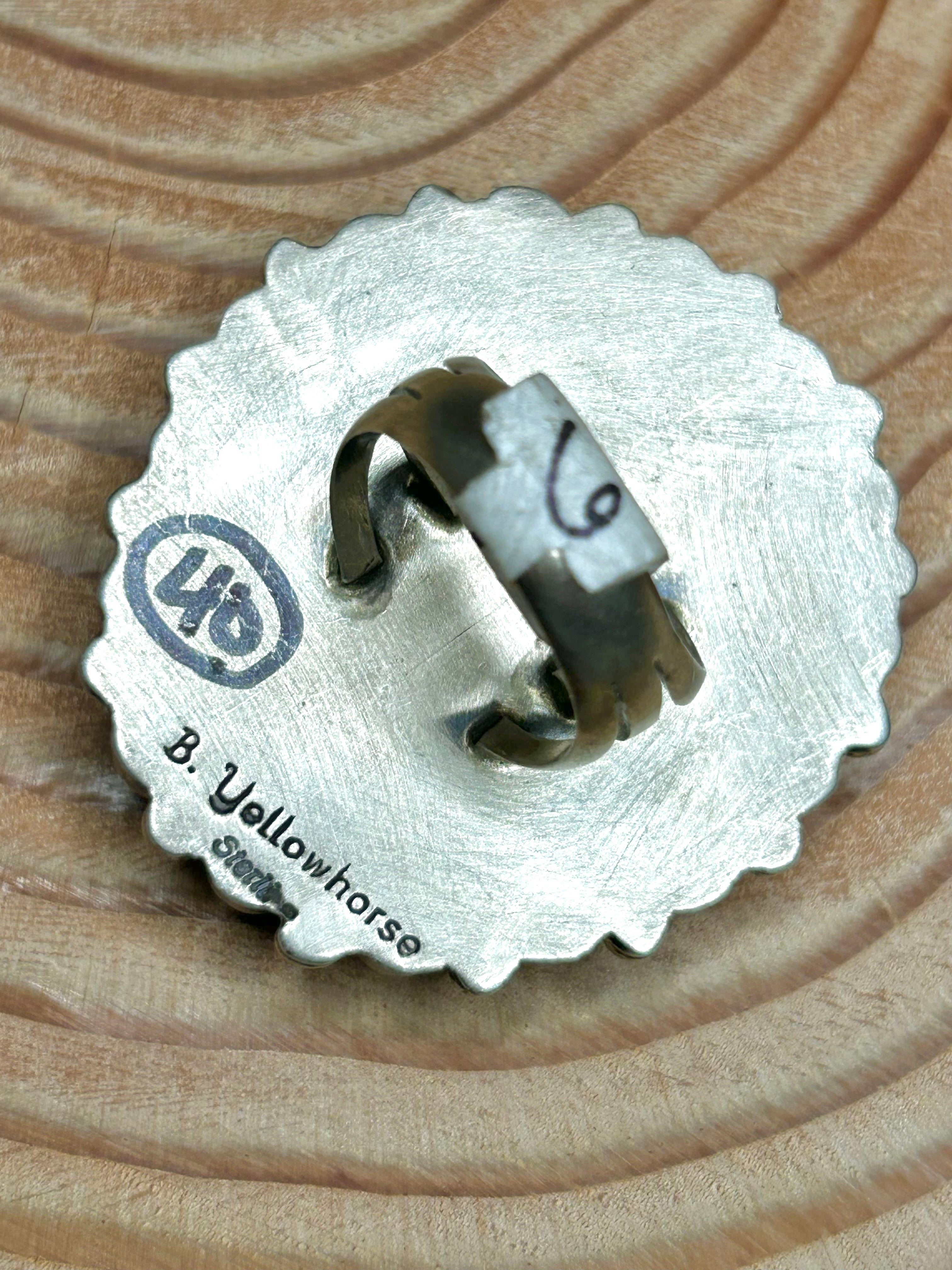 Blaine Yellowhorse Tyrone & Kingman Turquoise & Sterling Sliver Cluster Ring Size 6.75. It measures 1 3/4 inches long and 1 5/8 inches wide. Signed by the artist and stamped sterling silver.