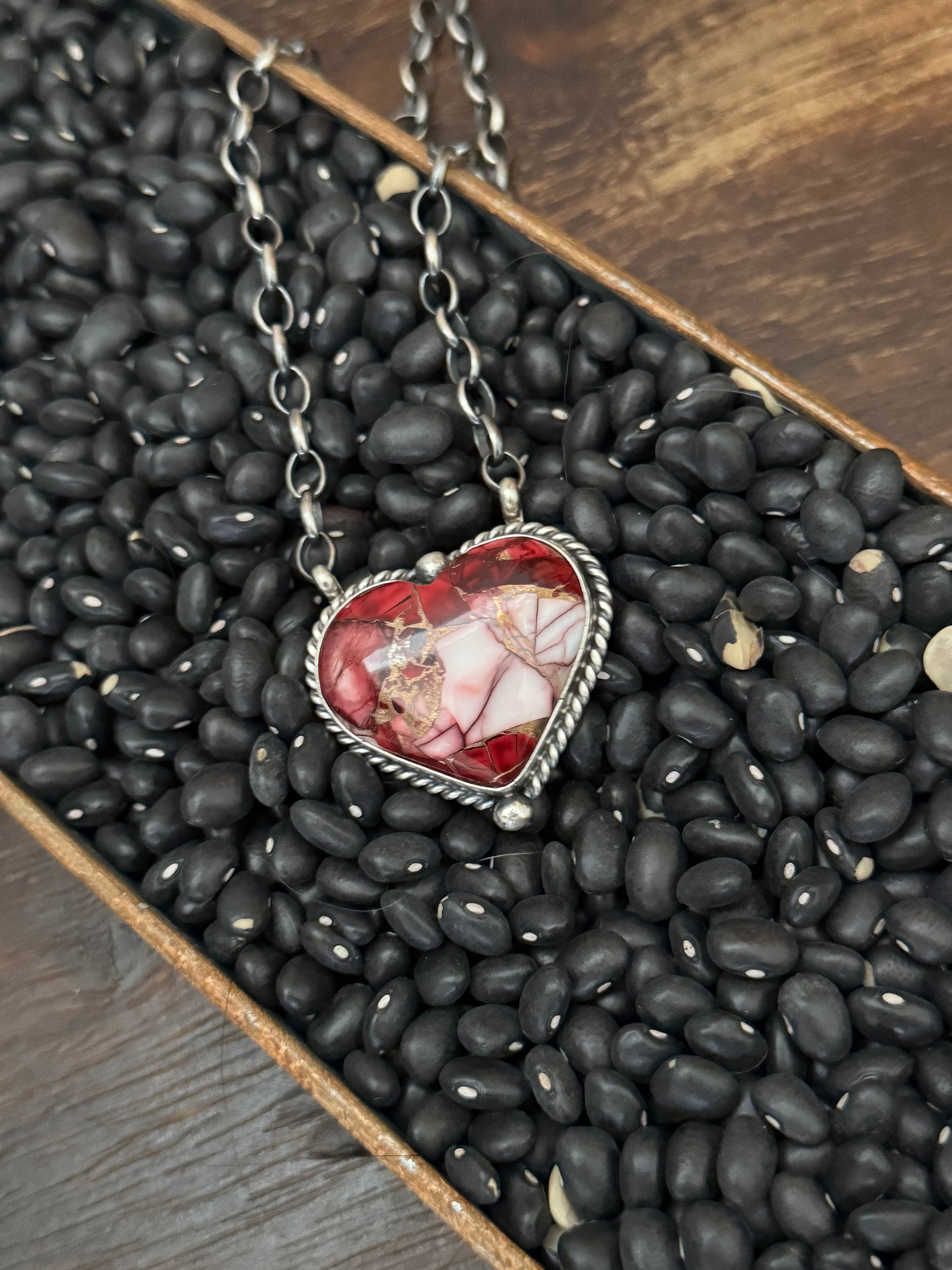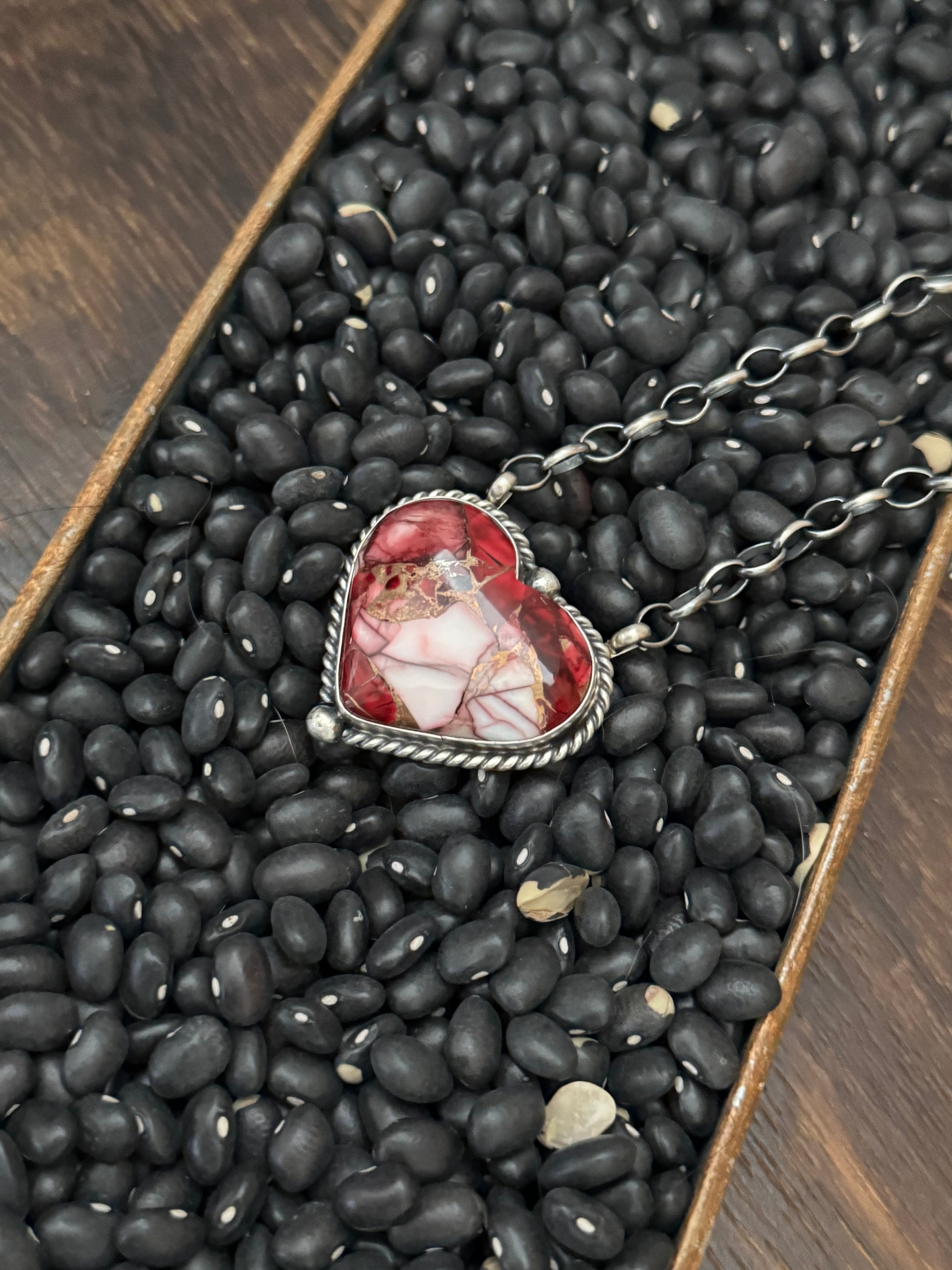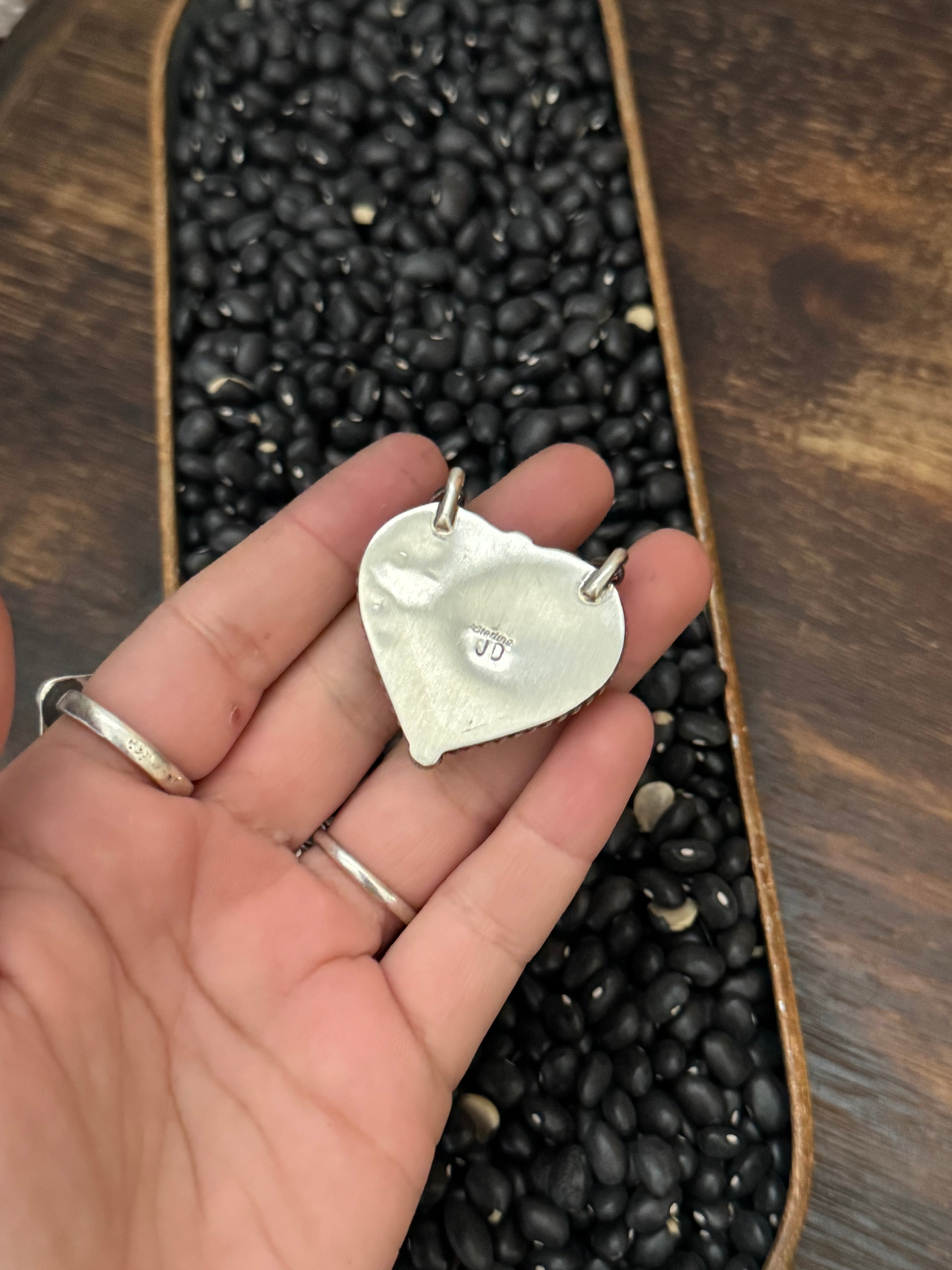 A beautiful necklace. Johnny Dixon Rose Dahlia & Sterling Silver Heart Necklace. It measures 18 1/2 inches long with hang while the chain by itself measures 15 1/2 inches long. Signed by the artist and stamped sterling silver.