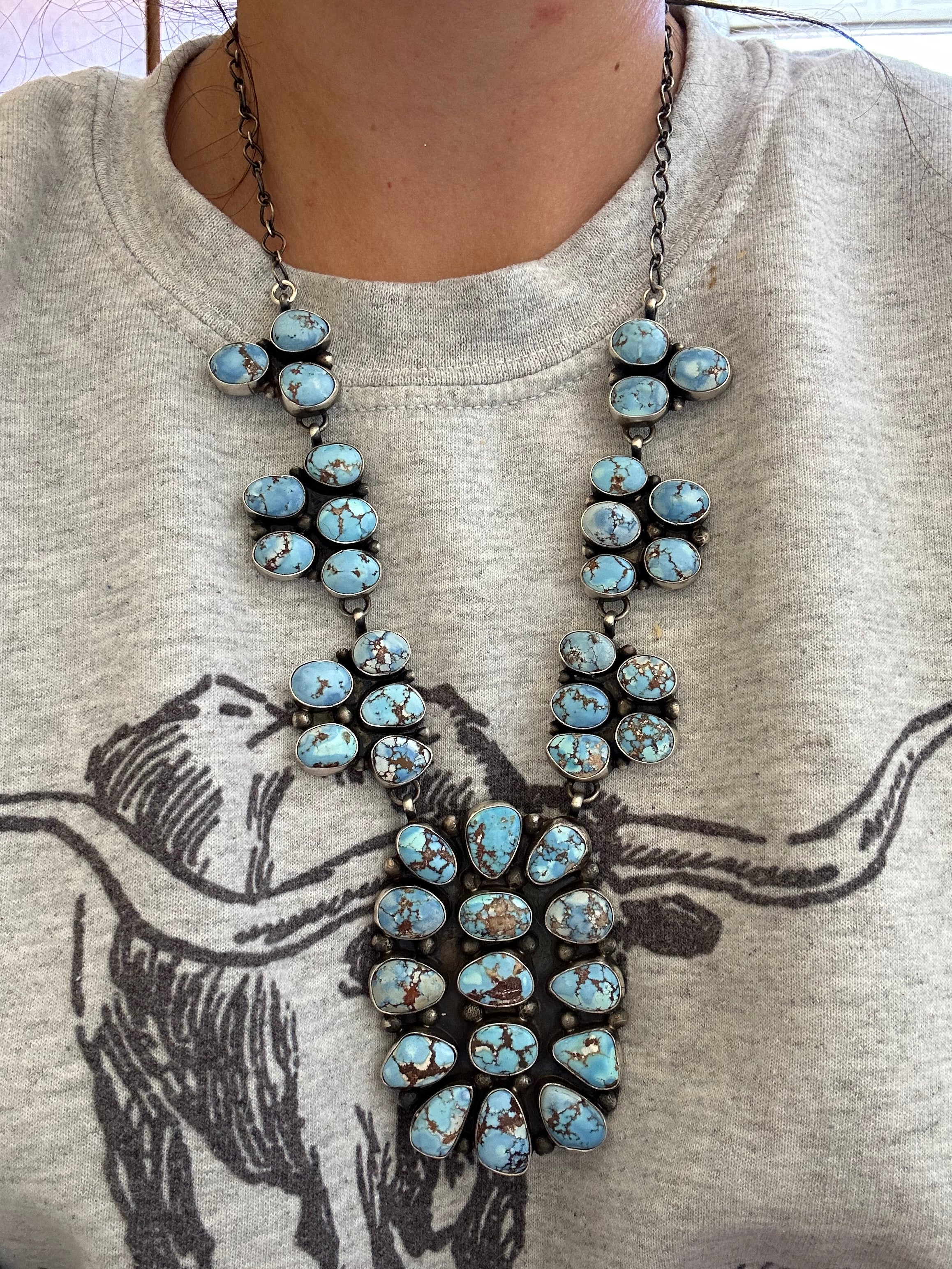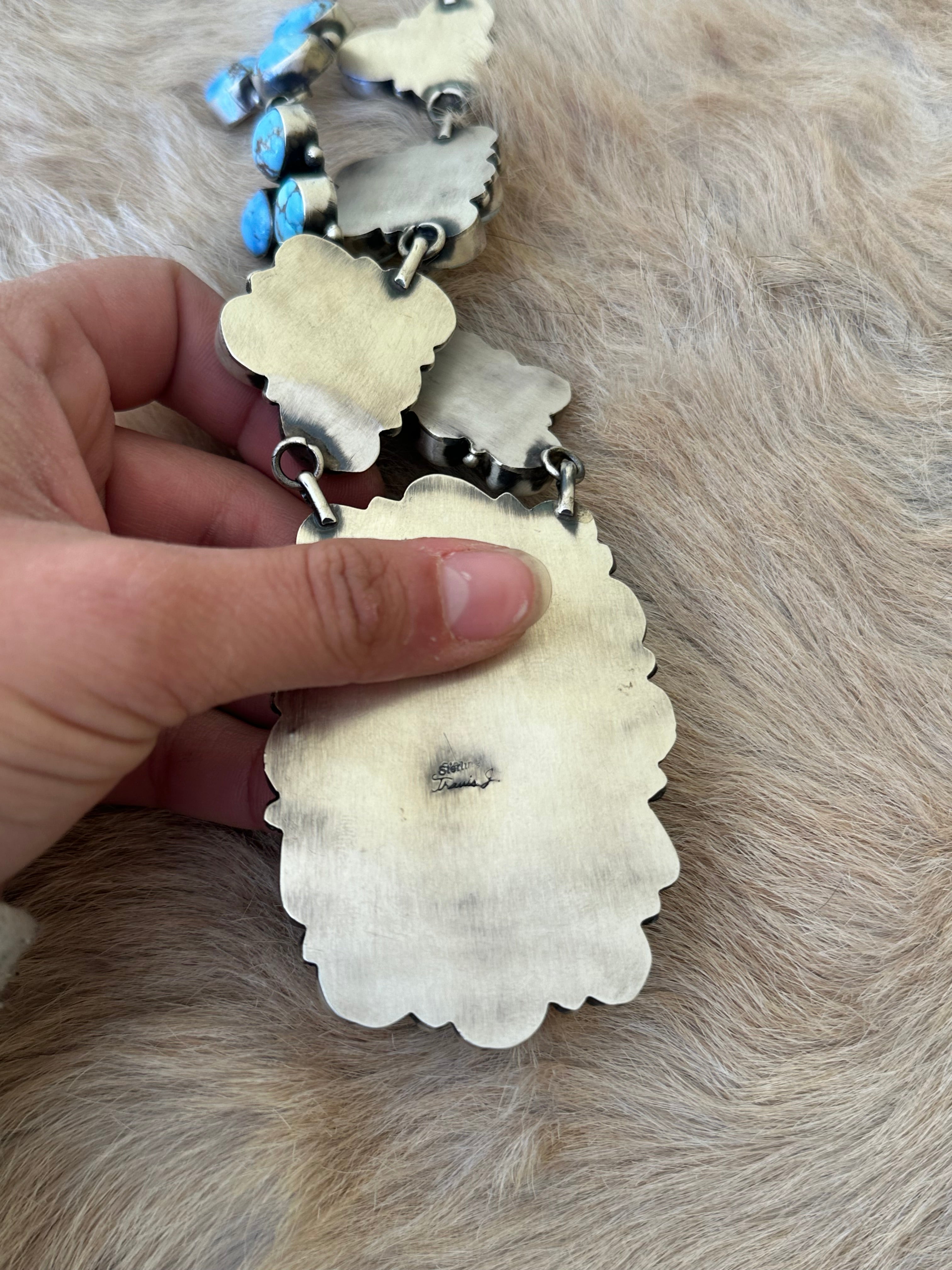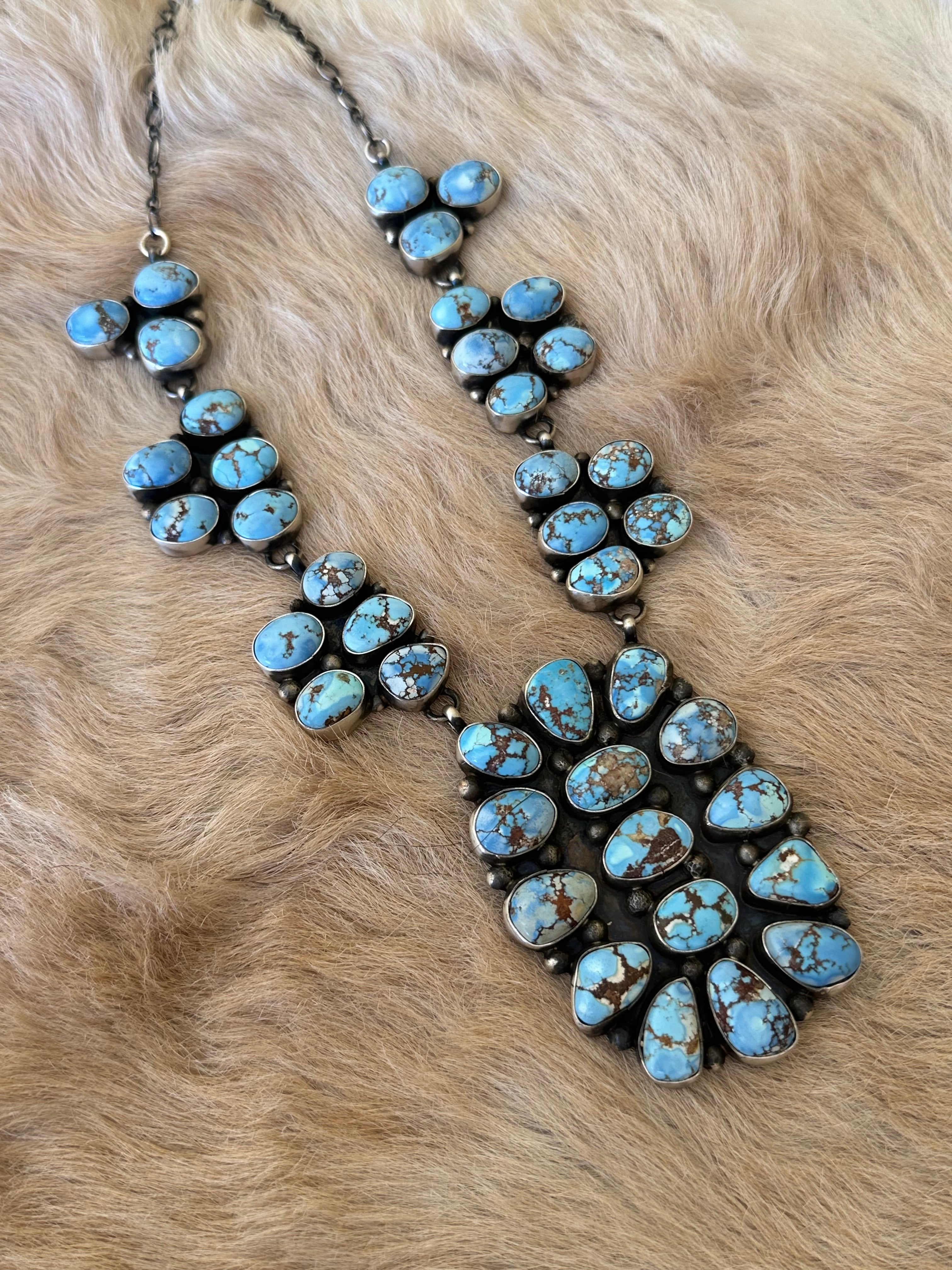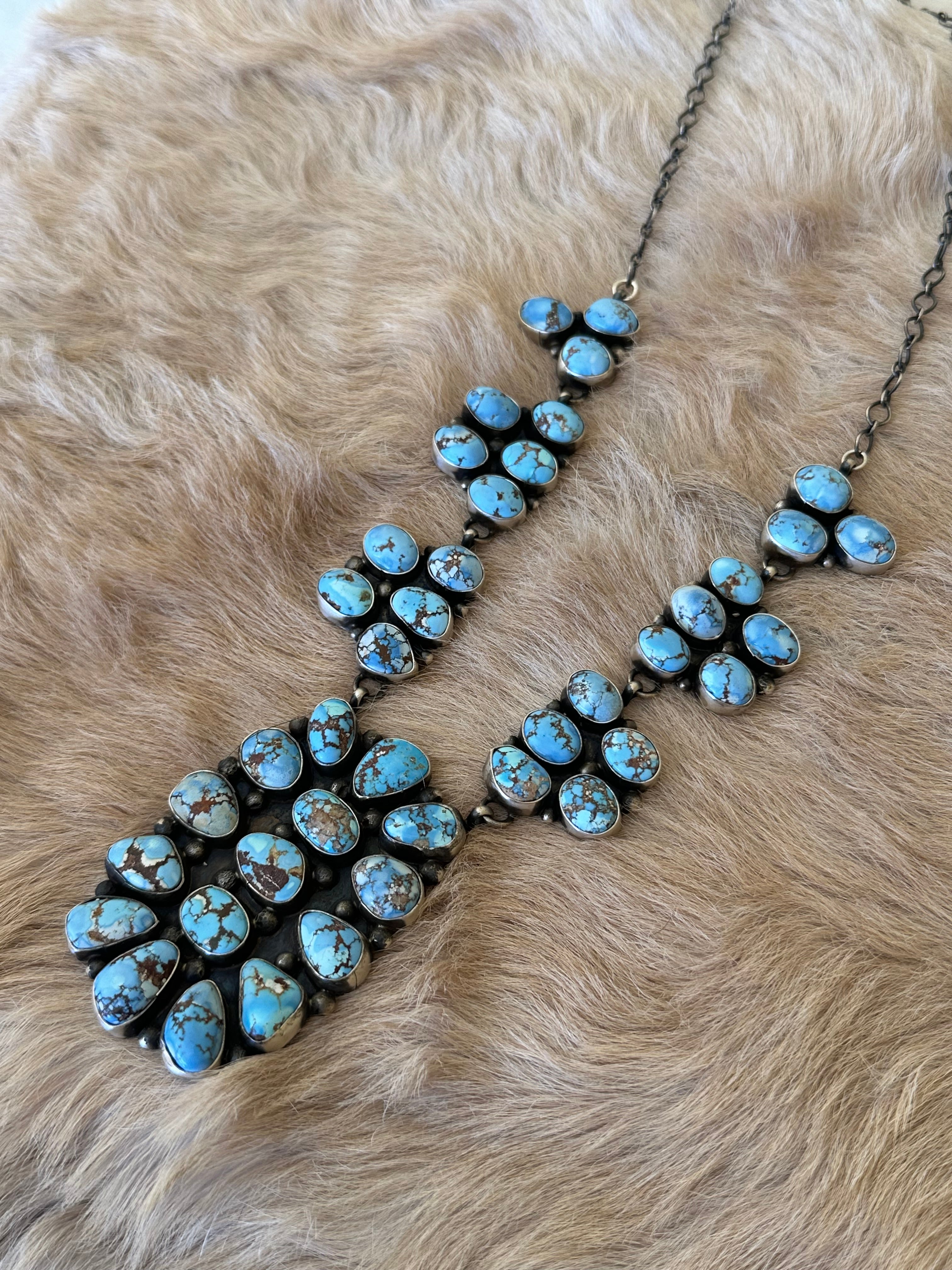 Travis J. Golden Hills Turquoise & Sterling Silver Cluster Necklace Set. It measures 26 1/2 inches long with hang while the chain measures 21 inches long. Signed by the artist and stamped sterling silver.