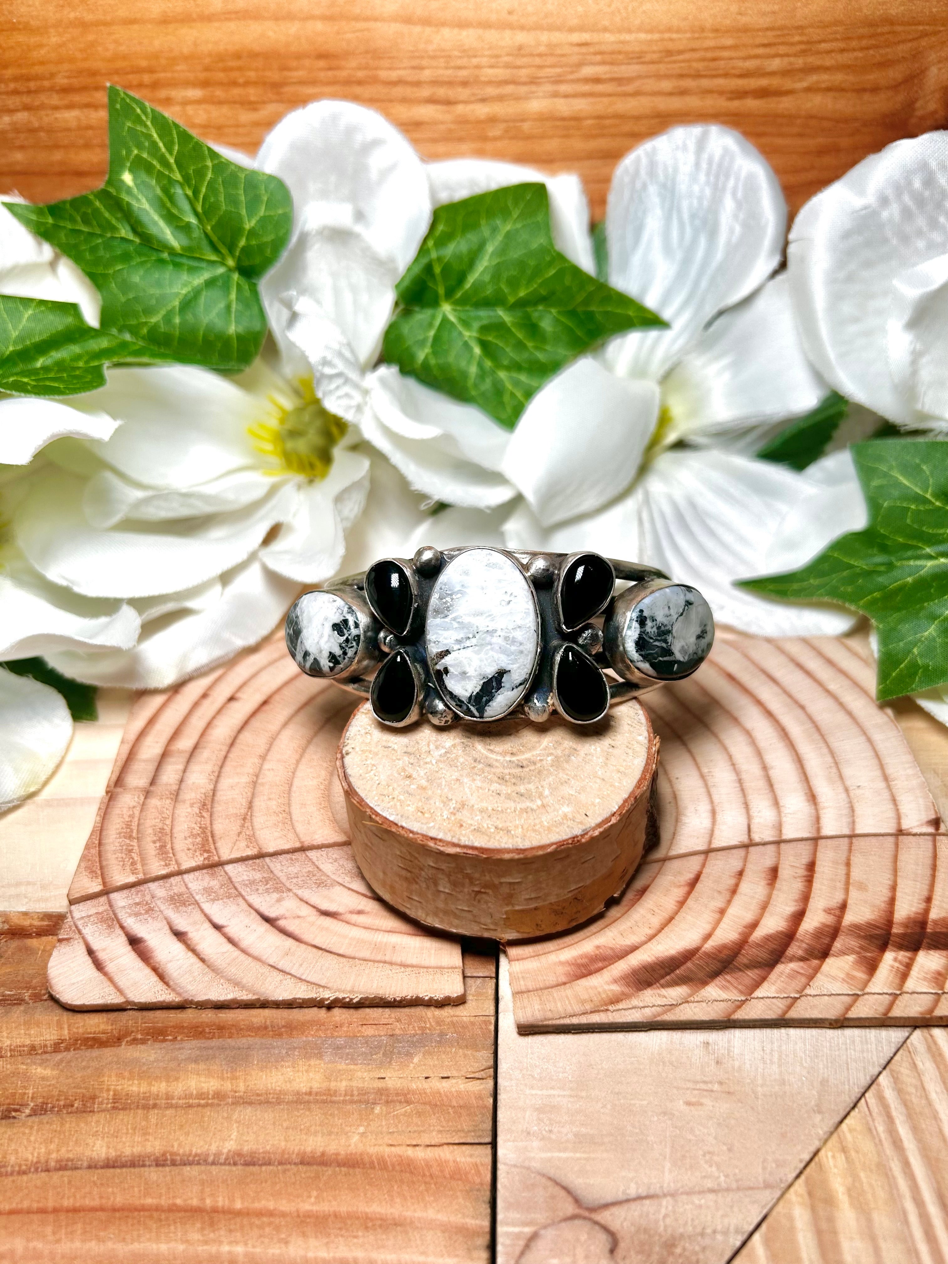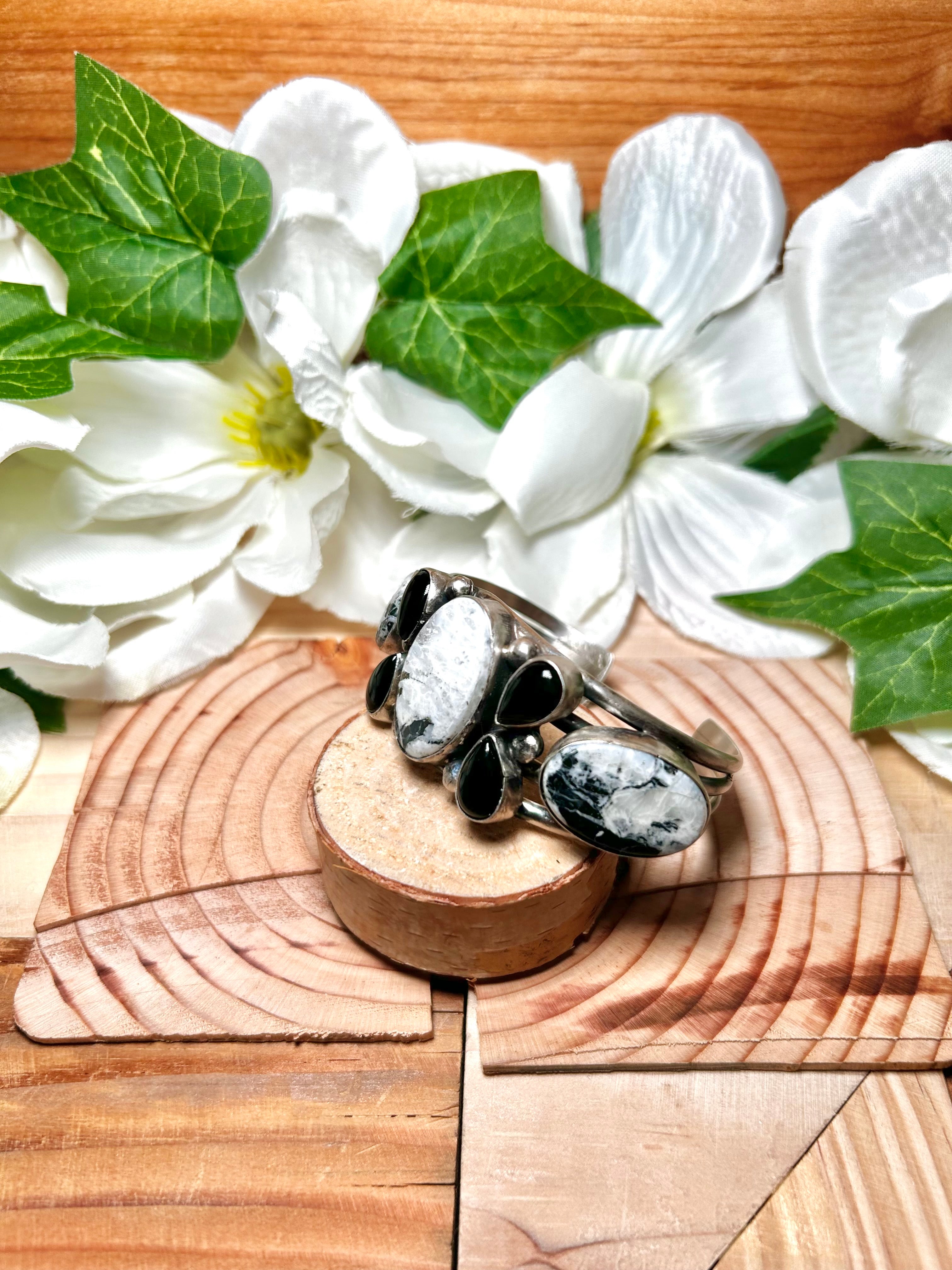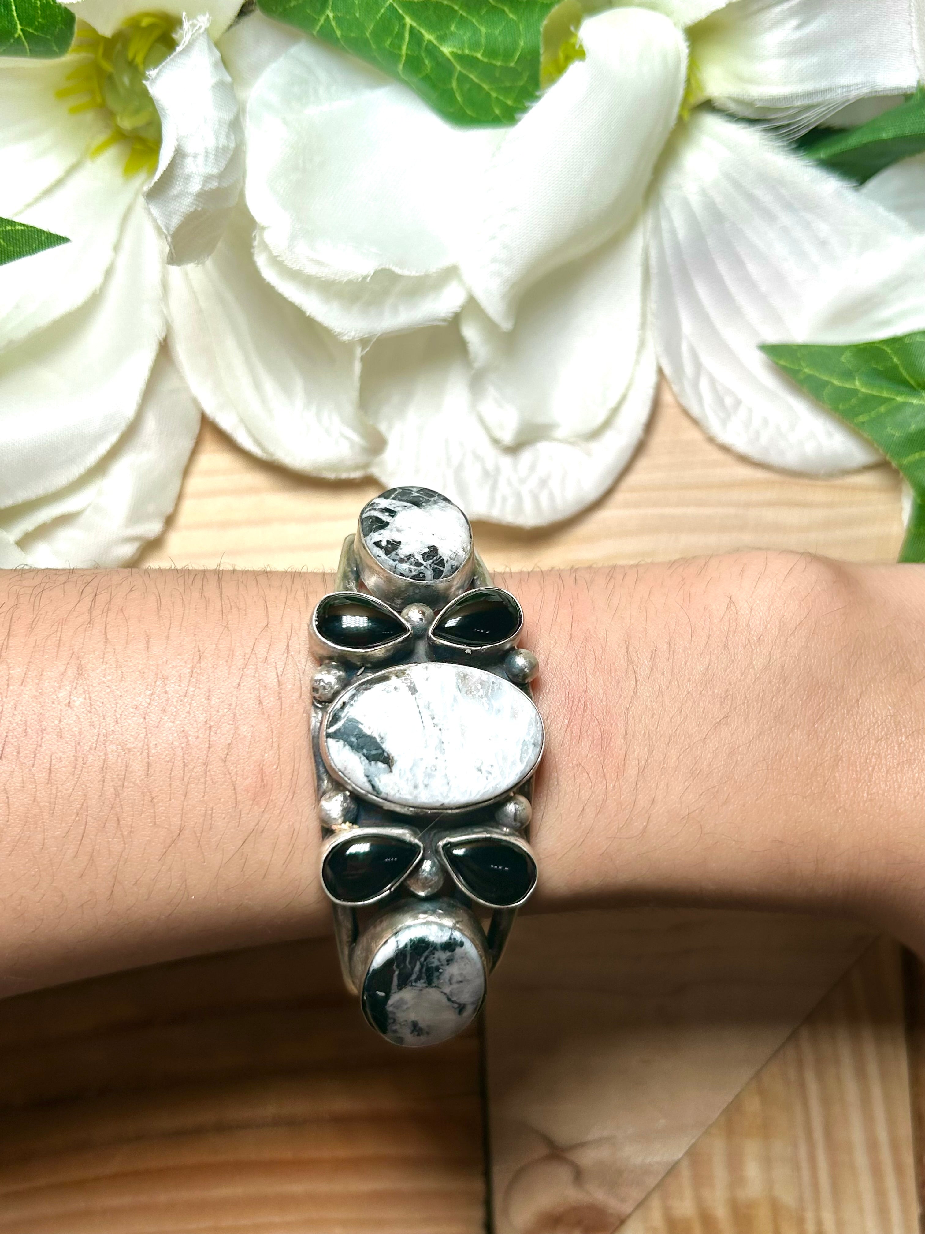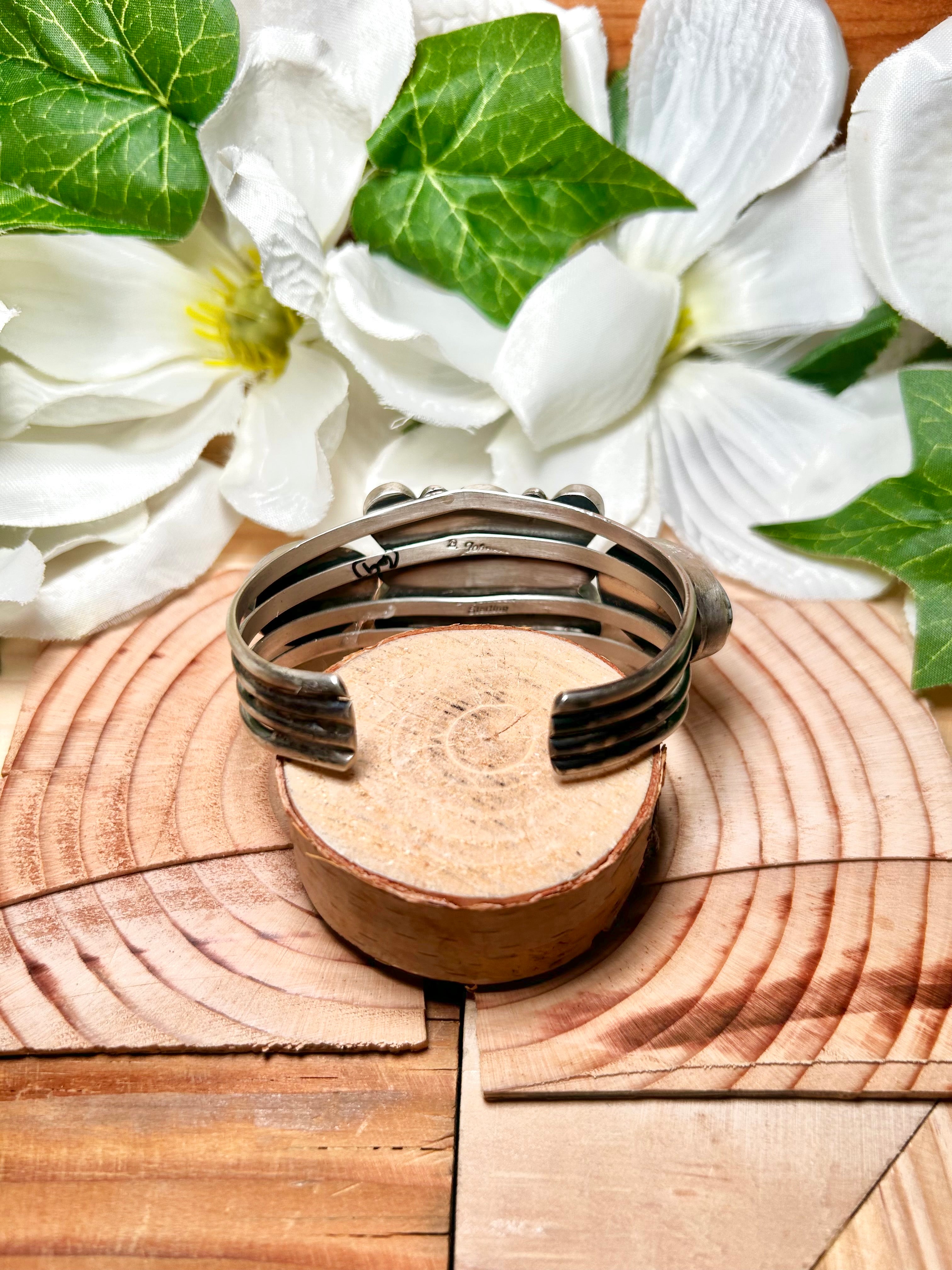 Paul Livingston Multi Stone & Sterling Silver Cuff Bracelet. It measures 1 1/8 inches wide with an inside circumference of 5 5/8 inches and a gap of 1 inch. Signed by the artist and stamped sterling silver.