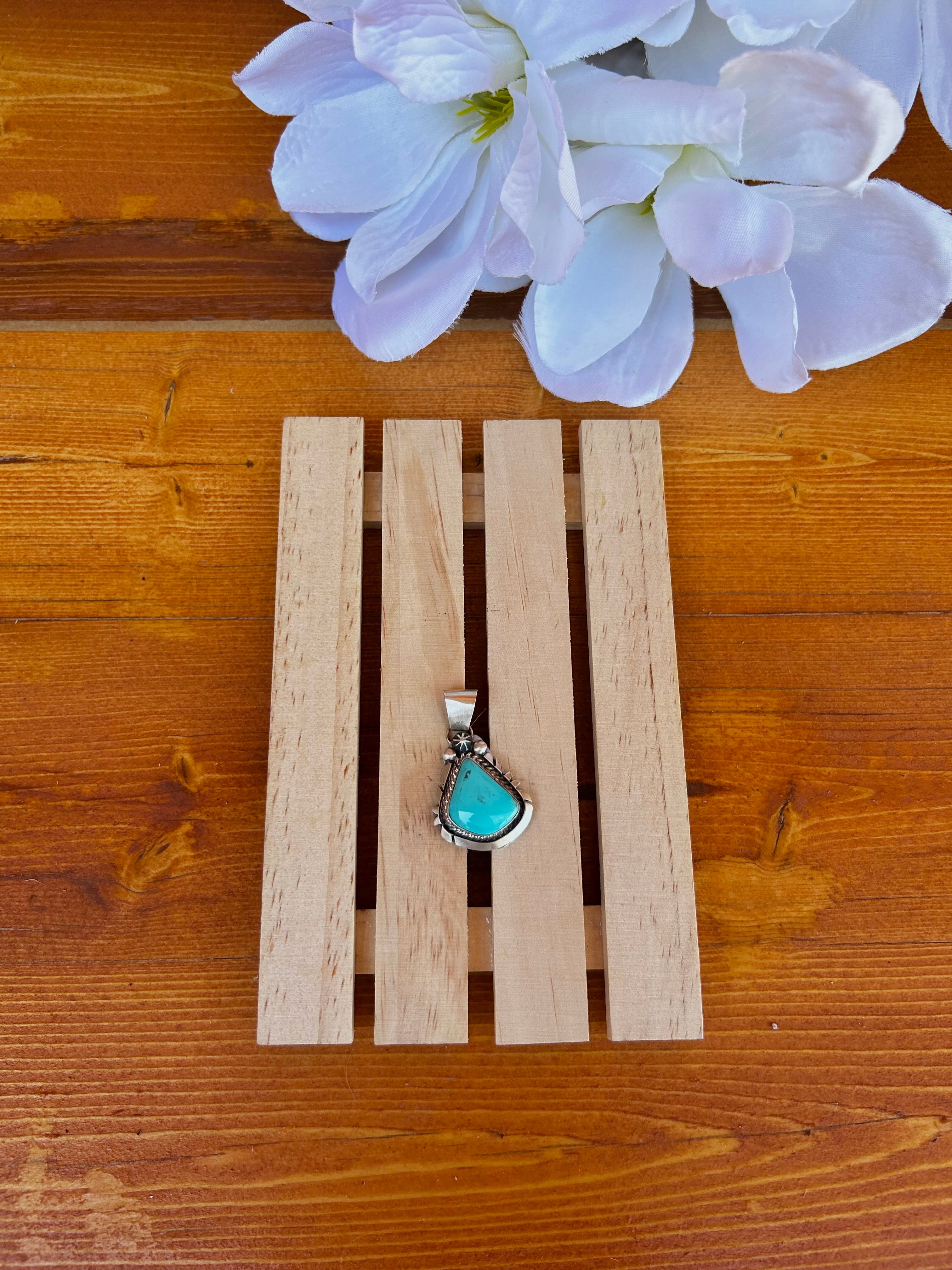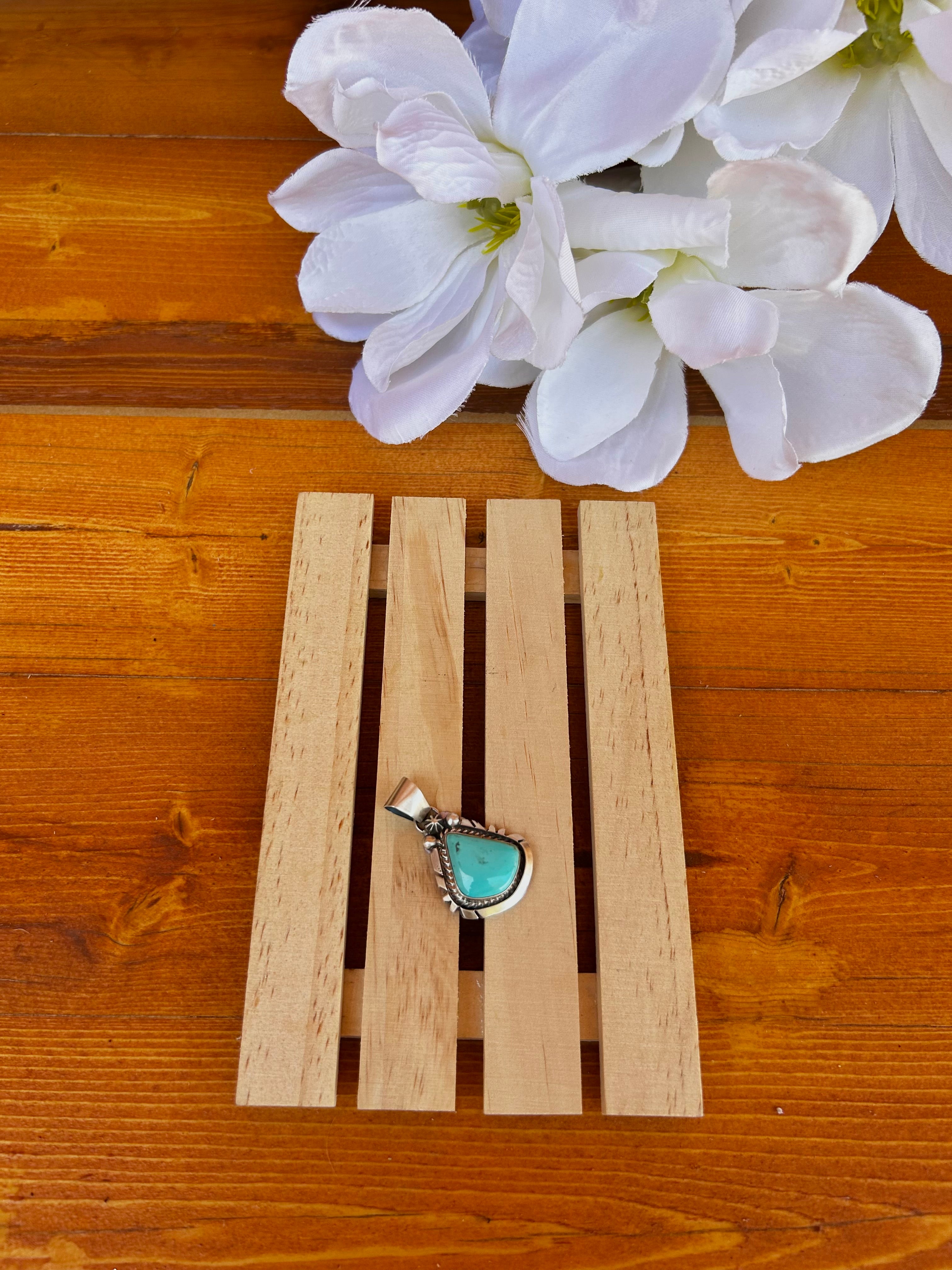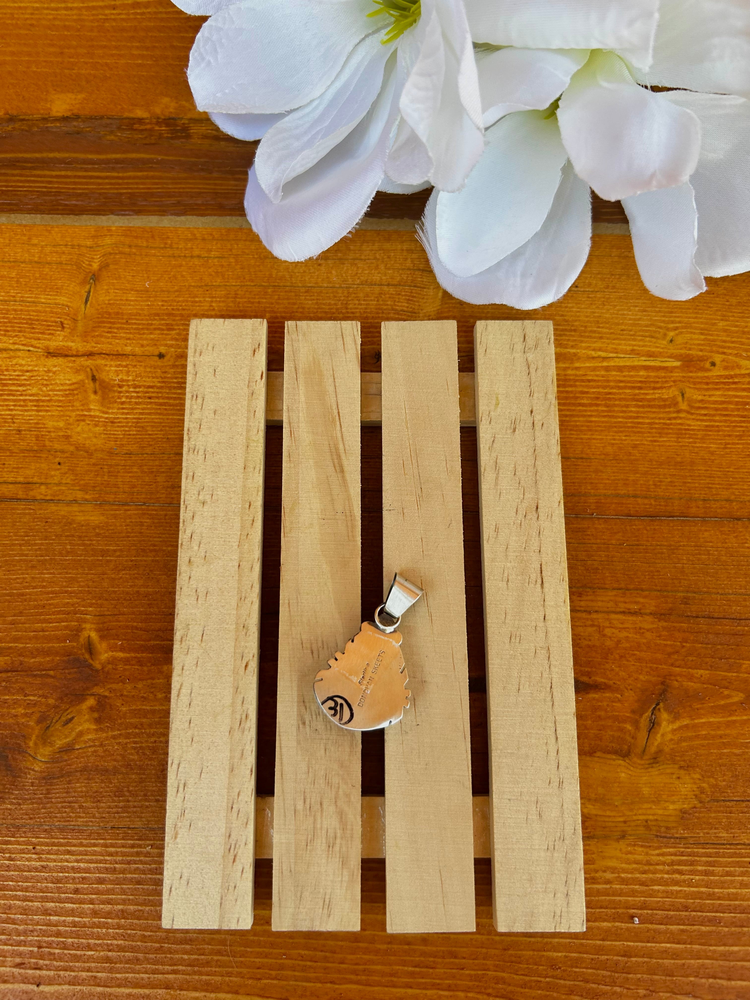Donovan Skeets Kingman Turquoise & Sterling Silver Pendant. It measures 1 1/2 inches long and 1 inch wide. Pendant Only. Signed by the artist and stamped sterling silver.