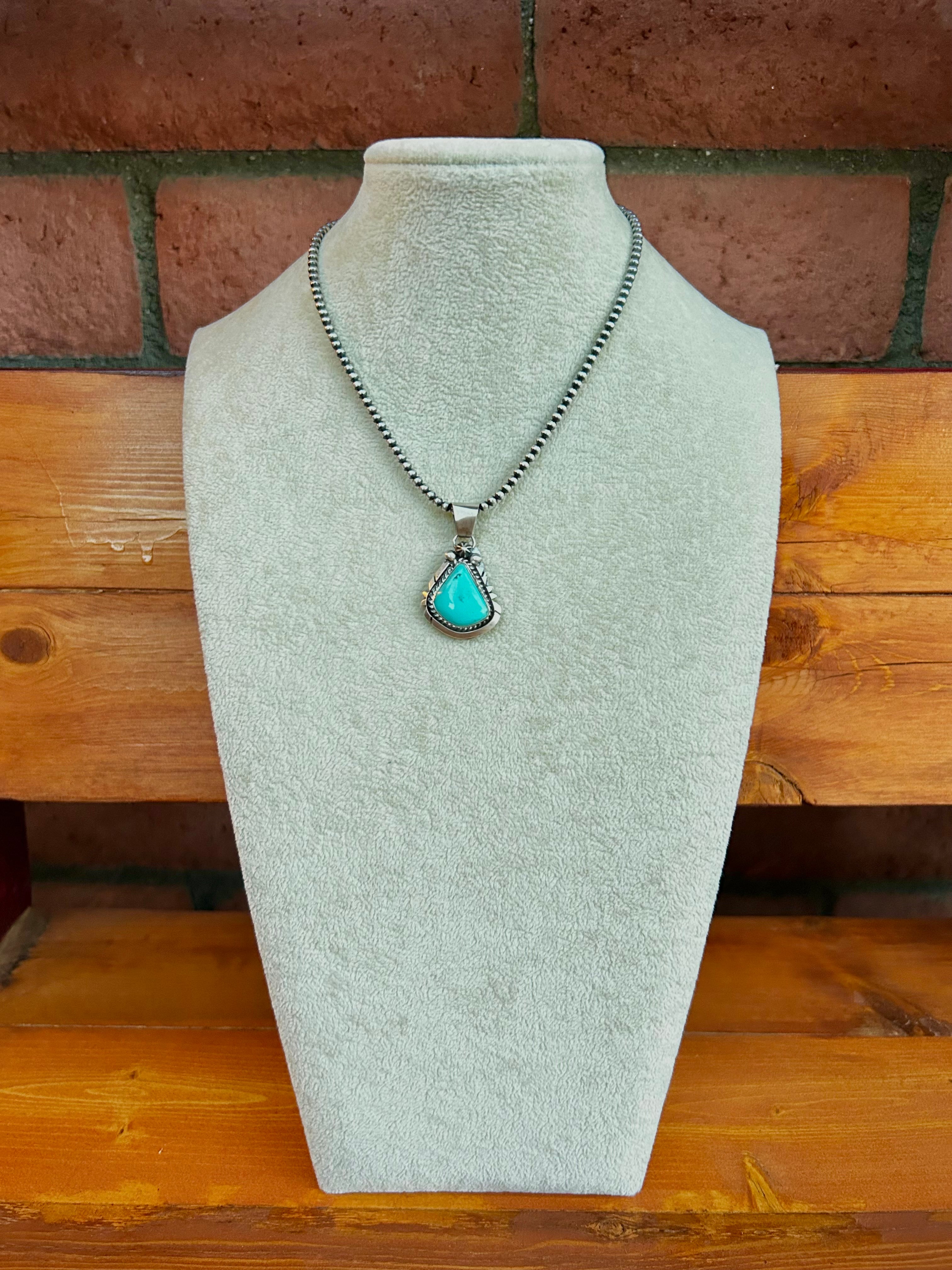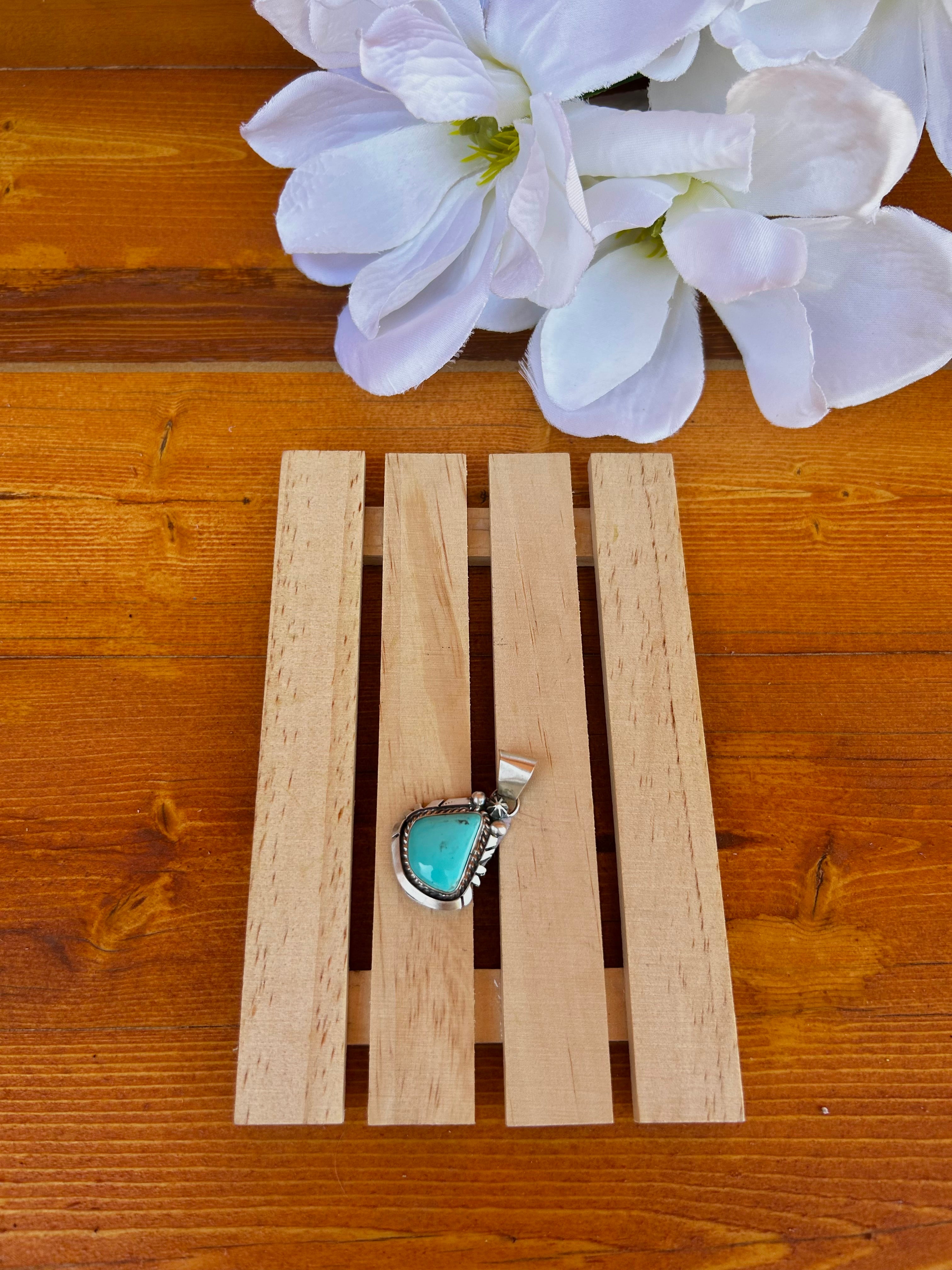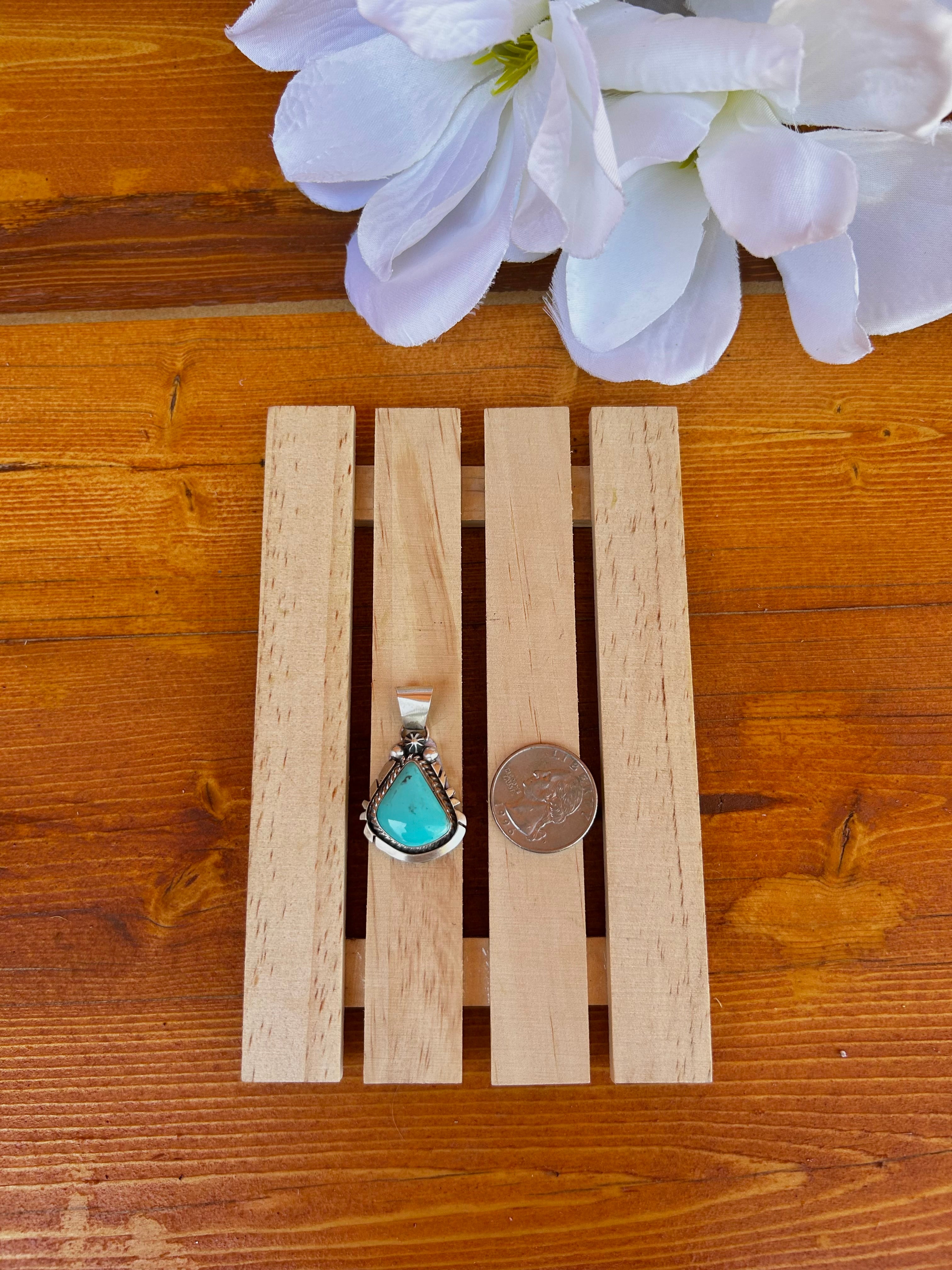 Donovan Skeets Kingman Turquoise & Sterling Silver Pendant. It measures 1 1/2 inches long and 1 inch wide. Pendant Only. Signed by the artist and stamped sterling silver.