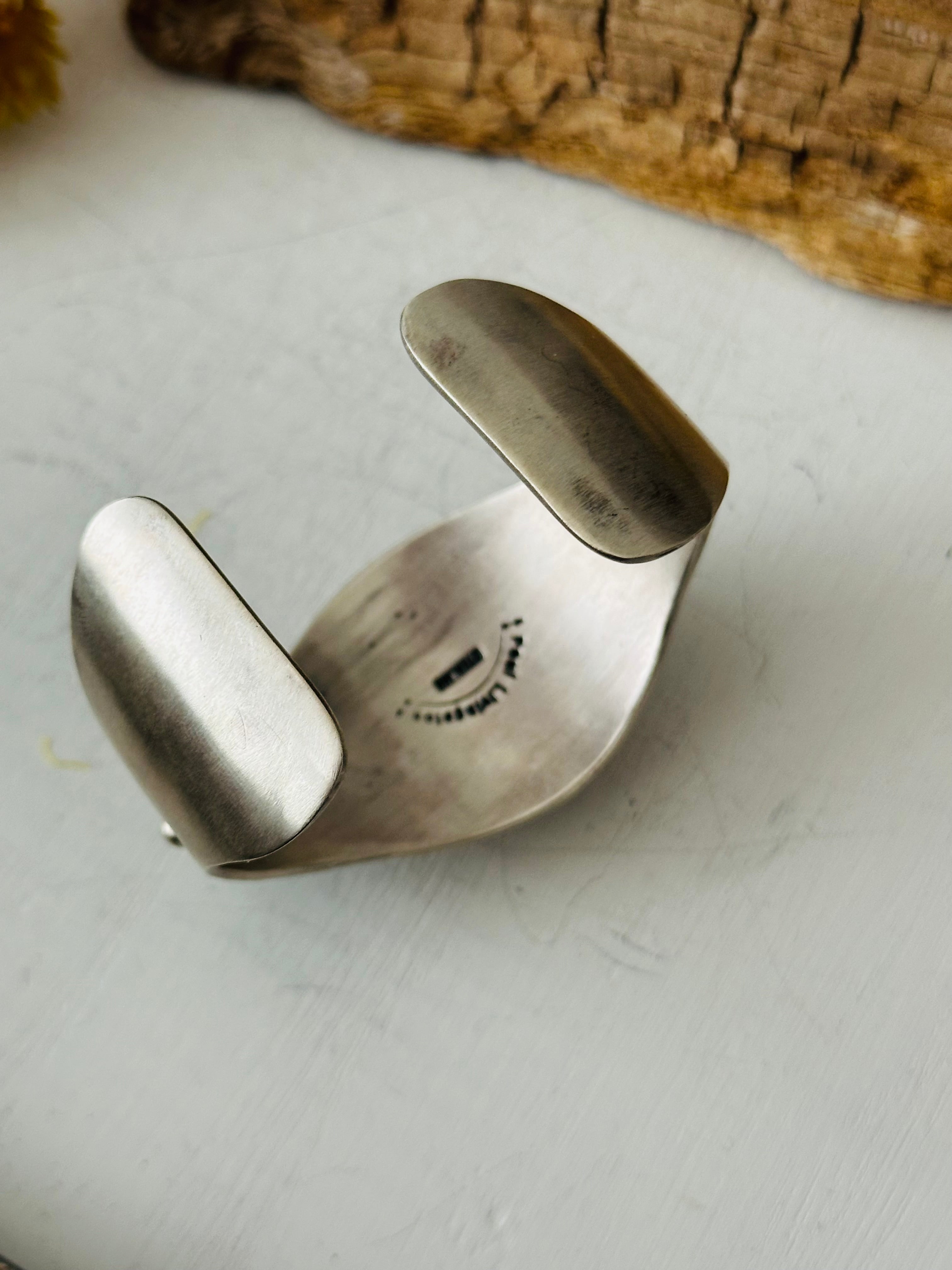 Paul Livingston Sonoran Mountain Turquoise & Sterling Silver Cuff Bracelet. It measures 1 3/8 inches wide with an inside circumference of 5 3/4 inches and a gap of 1 inch. Signed by the artist and stamped sterling silver.