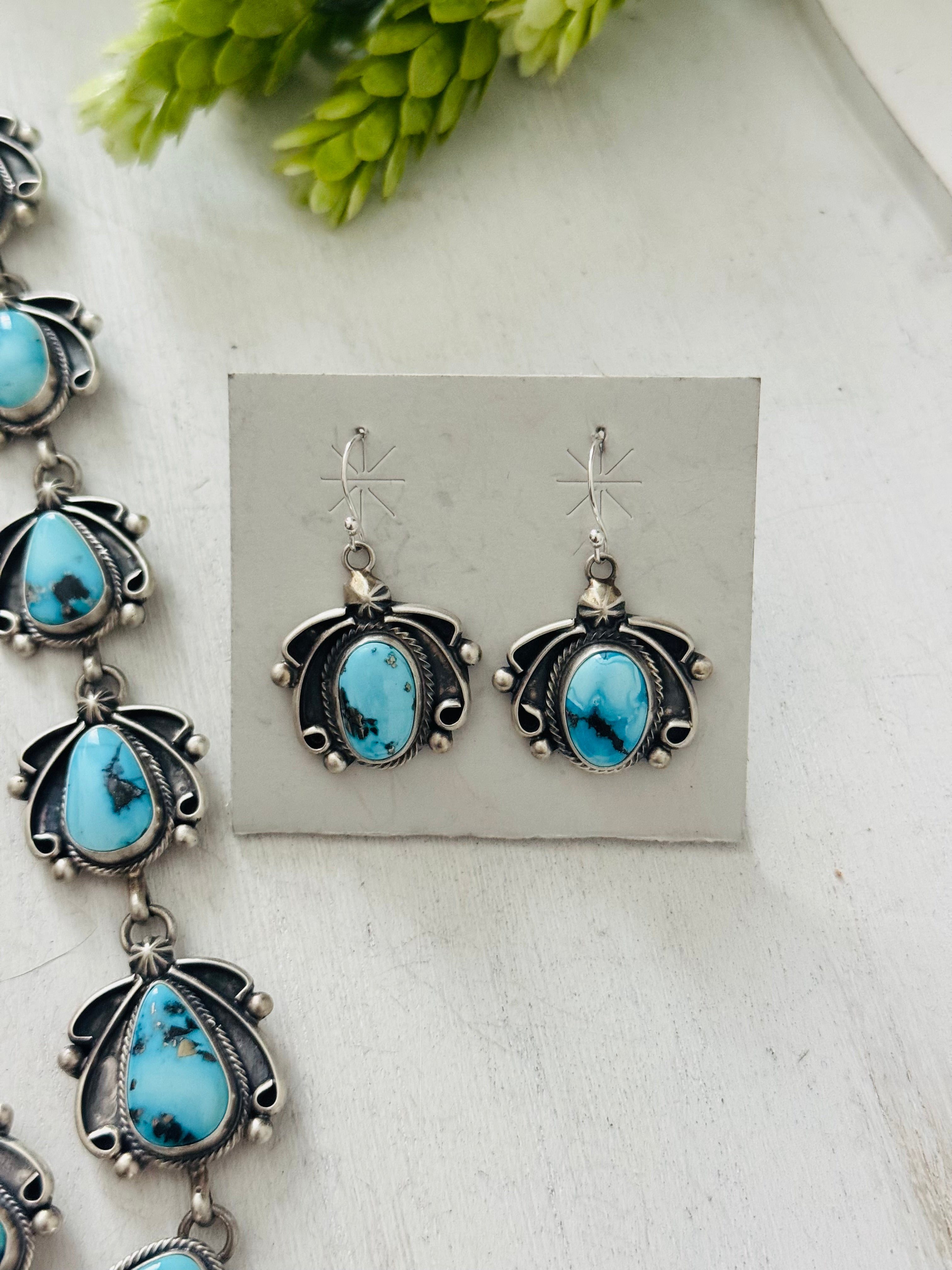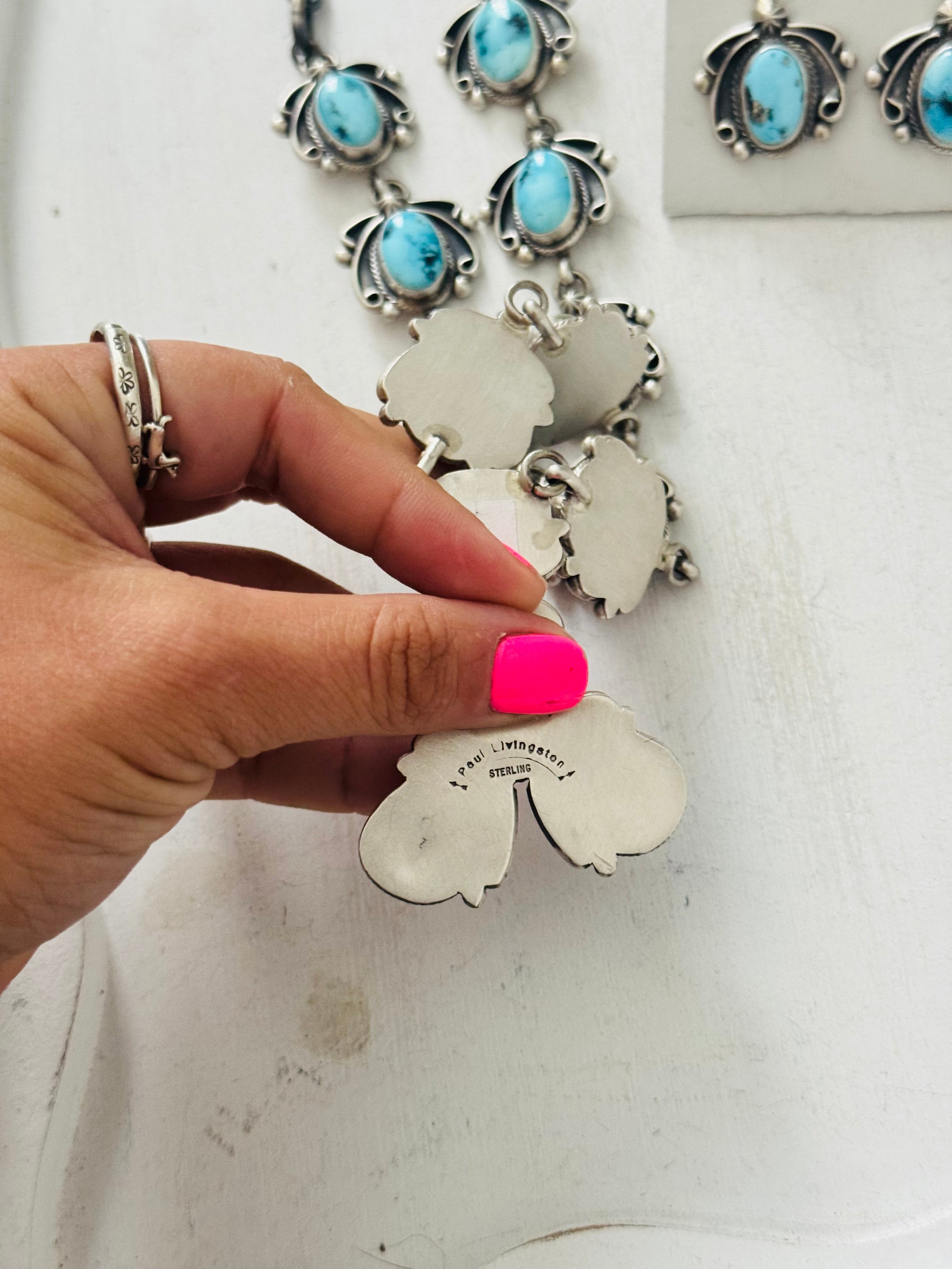 Paul Livingston Blue Ridge Turquoise & Sterling Silver Necklace Set. The necklace measures 23 inches long with hang and without hang 19 inches long but can adjust shorter. Signed by the artist and stamped sterling silver.