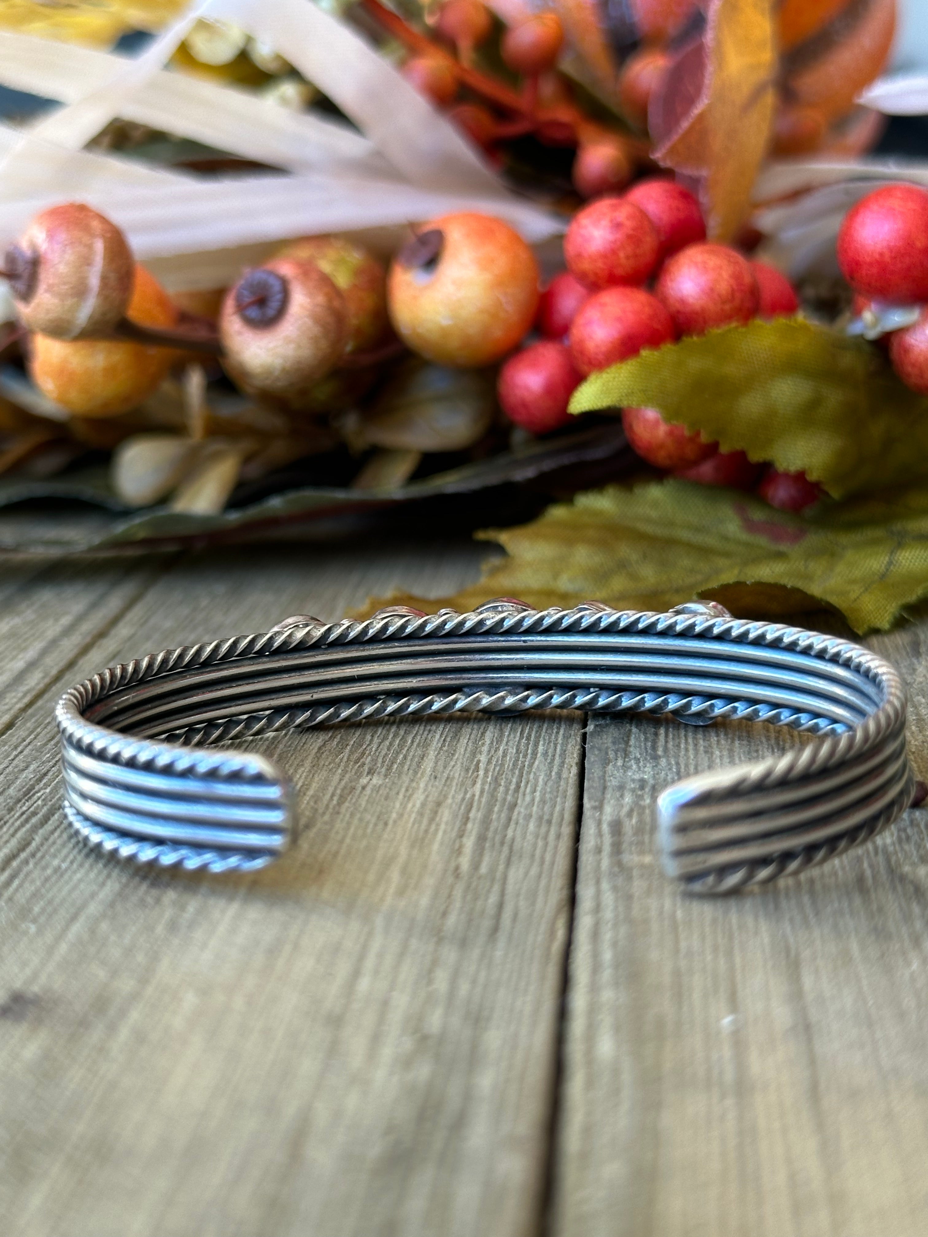 Priscilla A Smith Multi Stone & Sterling Silver Cuff Bracelet. It measures just under 3/8 of an inch wide with an inside circumference of 5 3/8 inches and a gap of 1 inch. Signed by artist and stamped sterling silver.