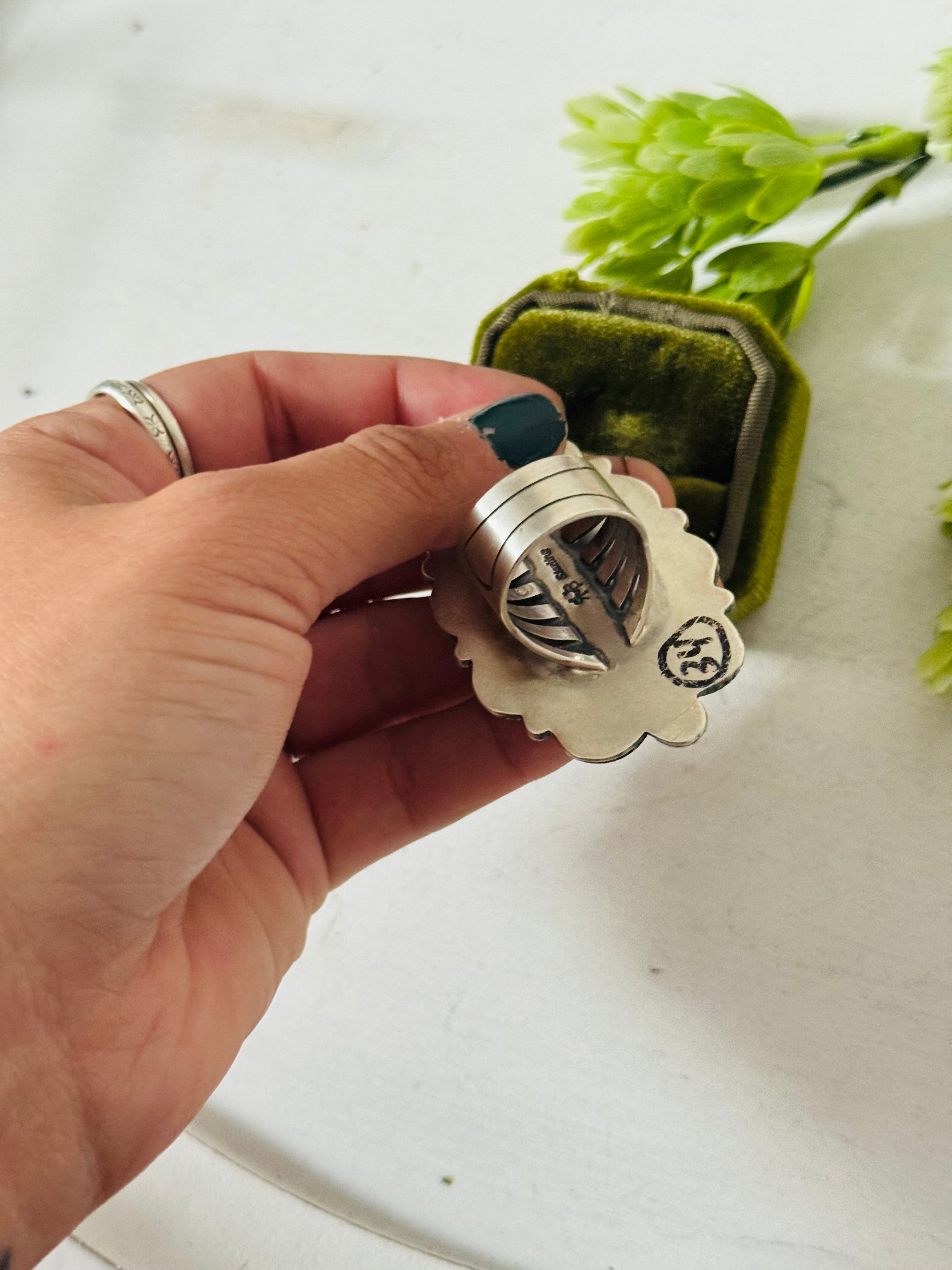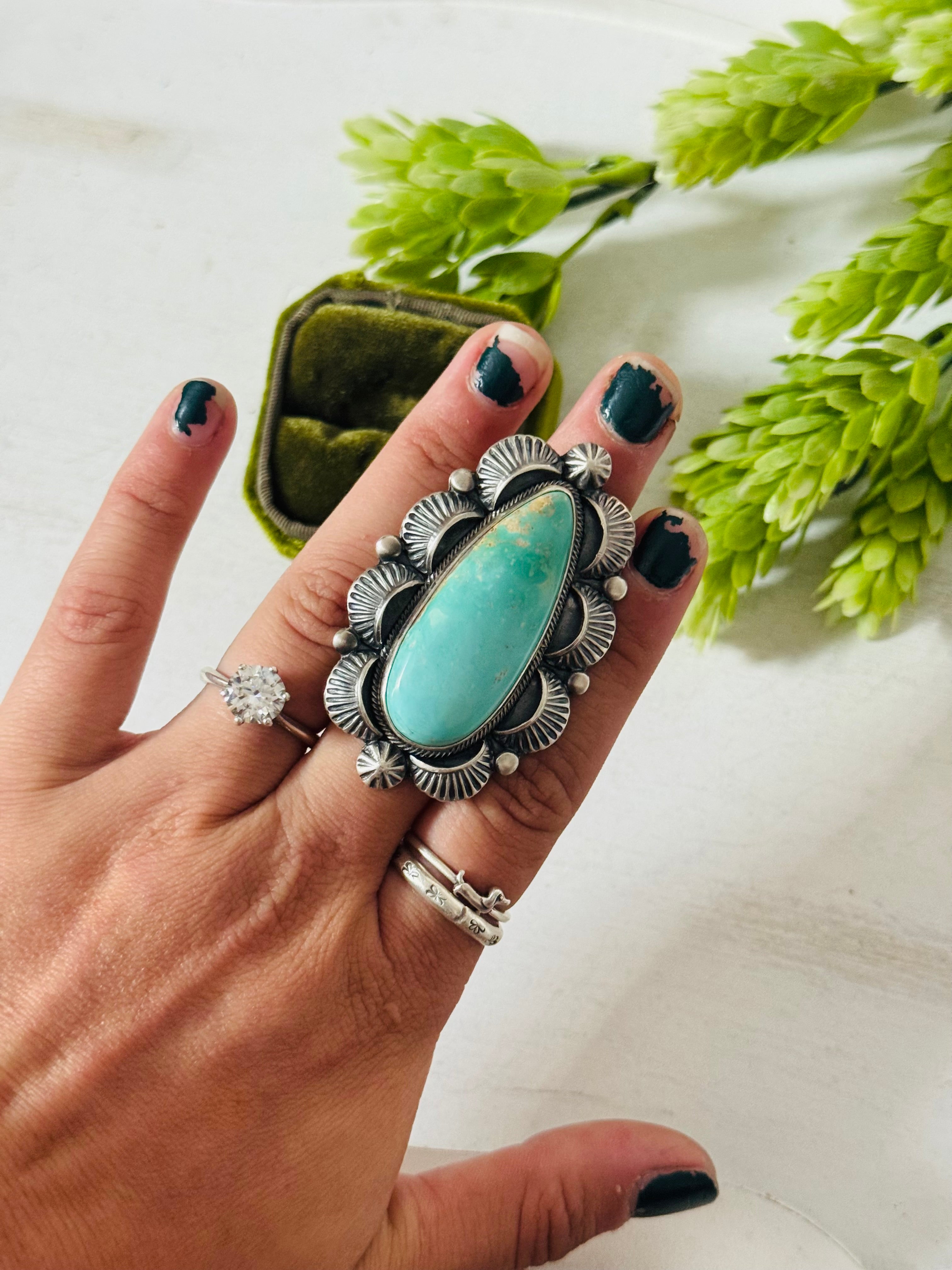 Randy Boyd Royston Turquoise & Sterling Silver Ring Size 7.5. It measures 2 1/4 inches long and 1 1/2 inches wide. Stamped sterling silver and signed.