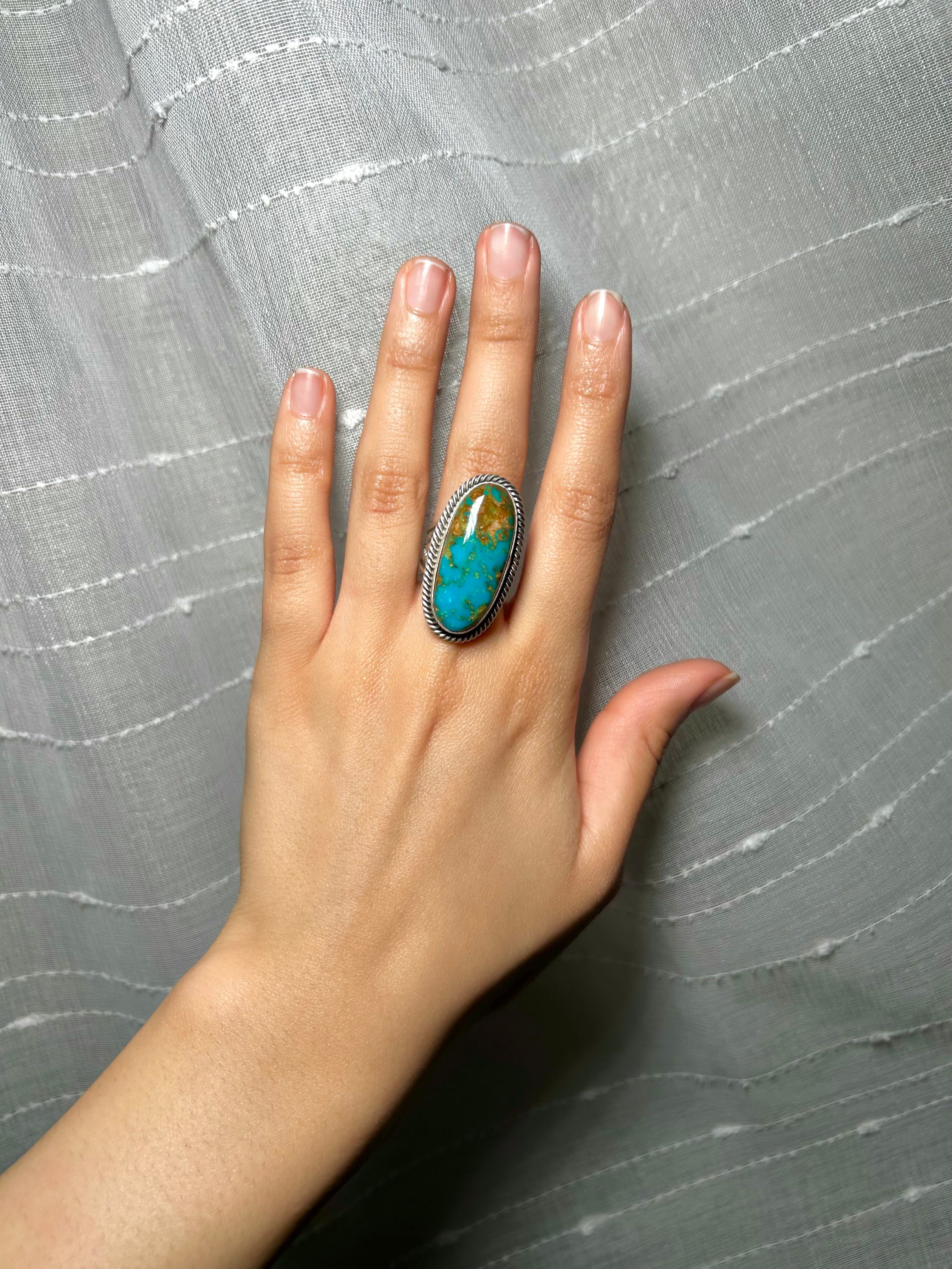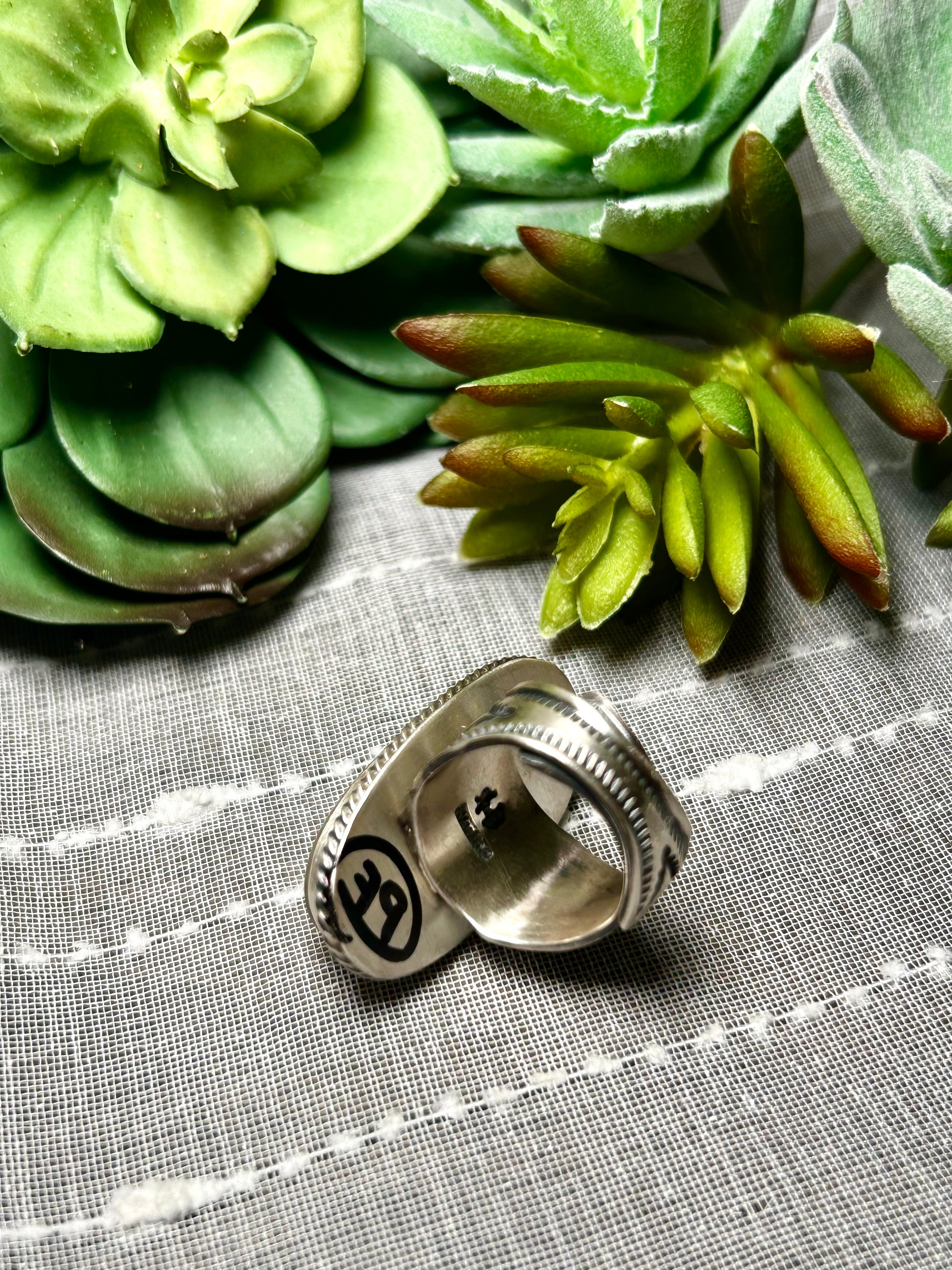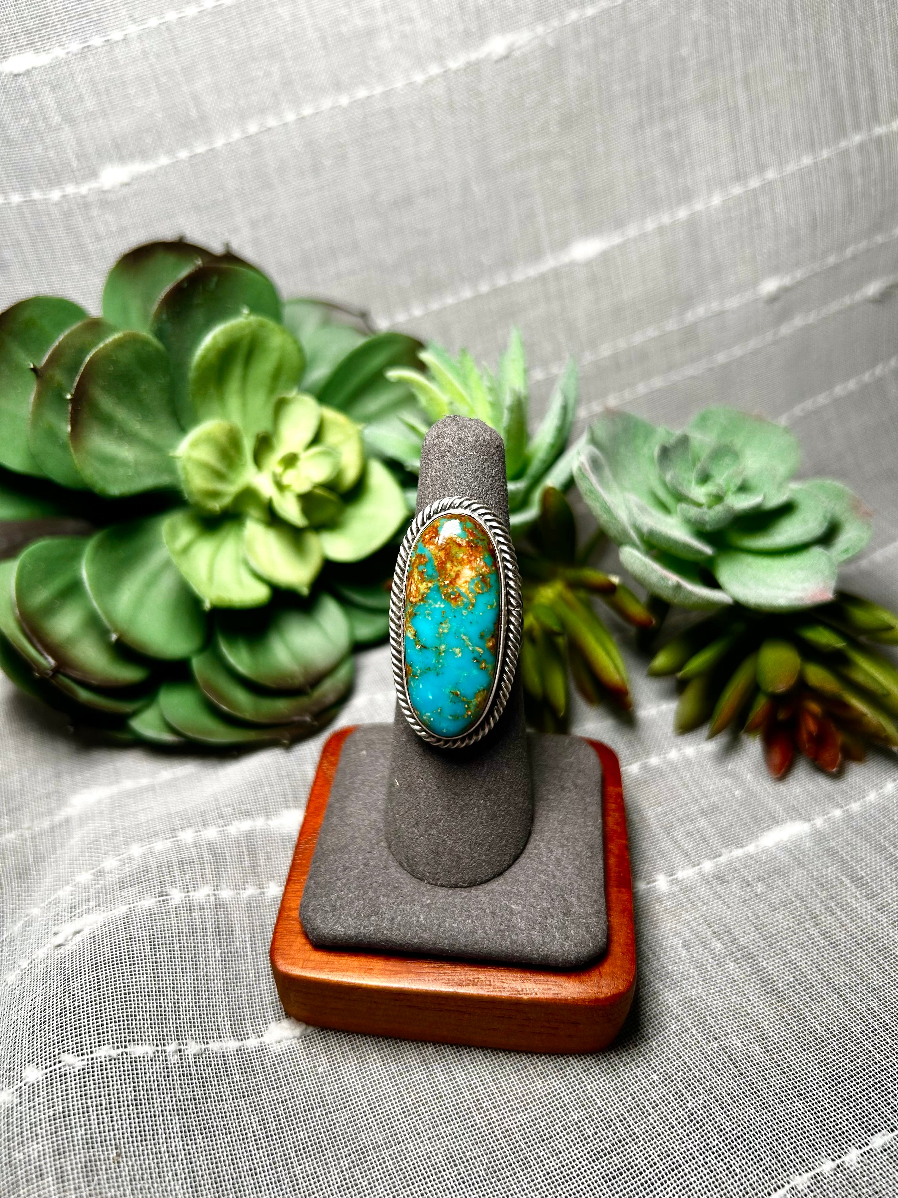 Randy Boyd Royston Turquoise & Sterling Silver Adjustable Ring. It measures 1 1/4 inches long and 5/8 of an inch wide. Signed by the artist and stamped sterling silver.