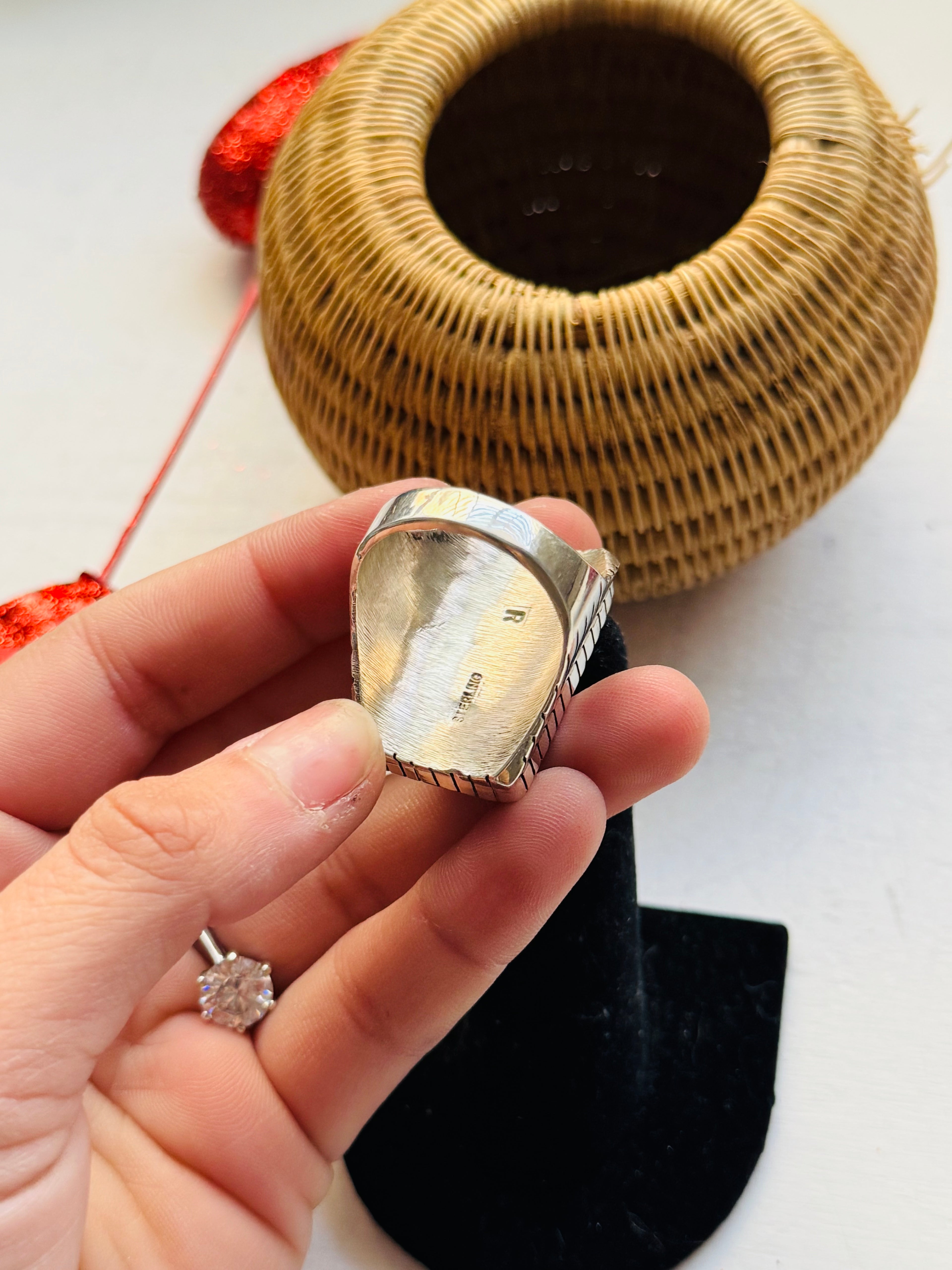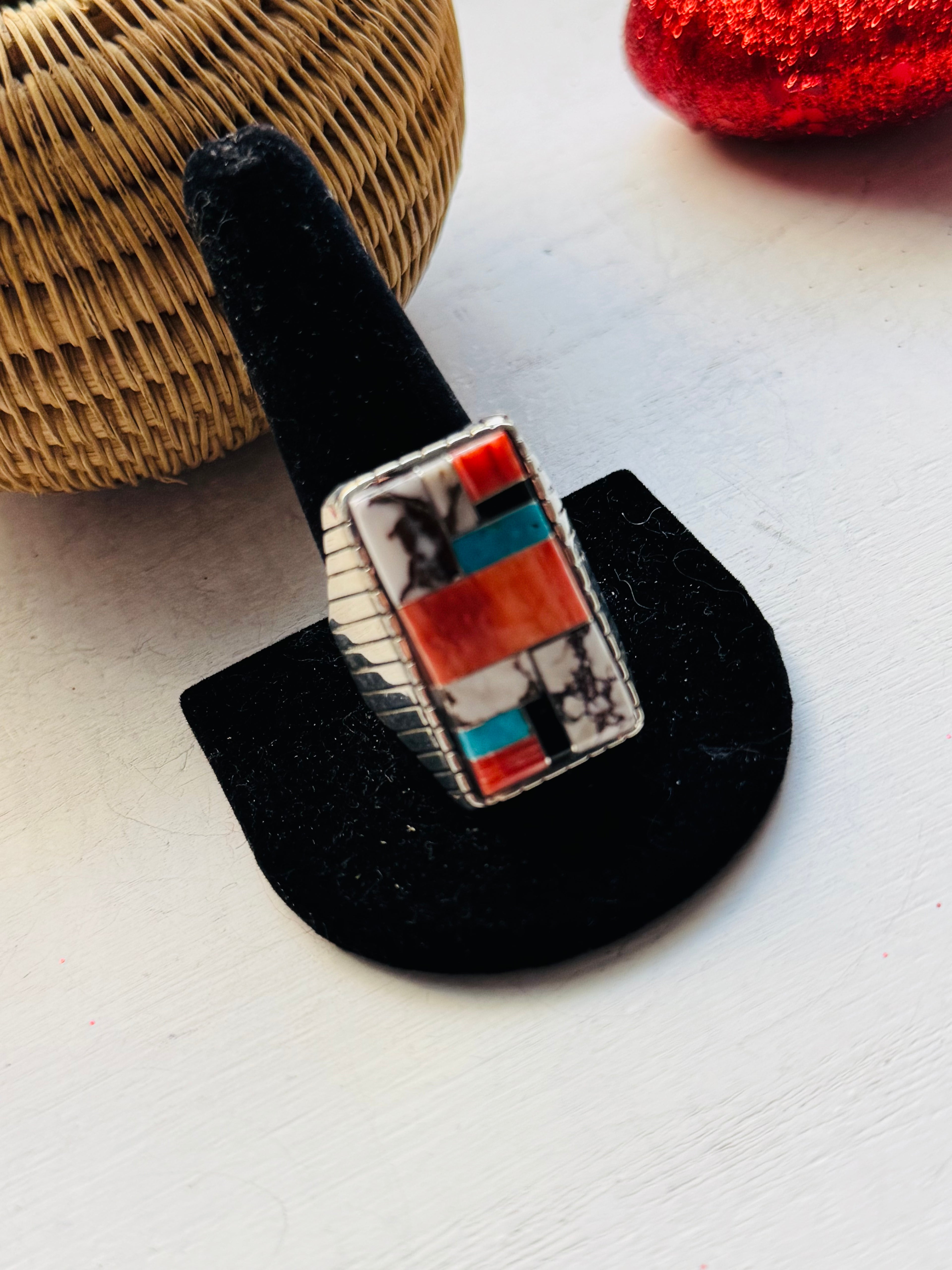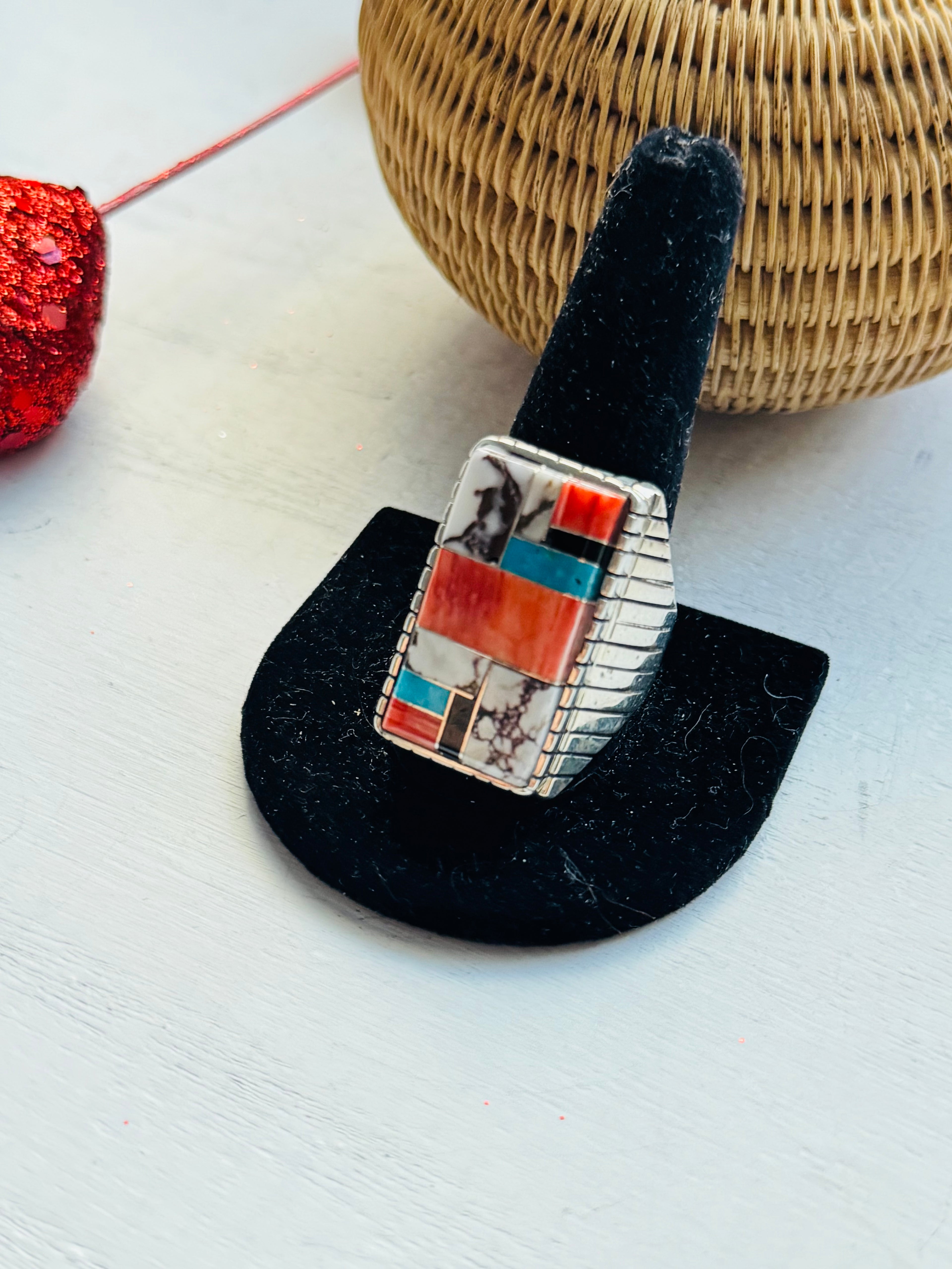 Ray Jack Multi Stone & Sterling Silver Inlay Ring Size 12.75. It measures 1 1/8 inches long and 3/4 of an inch wide. Signed by the artist and stamped sterling silver.