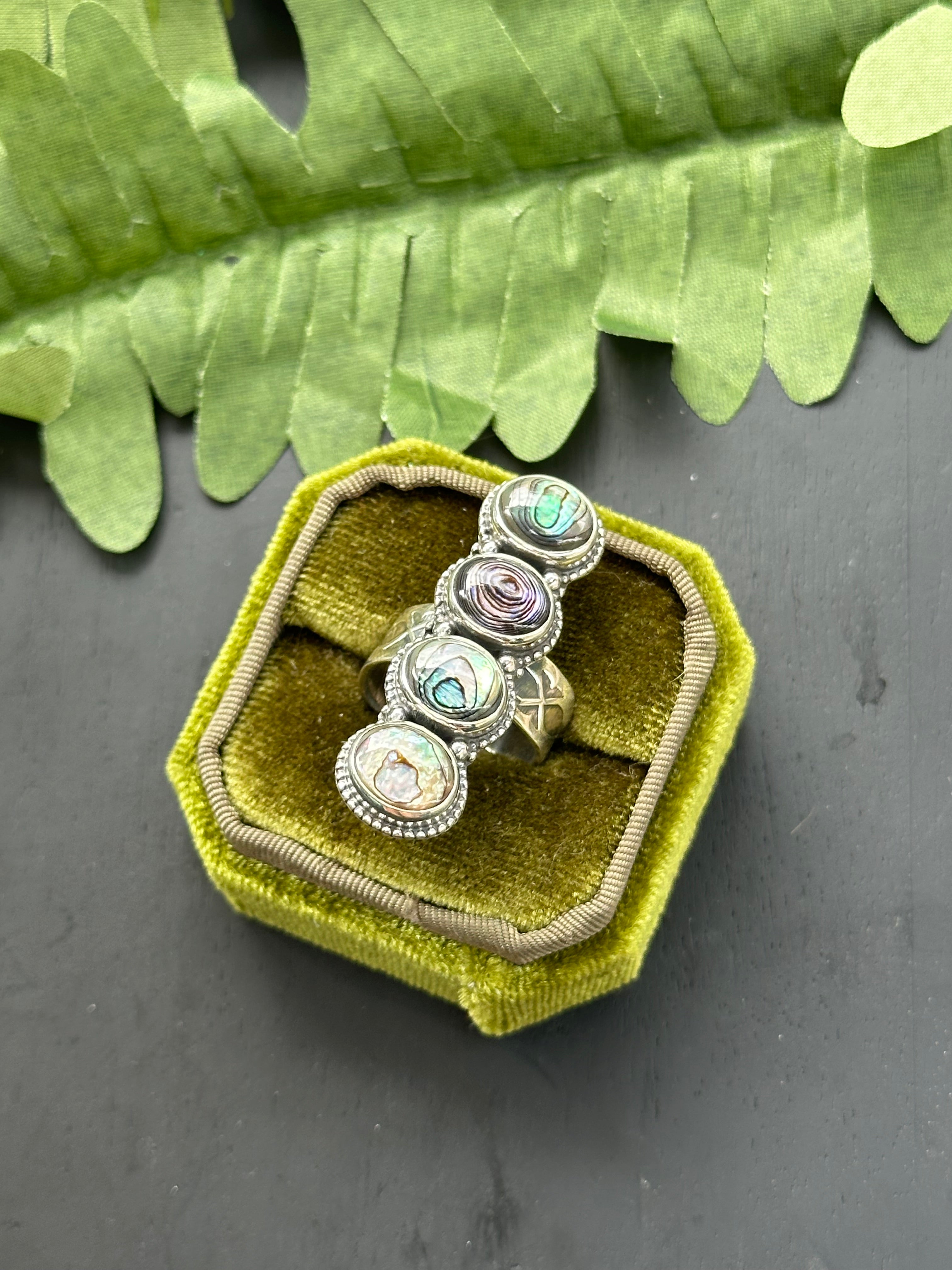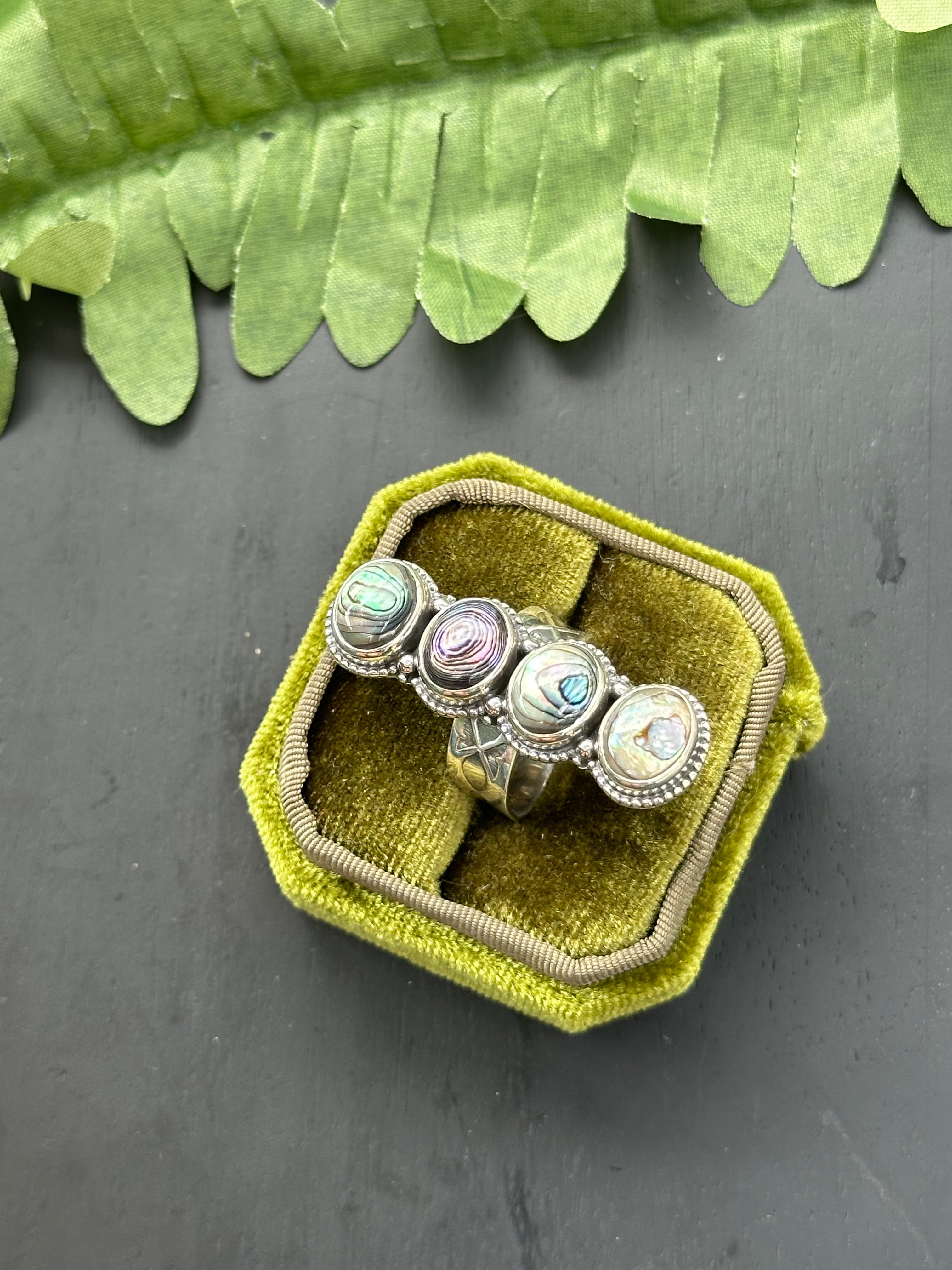 Navajo Made Abalone & Sterling Silver Adjustable Ring. It measures 1 5/8 inches long and 1/2 of an inch wide. Signed by the artist and stamped sterling silver.